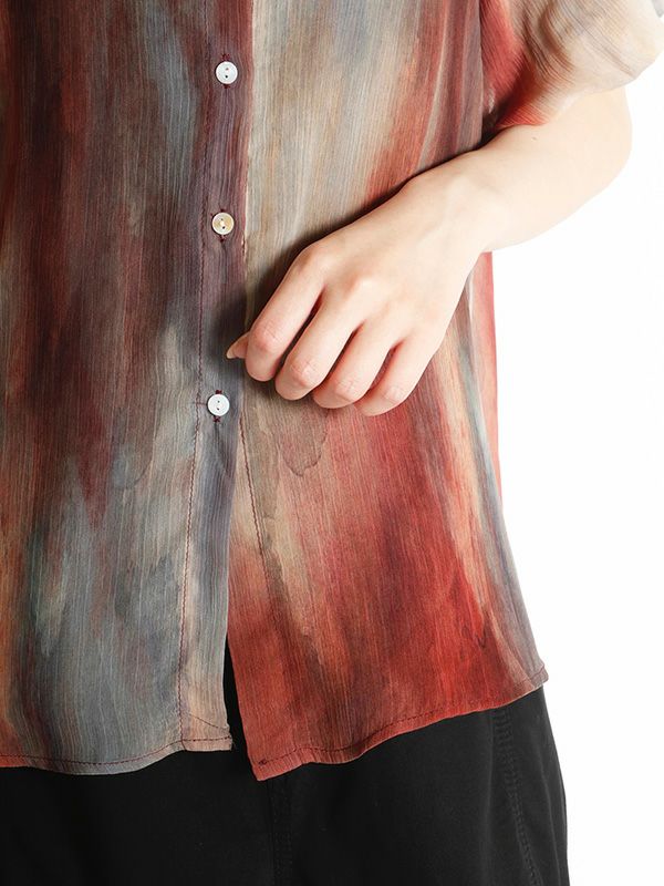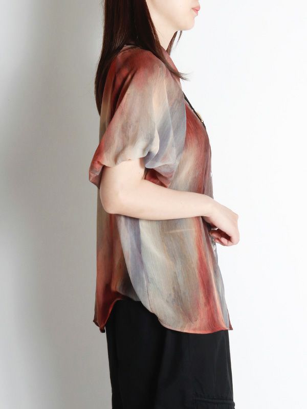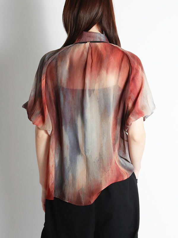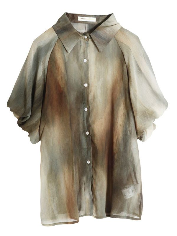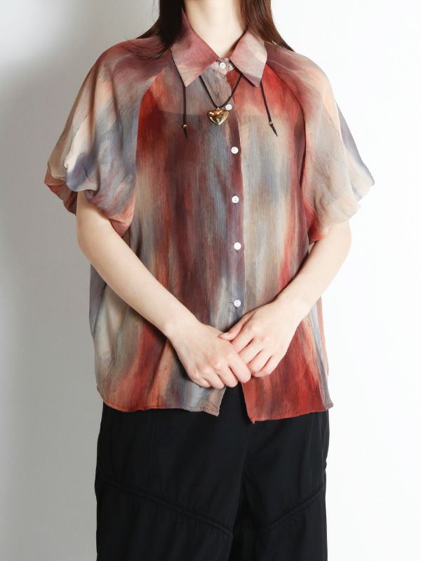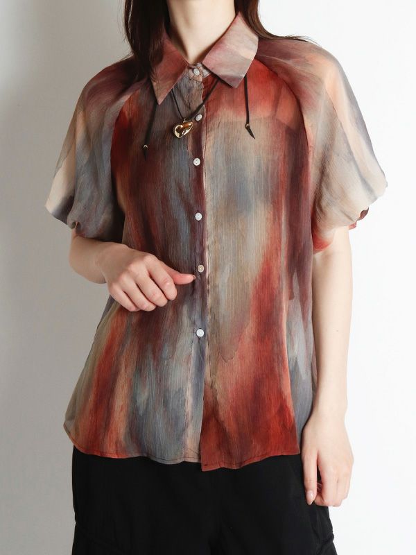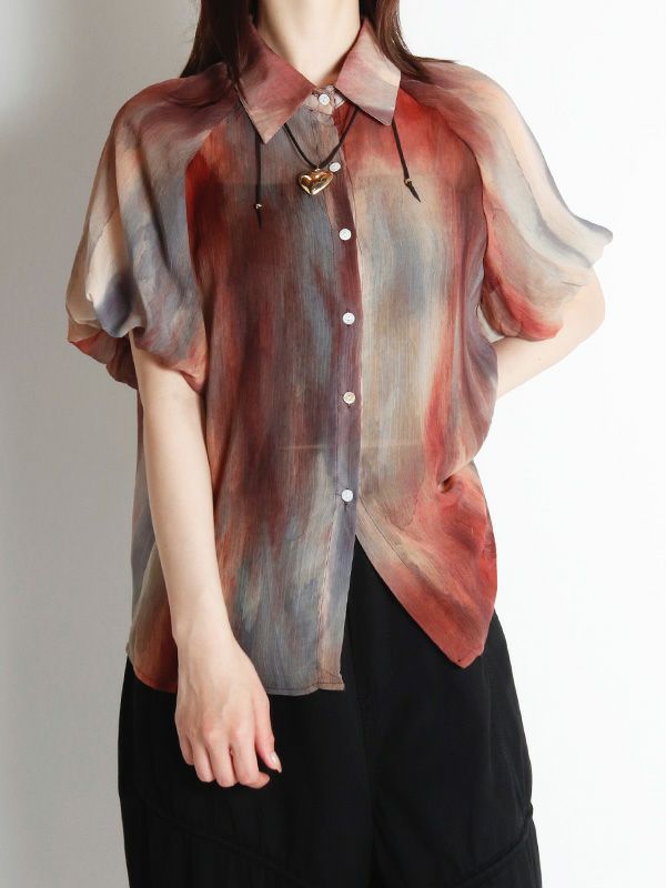 レトロな雰囲気のオンブレプリントのブラウス。袖のバルーンスリーブのディティールがさりげないポイントに。首元はシャツカラーでスッキリと仕上げ甘辛バランスに仕上げました。ボトムスインもアウトも可能で幅広いスタイリングにマッチ。レディなスカートからきれいめワイドパンツ、サロペットやジャンパースカートのインナーにと様々なシーンで存在感を放ちます。デニムパンツにさらりと合わせたカジュアルコーデもおすすめです。