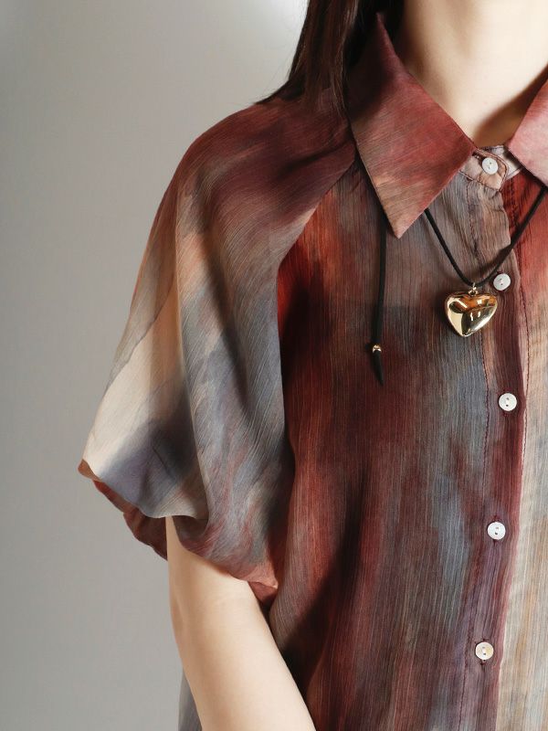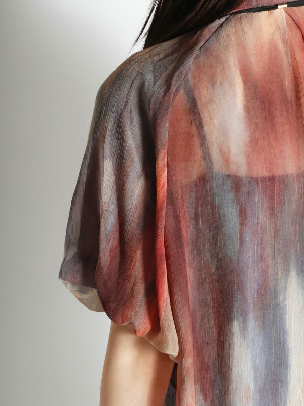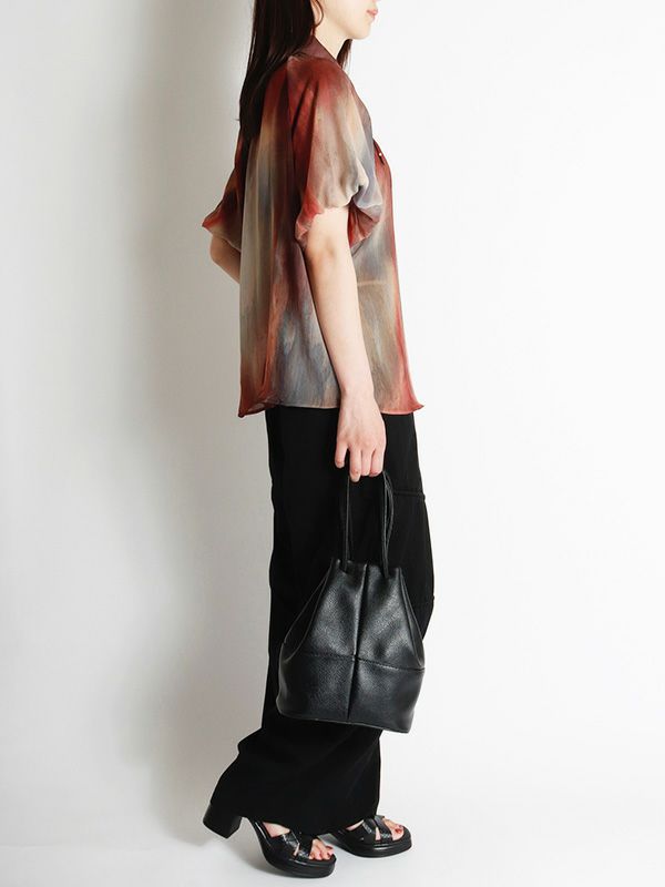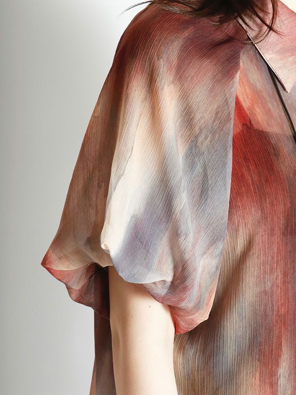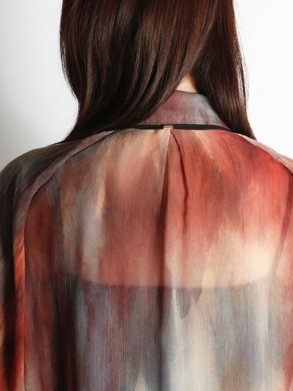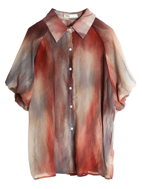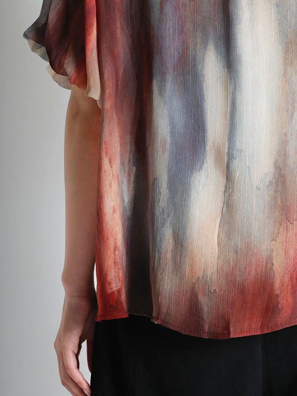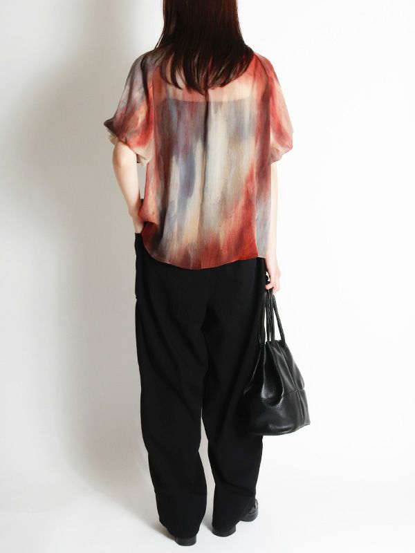 レトロな雰囲気のオンブレプリントのブラウス。袖のバルーンスリーブのディティールがさりげないポイントに。首元はシャツカラーでスッキリと仕上げ甘辛バランスに仕上げました。ボトムスインもアウトも可能で幅広いスタイリングにマッチ。レディなスカートからきれいめワイドパンツ、サロペットやジャンパースカートのインナーにと様々なシーンで存在感を放ちます。デニムパンツにさらりと合わせたカジュアルコーデもおすすめです。