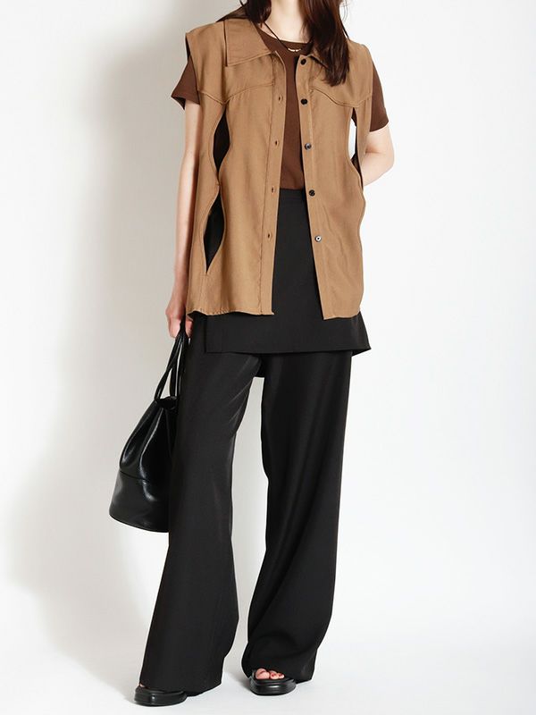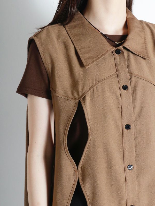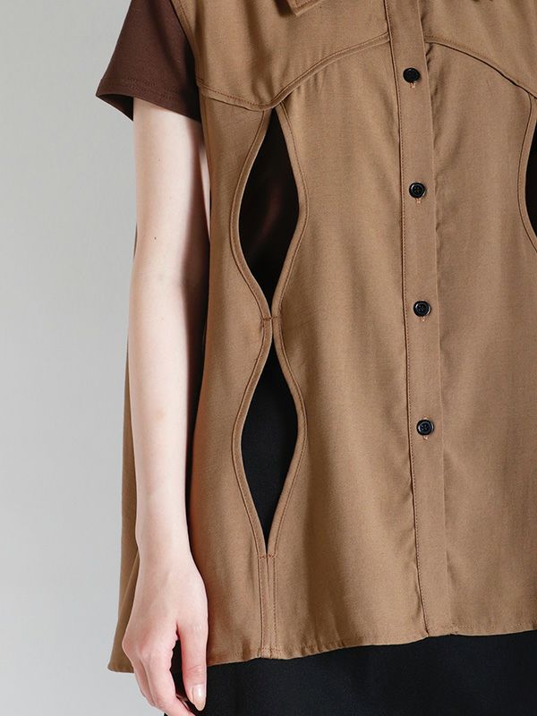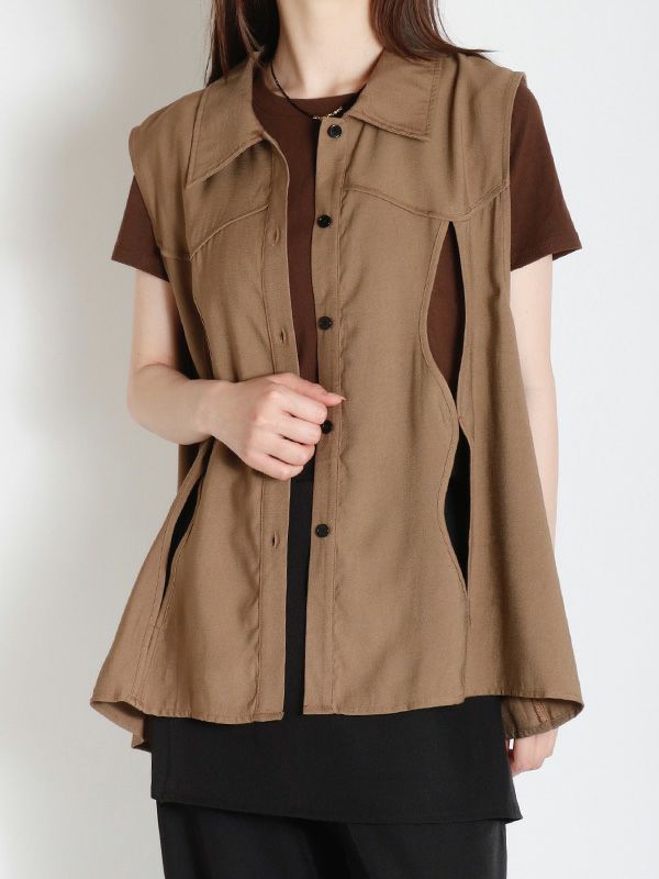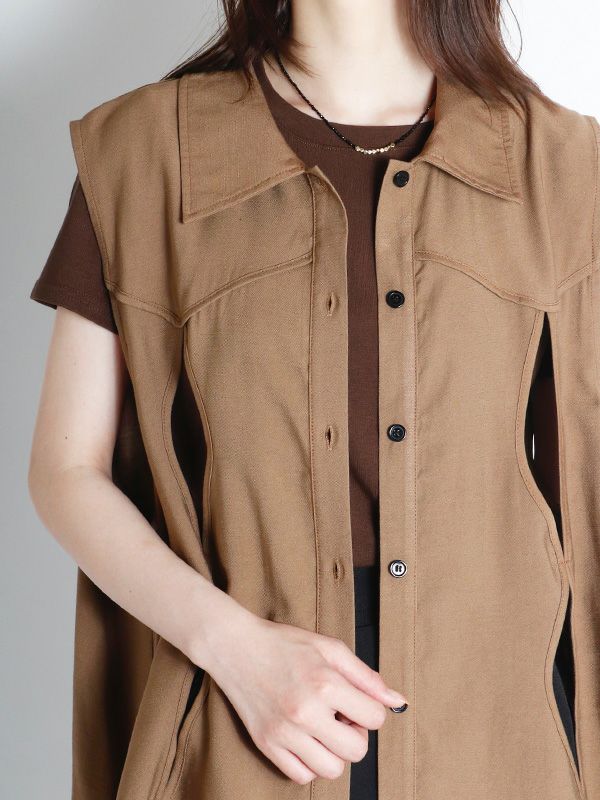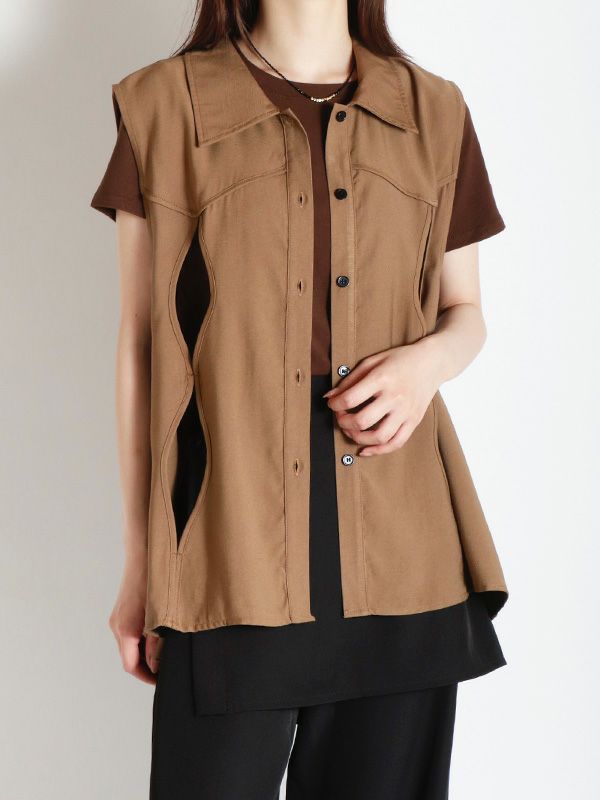 デザイン性の高いノースリーブシャツ。身頃の大胆なカットデザインとウエスタンヨークが他にはない個性のあるスタイルを演出します。ゆったりとした身幅なのでサラッと単品使いで着用していただくのはもちろん、前開きでベストとしても活用でき長袖のカットソーやTシャツとのレイヤードスタイルもおすすめです。様々なコーディネートにマッチし、春先から秋口まで、ロングシーズン着回しを楽しめます。