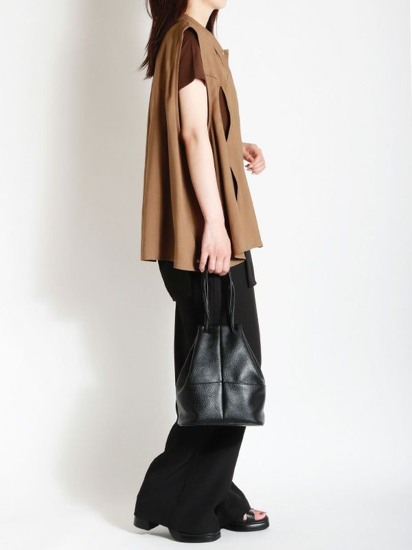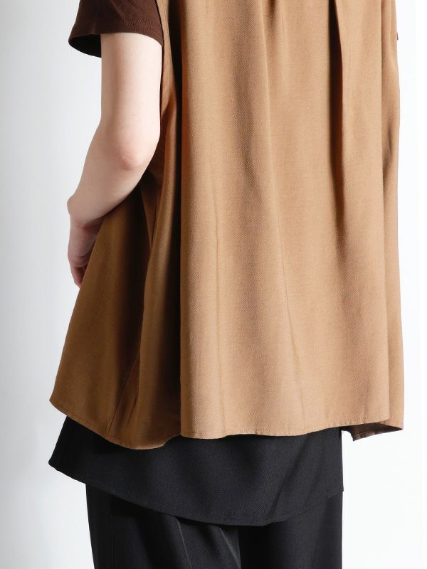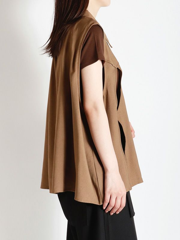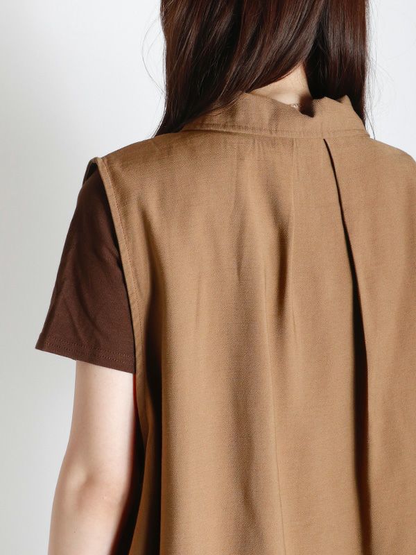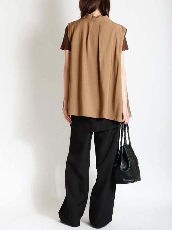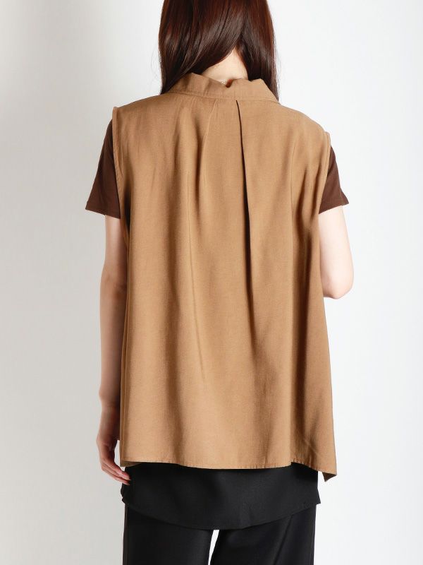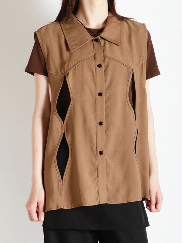 デザイン性の高いノースリーブシャツ。身頃の大胆なカットデザインとウエスタンヨークが他にはない個性のあるスタイルを演出します。ゆったりとした身幅なのでサラッと単品使いで着用していただくのはもちろん、前開きでベストとしても活用でき長袖のカットソーやTシャツとのレイヤードスタイルもおすすめです。様々なコーディネートにマッチし、春先から秋口まで、ロングシーズン着回しを楽しめます。