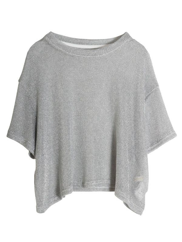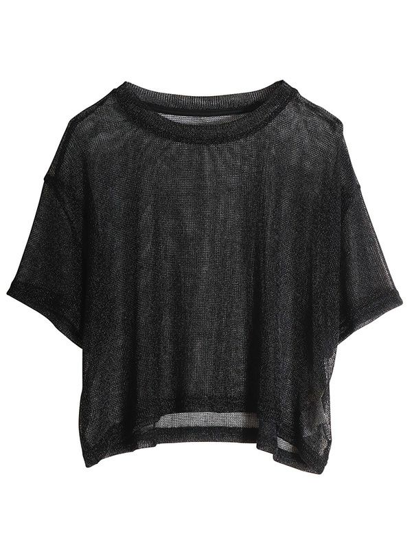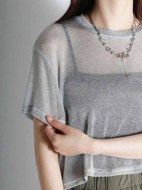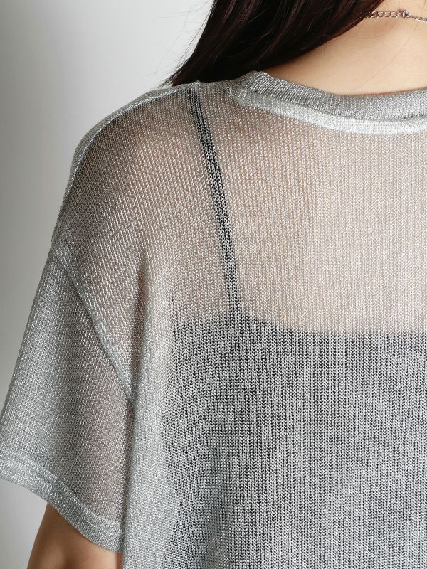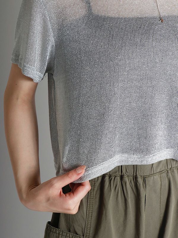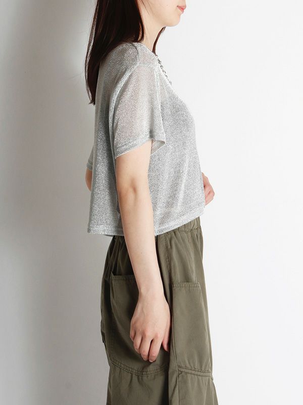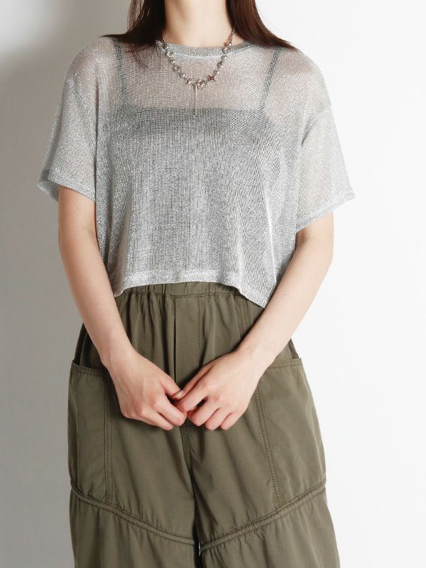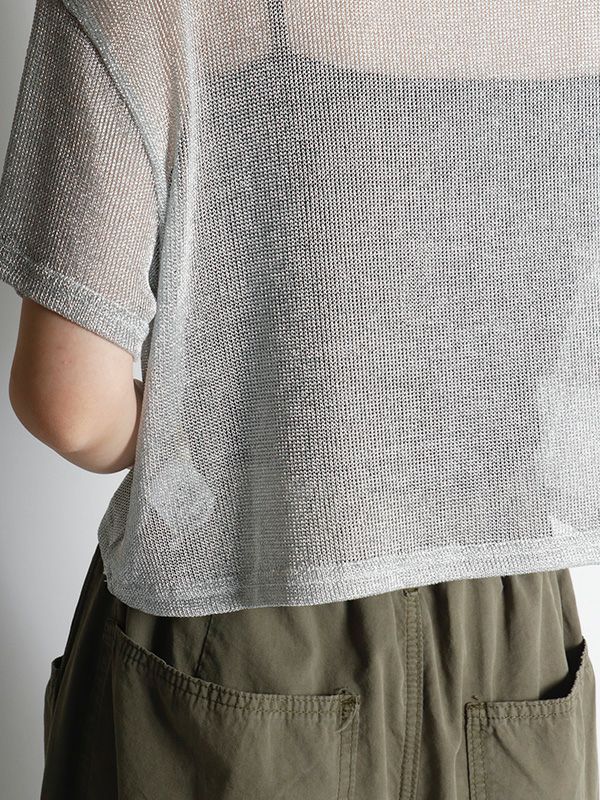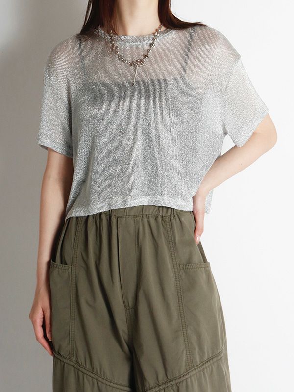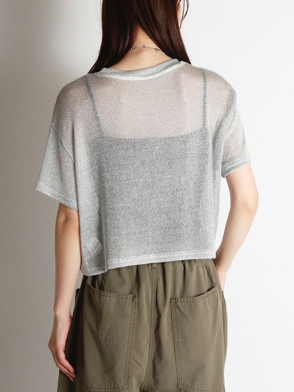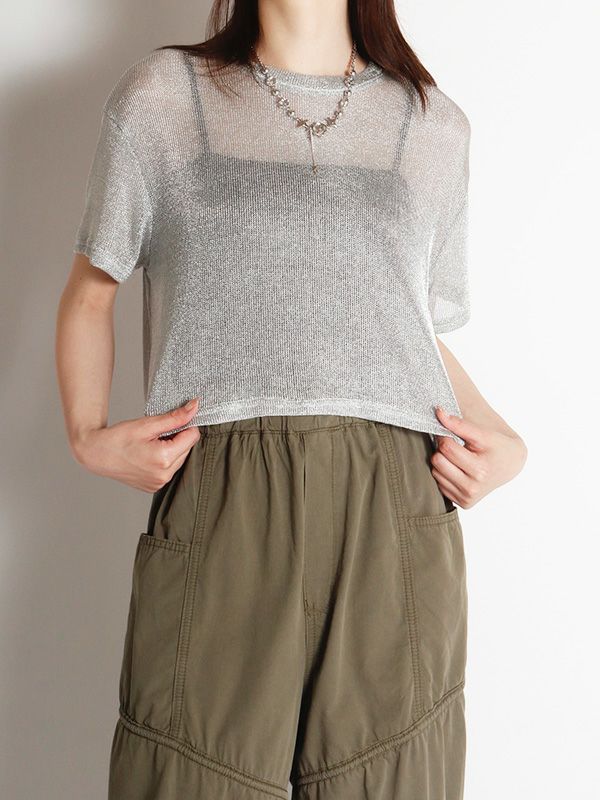 透け感のあるラメトップス。コンパクトな着丈、透け感、キラッと光沢のあるラメ糸など1枚で着てもトレンド感の高いアイテムです。すっきりとした着丈で、コンパクトなシルエットも特徴。身体のラインに程よくフィットしながらも、窮屈さを感じさせない絶妙なサイズ感です。ON、OFFどちらでも着回しができ幅広いコーディネートをお楽しみいただけ、シンプルな大人のレイヤードスタイルにピッタリのトップスです。