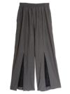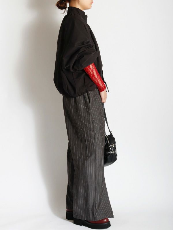 センタースリットから覗くレースがポイントのワイドパンツ。ピンストライプ柄の生地を使用しているためマニッシュな印象ですが、相反するレースを合わせたことで今季のムードを表現しています。歩いたり動くたびにレースがのぞく大人っぽいデザインです。ブラックとグレーストライプの2色展開で、レース部分は両色ともブラックを使用しました。カットソーやスウェットに合わせてカジュアルダウンも楽しんでいただけるパンツです。
