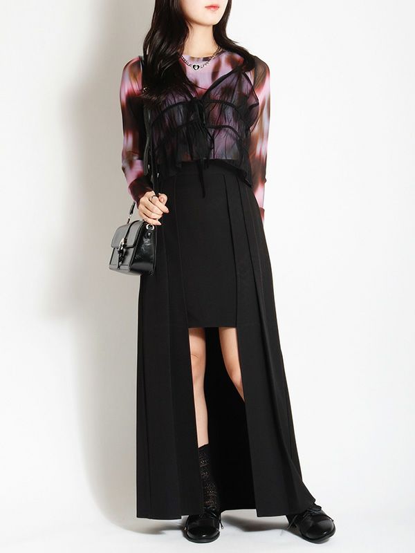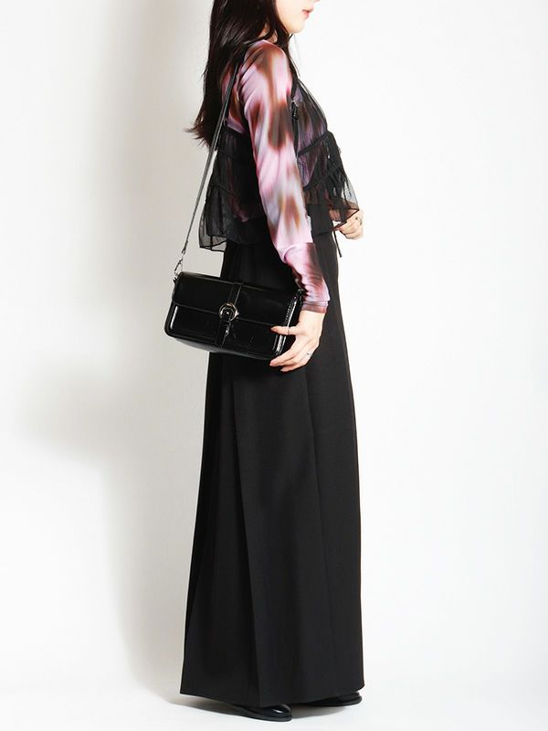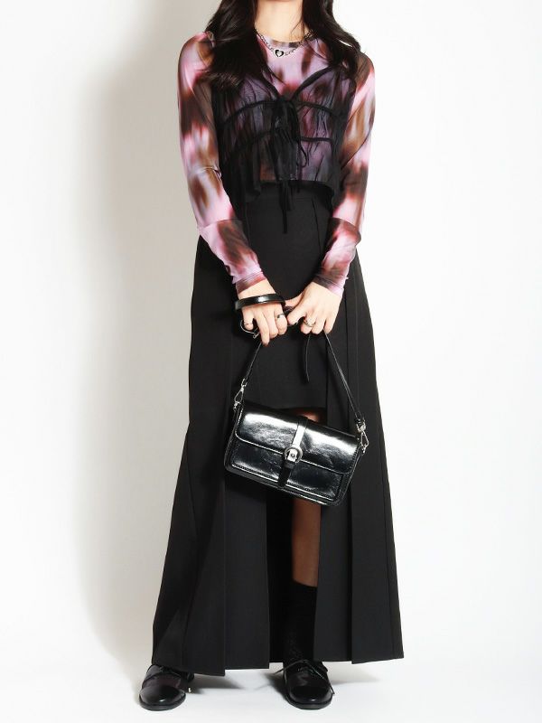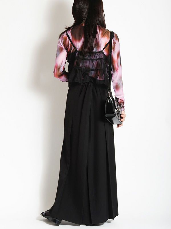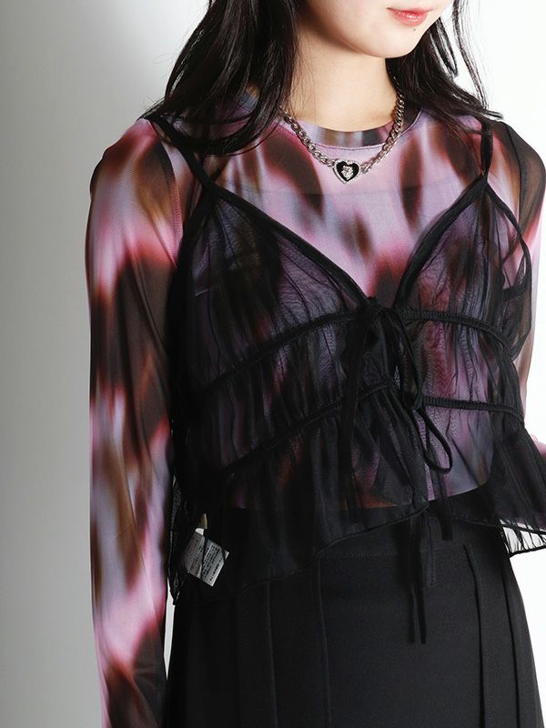 表情豊かなデザインのビスチェ。ティアードデザインxギャザーを寄せることで、フリルのような愛らしいディテールを演出しています。フロントは2連のリボンを結ぶ仕様で、着こなしのアクセントに。透け感のあるチュール素材なので、重ねるインナー次第で着こなしの変化が楽しめます◎。TシャツやロンTなどにさらっとレイヤードするだけで、こなれた重ね着スタイルが完成します。