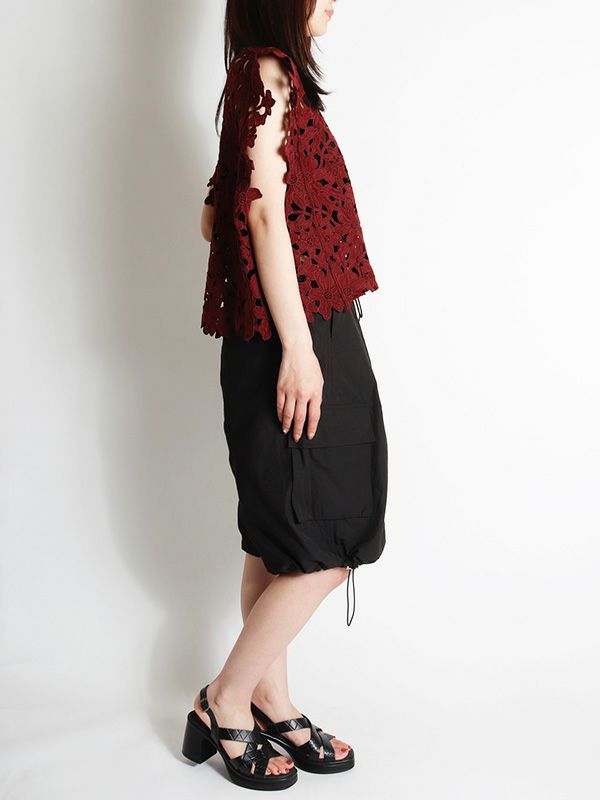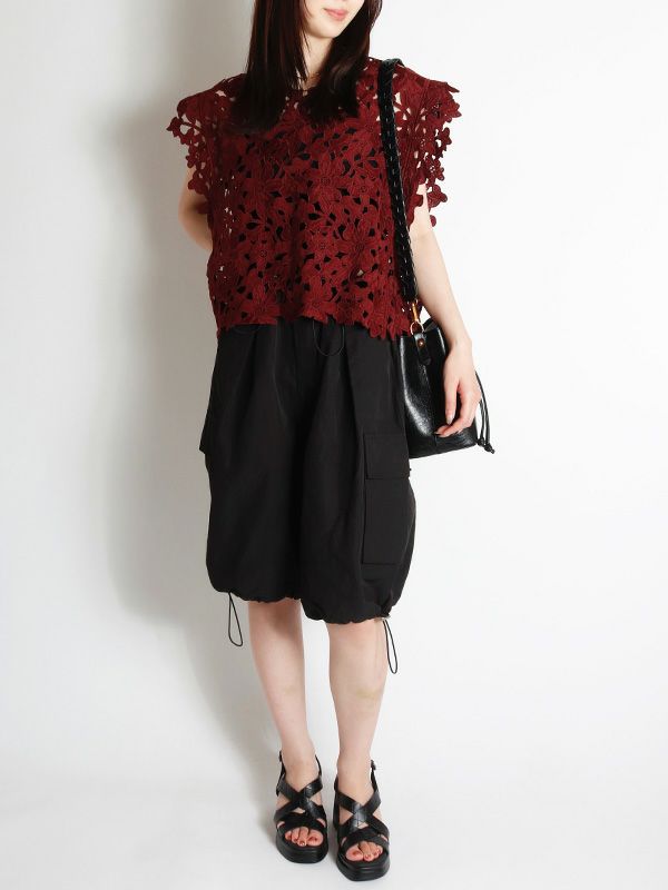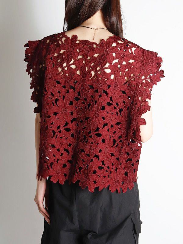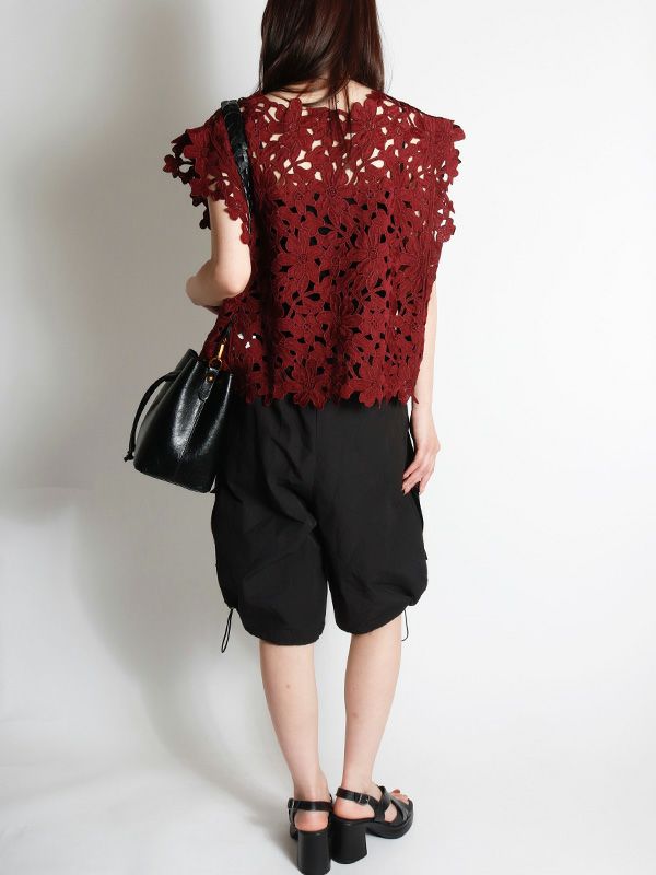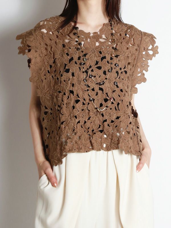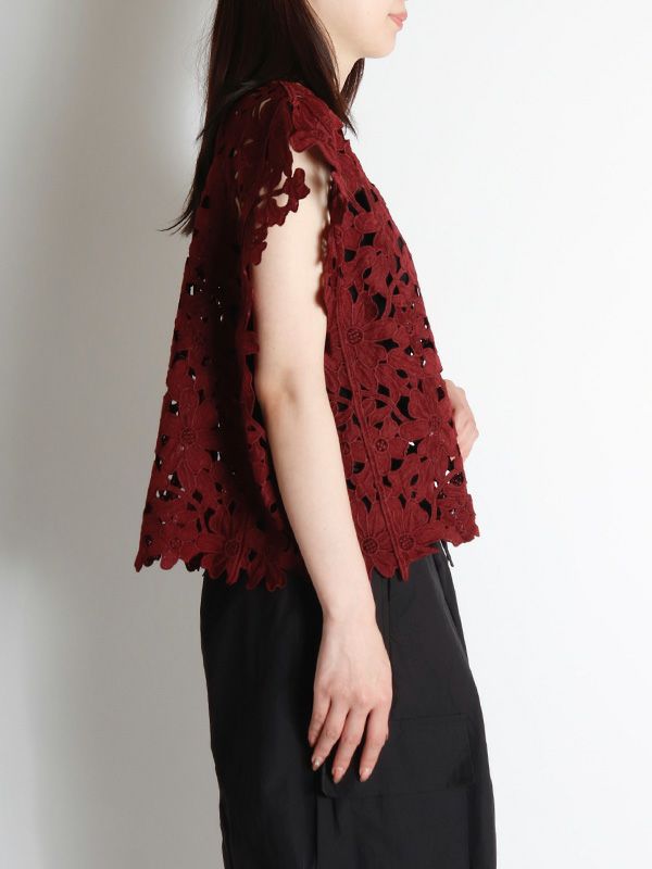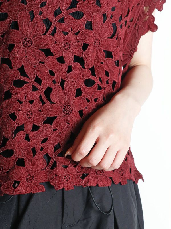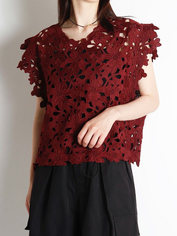 カットワークが特徴のボクシーシルエットブラウス。シンプルながらも生地のデザインが際立ち、華やかさを演出します。程良くゆとりがあり、大き過ぎずきちんと感のあるサイズです。1枚ではもちろん、インナーとしても活躍する着回し力の高いアイテムです。カジュアルなボトムスと合わせれば、程よく上品なミックススタイルに。きれいめなボトムと合わせれば、オフィスやパーティーシーンにもマッチ、ブラウスのデザインが引き立つエレガントな装いになります。