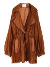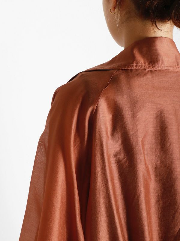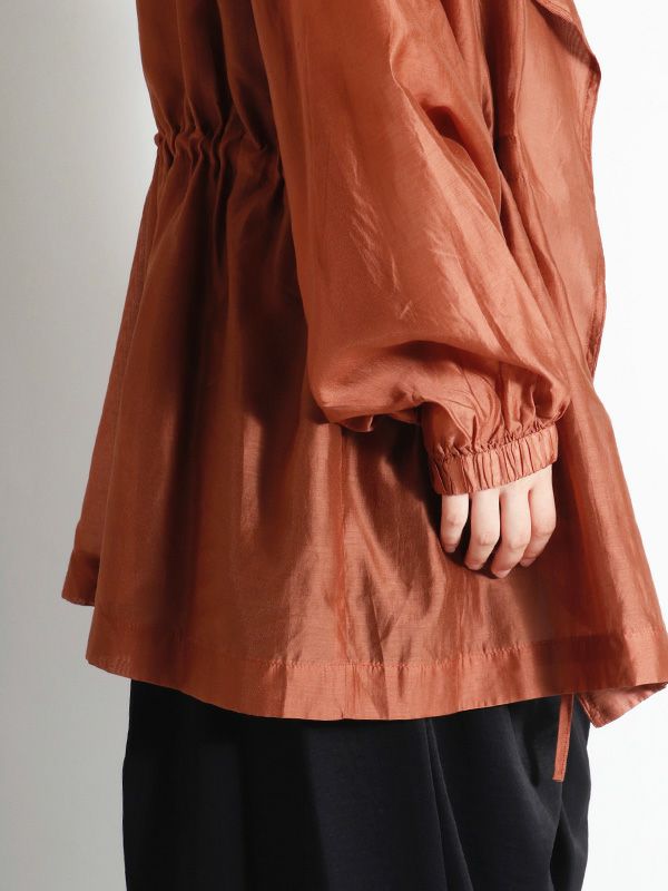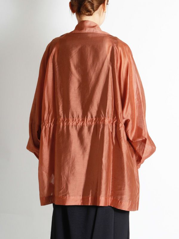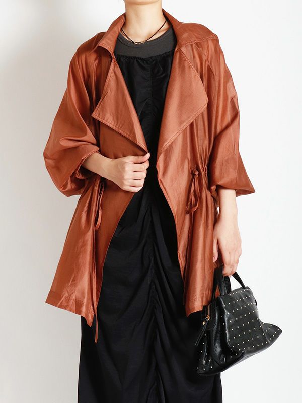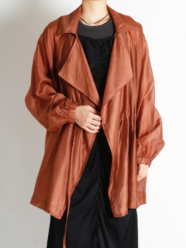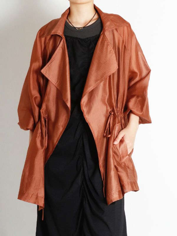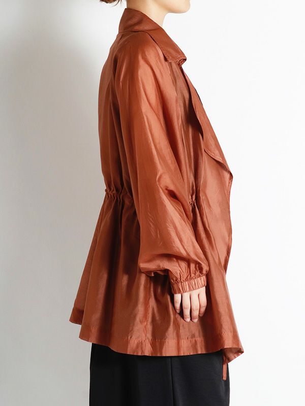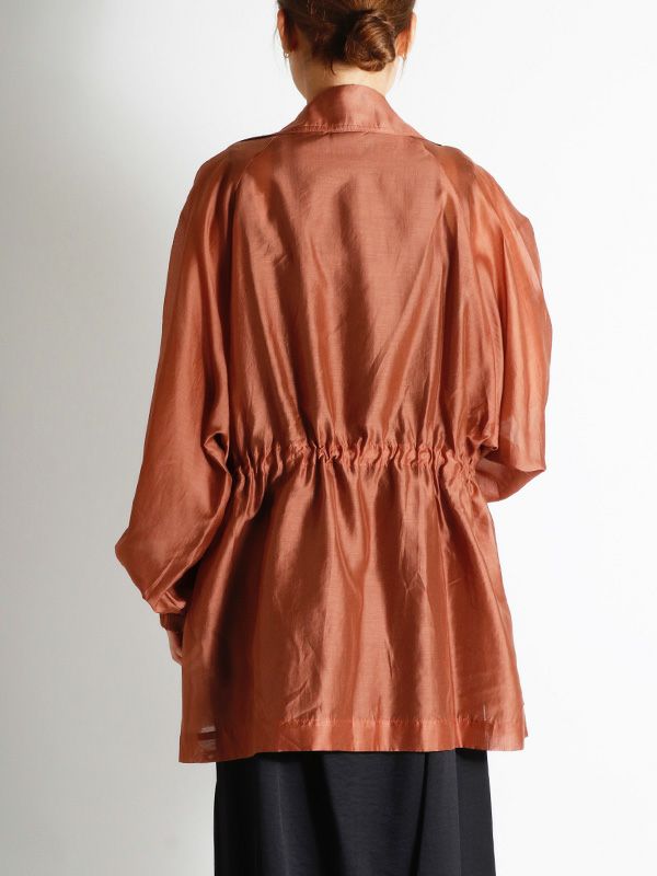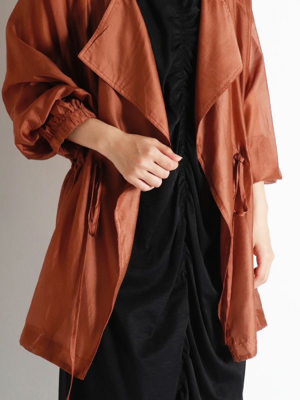涼しげなシアー素材を使用したショートトレンチデザインのシアージャケット。 程よい透け感と、軽やかな着心地です。ウエストにドロストでシルエットを調整できるディテールを入れて、メリハリのある着こなしが叶う女性らしいデザインです。どこかセンシュアルな雰囲気で大人っぽいデザインがいつものスタイルに羽織るだけで、ジャケットスタイルをトレンドライクに格上げしてくれます。 スカートにもパンツにも合わせやすく、様々なテイストの着こなしにマッチするジャケットです。
