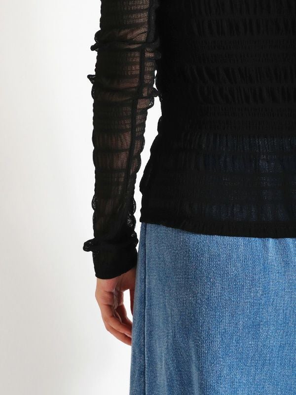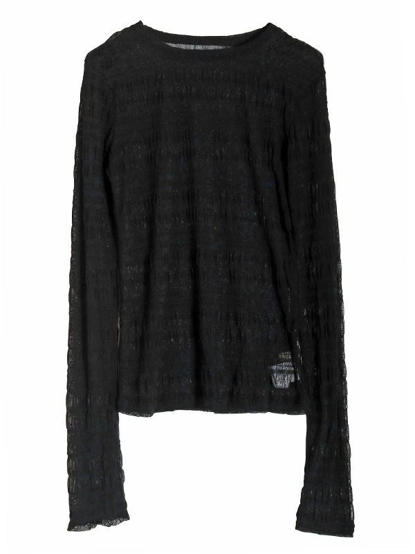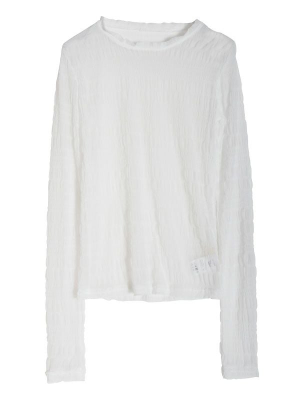 透け感のある柔らかな素材が心地よいロングスリーブTシャツ。 ミニマルなデザインながら、表面の立体感のあるシャーリングが効いてレイヤードスタイルを引き立てます。心地の良いフィット感で、女性らしい美シルエットを叶えます。コーディネート 1枚で着てもビスチェやシャツとレイヤードしたコーディネートもおすすめ。シンプルなデザインで幅広いスタイリングに映えるアイテムです。