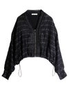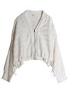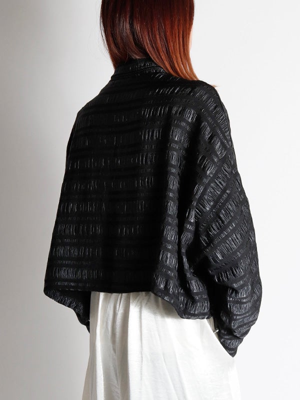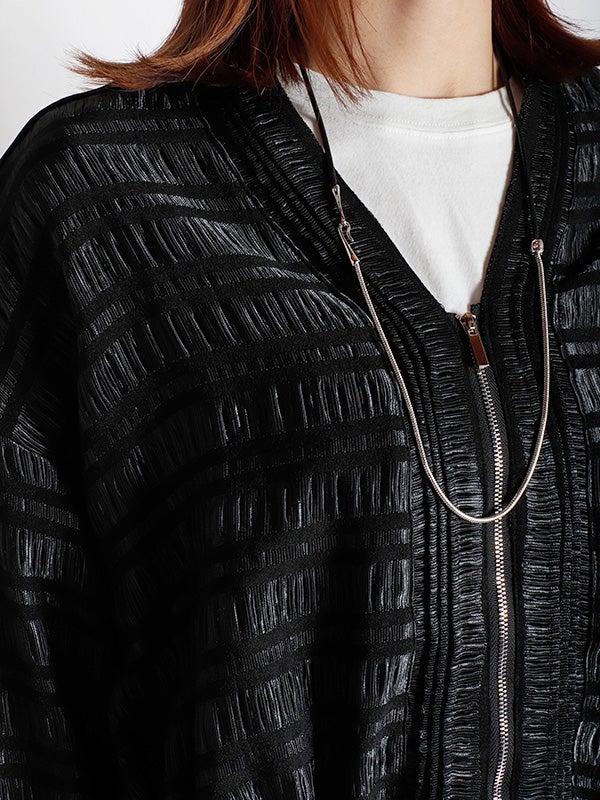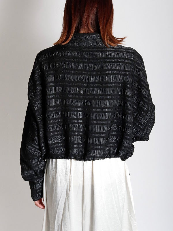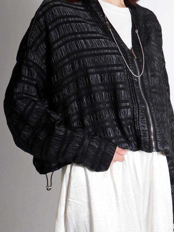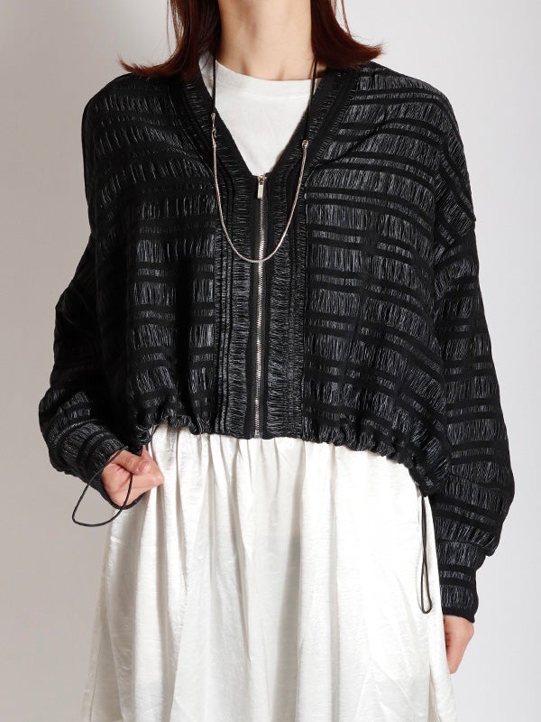 サテン調のラインデザインが目を惹くクロップドブルゾン。 シャープなVネックとコンパクトな丈感がスタイリングに軽さとバランスをプラスし、ワイドパンツやスカートとも好相性です。 フロントジップでラフに羽織れる気軽さもありながら、ミニマルなデザインでどこかモードな印象に。 裾のドローコードでシルエット調節が可能です。 シンプルなコーディネートにさっと取り入れるだけで、今っぽいシルエットが完成します。 デイリーに取り入れやすく、スタイリングの幅を広げてくれる一着です。