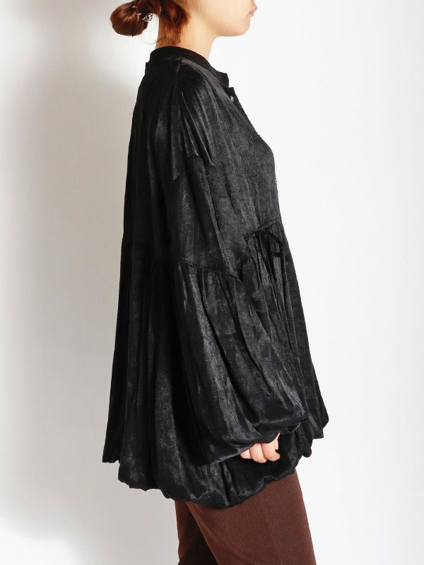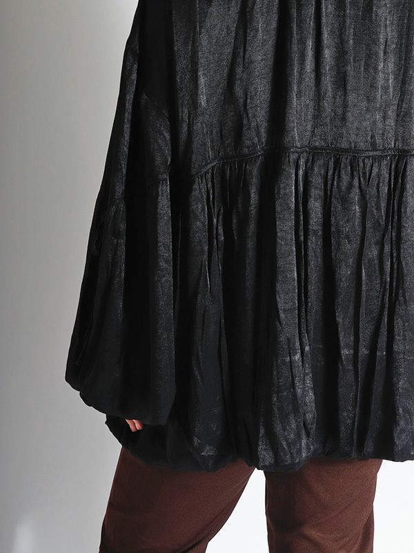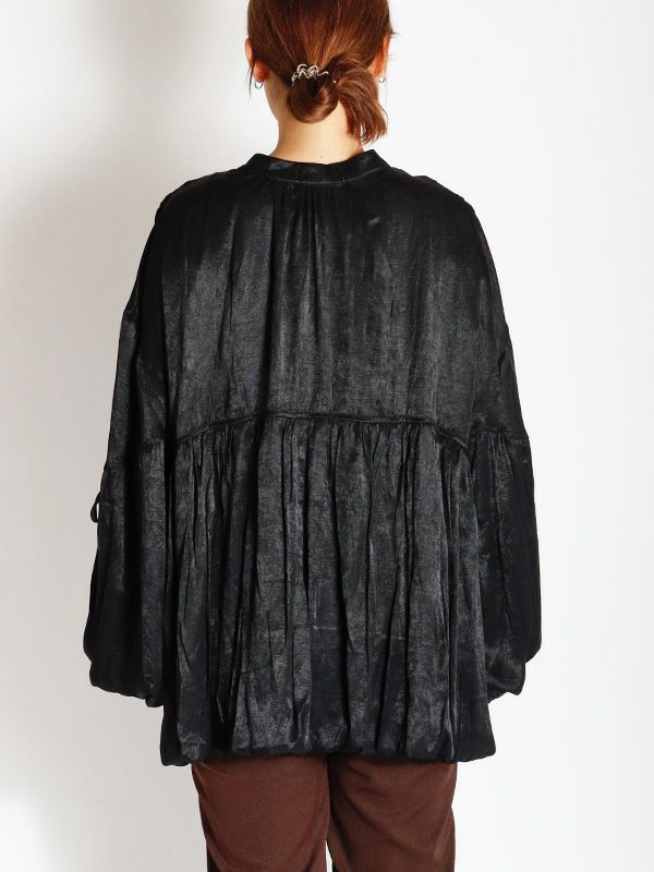 身頃と袖を大胆にバルーンシルエットに切り替えた、表情豊かなデザインブラウス。本体はサテンを思わせるリッチな光沢感のある生地で、エレガントで高級感のある雰囲気を演出。大胆なバルーンデザインがモードな魅力を引き立てるドラマティックなデザインです。存在感のあるブラウスなので、ボトムスはシンプルにまとめるのがおすすめ。デニムと合わせれば、甘さと辛さの絶妙なバランスが取れた、遊び心のあるミックススタイルに。洗練された大人の着こなしが叶うブラウスです。