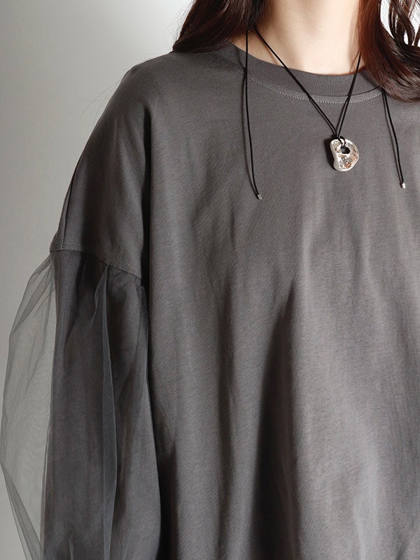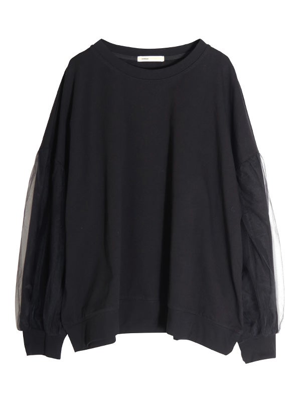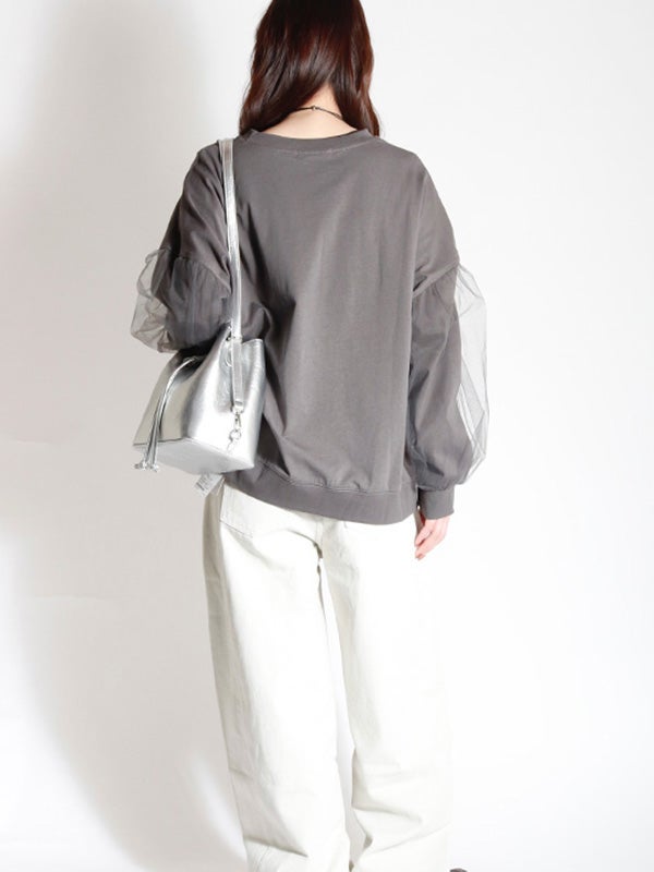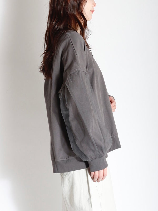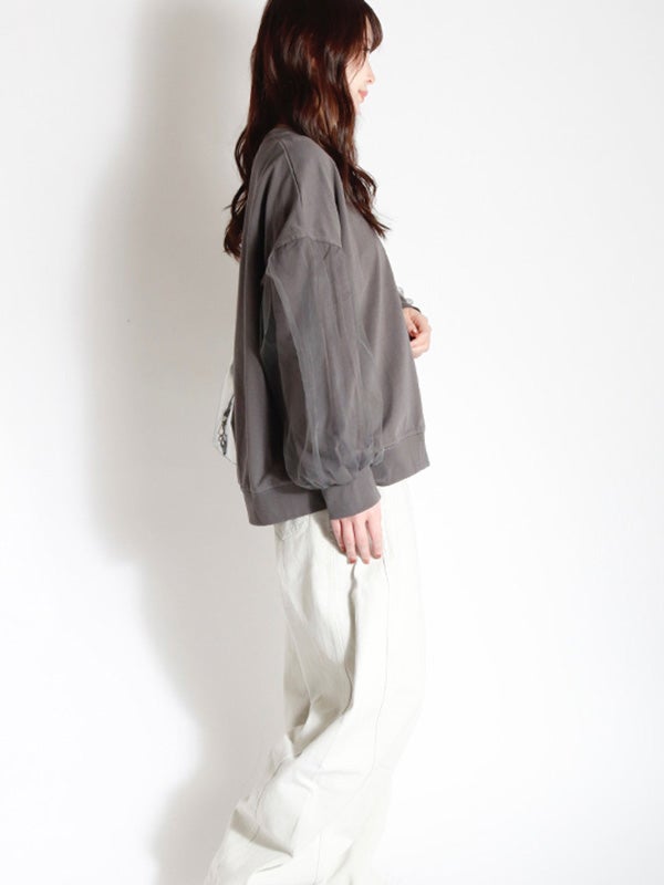 ハリのあるオーガンジーと上品なスウェットカットソーの異素材使いが目を惹くプルオーバーが登場。 スウェット生地の上から重ねているので肌の露出を気にせず上品に着こなせます。 甘すぎない同色オーガンジーで洗練された雰囲気です。タイトスカートやテーパードパンツにタックインして、洗練されたフェミニンスタイルに。 カラーデニムやミニボトムと合わせることで、旬なフェミニンなカジュアルスタイルなど、幅広い着こなしをお楽しみいただけます。