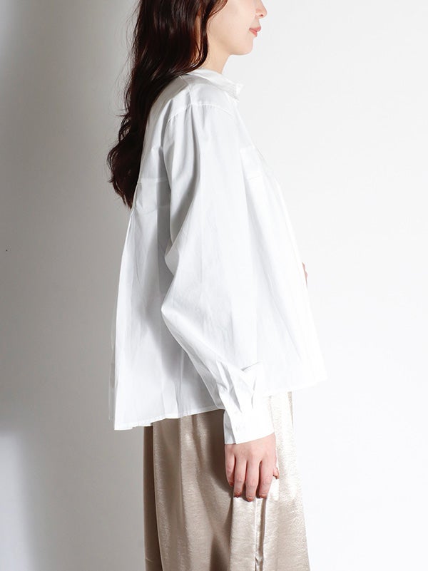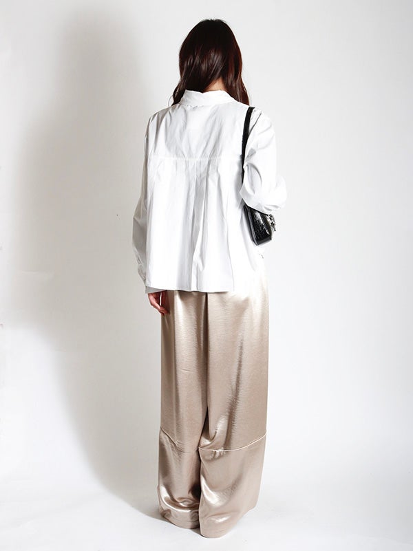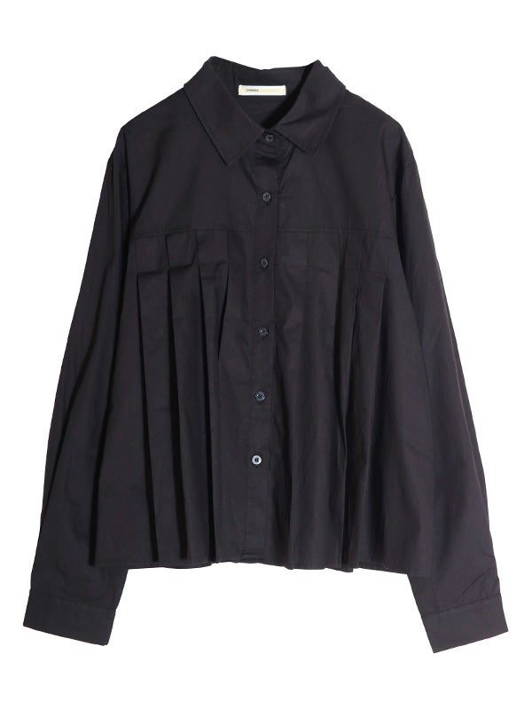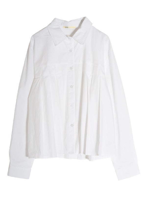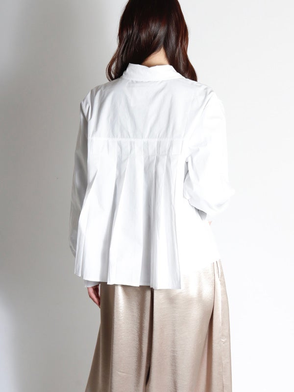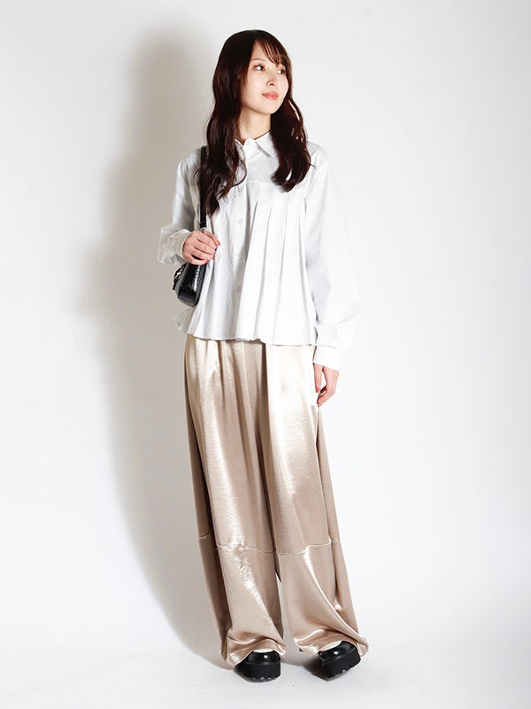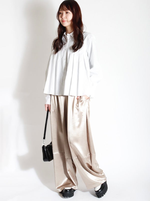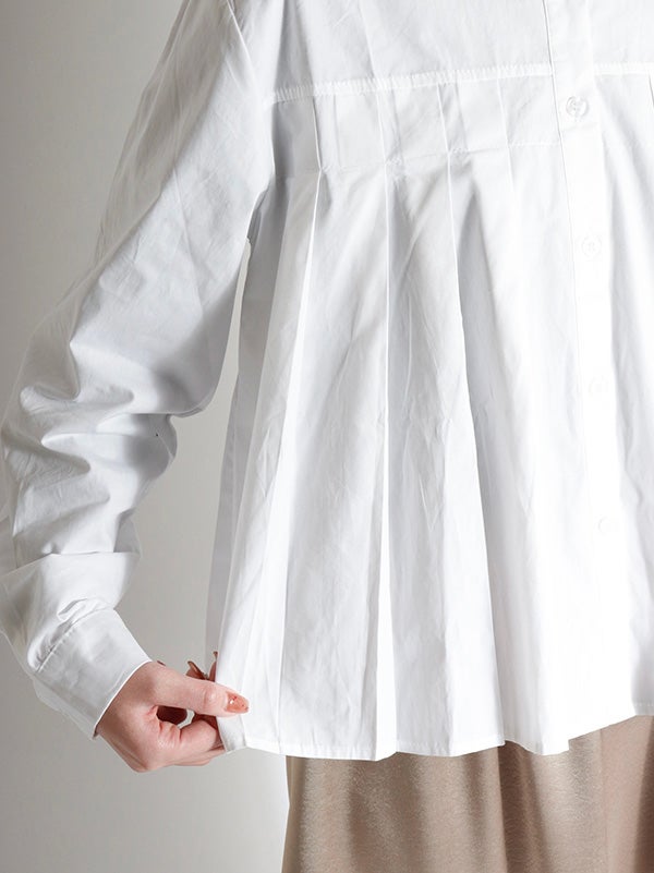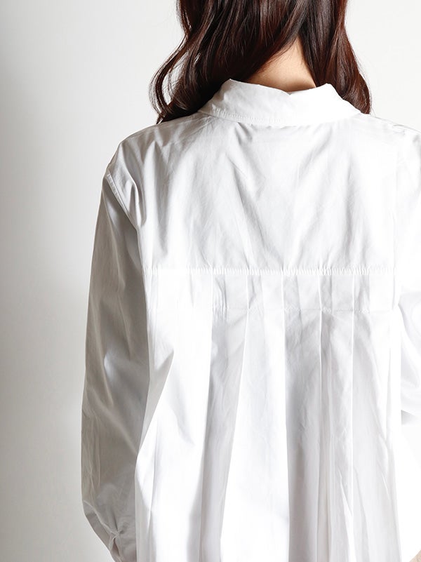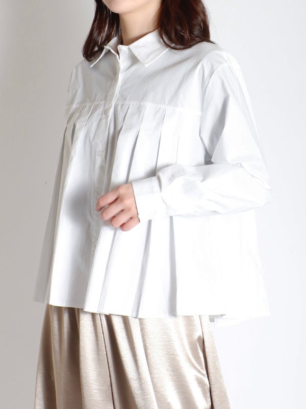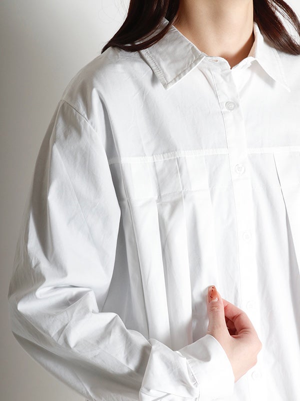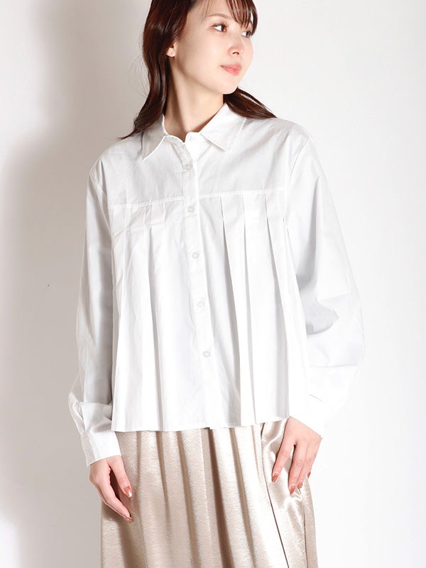 腰ほどのショート丈のシャツに、ふんわりとしたプリーツデザインをあしらったデザイン。甘くなりすぎないように、プリーツの分量を調整し、ほどよいボリューム感に仕上げました。身幅がゆったりしていながら、コンパクトな丈感でバランスの取りやすいアイテムです。ボリュームスカートやワイドボトムとの相性も抜群です。ハイウエストのボトムスと合わせることで、一気にトレンド感のある大人カジュアルスタイルにアップデート。
