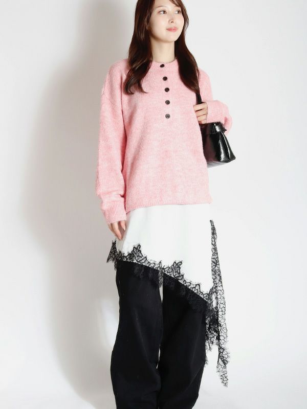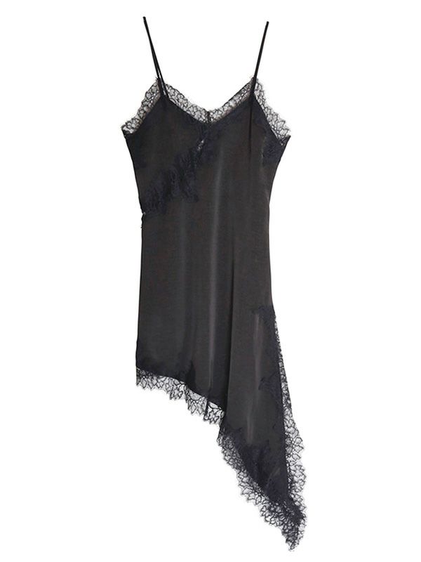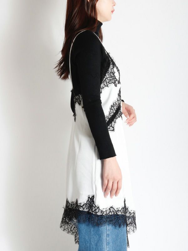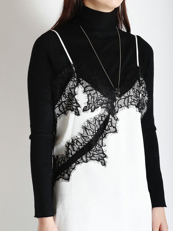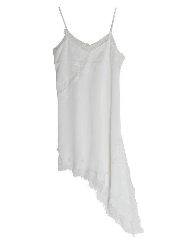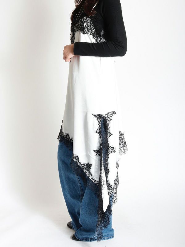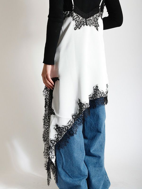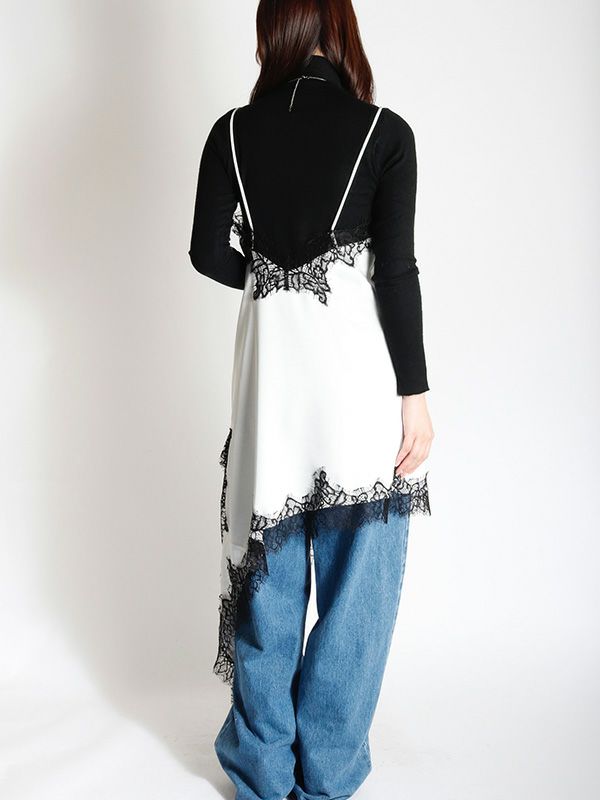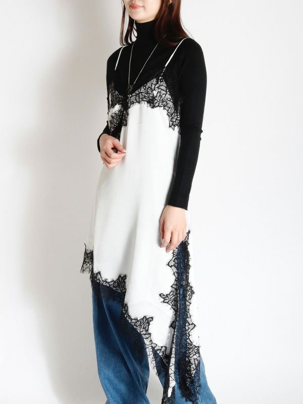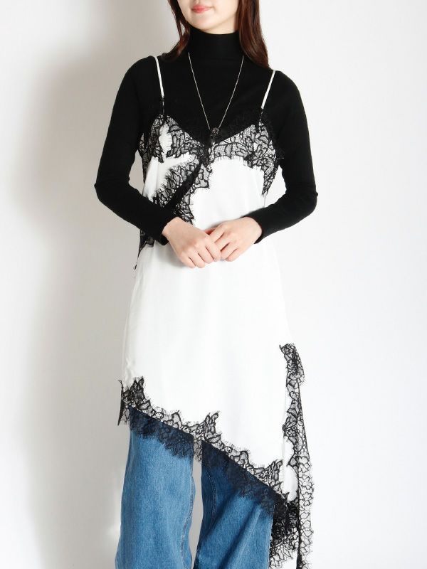 上品なレースをあしらった、キャミワンピース。華奢なストラップと繊細なレースが女性らしさを引き立てます。裾はアシンメトリーなデザインになっており、動くたびに軽やかな印象を与えます。Tシャツやニット、タートルネックなど、合わせるトップス次第で様々な表情を見せてくれます。デニムやスラックスを合わせて、カジュアルダウンしたコーディネートもおすすめ。レイヤードスタイルの幅を広げる1着です。