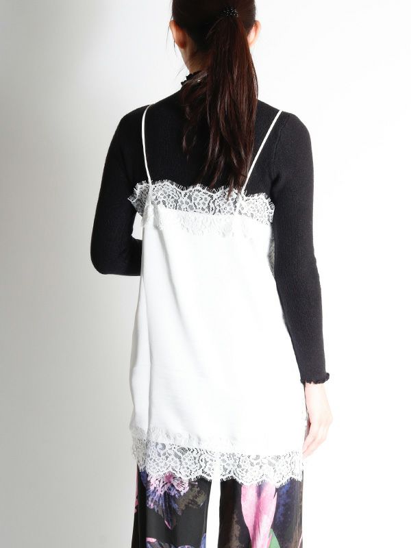 ランジェリーのディティールをイメージした、キャミソールトップス。華奢なストラップと繊細なレースが女性らしさを引き立てます。幅広いムードに対応するので、旬なニュアンスを取り入れたコーディネートが楽しめます。Tシャツやスウェット、ニットやタートルネックなど、合わせるトップス次第で様々な表情を見せてくれ、インナー使いの場合は裾からレースを覗かせる着こなしもおすすめです。レイヤードスタイルの幅を広げてくれるキャミソールです。