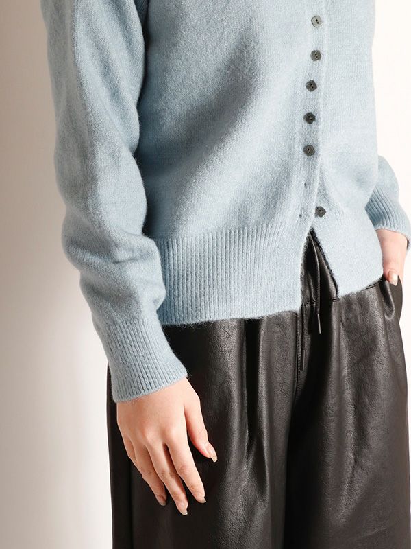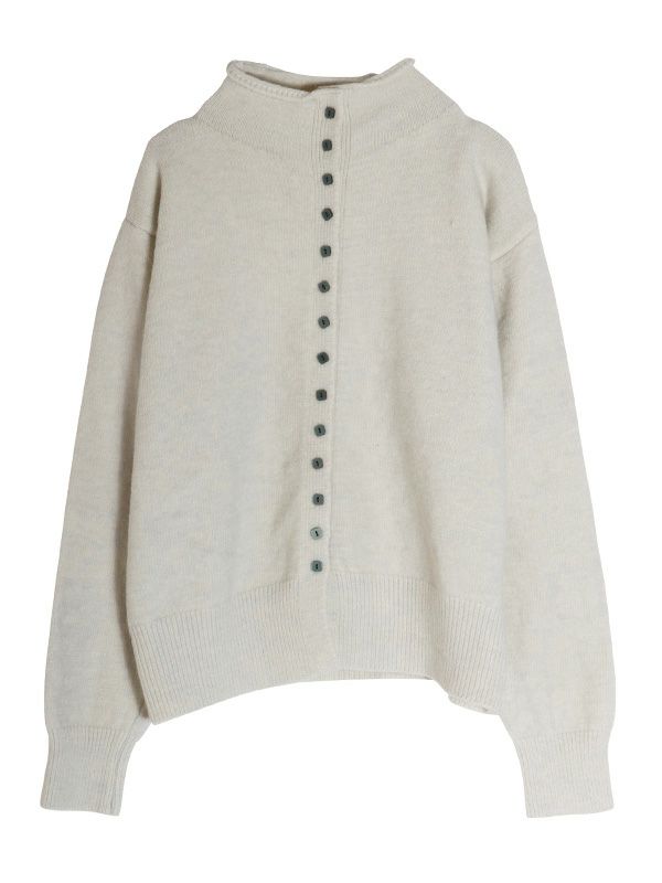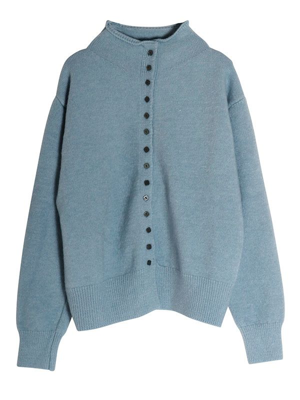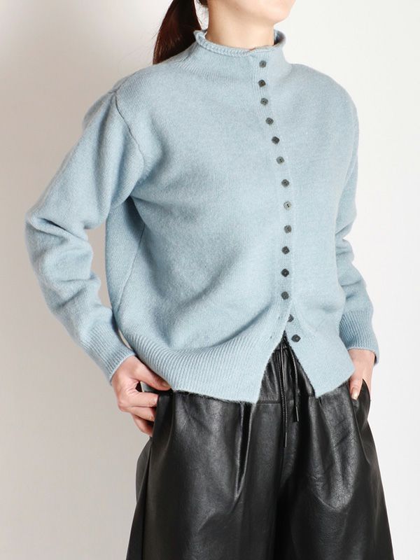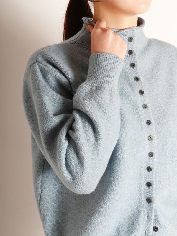 小粒なスクエア型の14個あしらわれたボタンディティールが特徴のカーディガン。コンパクトなハイネックでクラシックな表情とモダンなエッセンスが融合したデザインが印象的な1枚です。カーディガンとしてはもちろんボタンディティールを活かしたハイネックニットとして着ると、スタイリングがグッとオシャレになります。腰ほどの着丈で、ワイドシルエットボトムやワンピースとも好相性。パンツスタイルからスカート、ワンピースまで、幅広いアイテムにマッチし着回し力も抜群です。