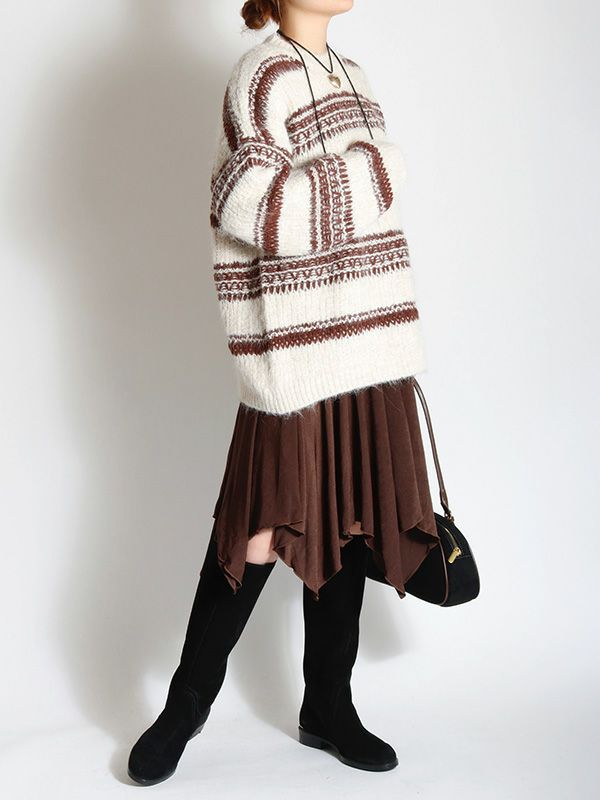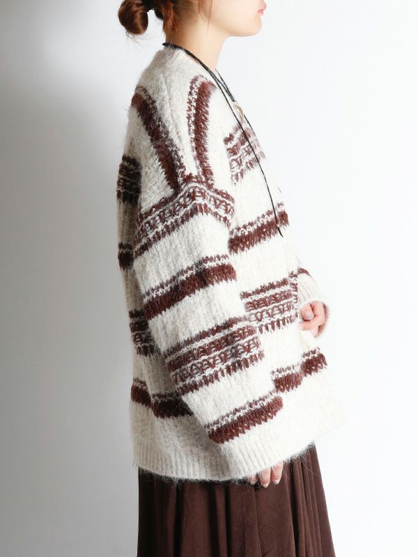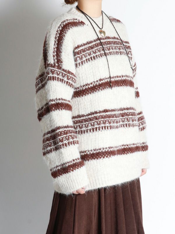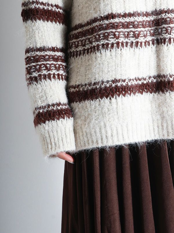 1枚で華やかに見えるジャガードのボーダー柄が特徴のニット。程よいボリューム感で柔らかい風合いとふっくらとしたシルエットからなるドロップショルダーのリラックスシルエットが、肩の力を抜いたこなれ感を演出。デニムやコーデュロイ素材のボトムスと合わせると、ナチュラルで優しい雰囲気にまとまります。レザーやスラックス系のボトムスと合わせれば、きれいめになりすぎない、こなれたカジュアルスタイルが完成。