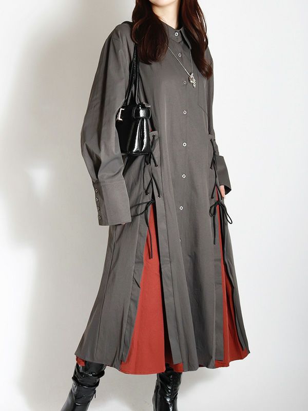 1枚でコーディネートが完成するワンピース。お好みのシューズを合わせるだけで、大人かわいく、格上げされたスタイルで着ていただけます。上品な落ち感の身頃に施したレースアップデザイン。その中から動くたびに映える配色のカラーブロックが印象的なシャツワンピースです。身体のラインを拾いすぎない、ゆとりのあるサイズ感。薄手のタートルインナーなどを合わせたり、前ボタンを開けて羽織りにするなどのレイヤードスタイルもおすすめで、ロングシーズン着て頂けます。