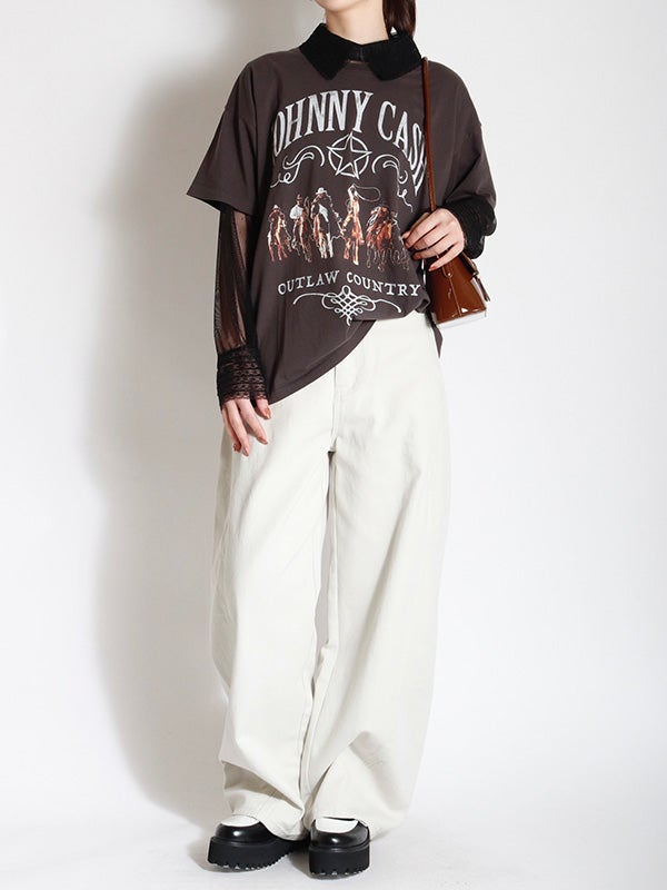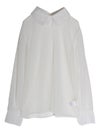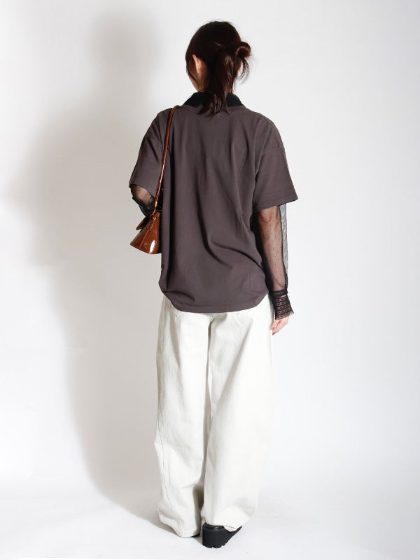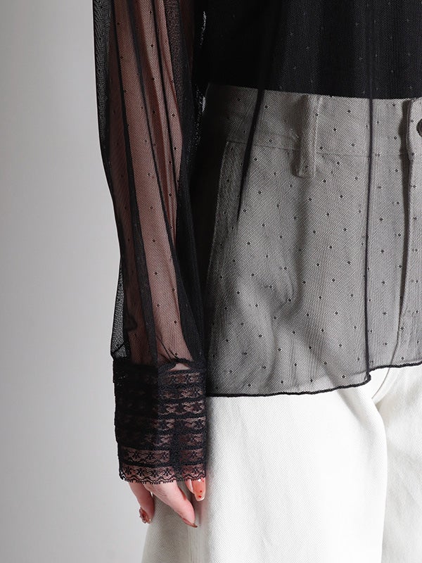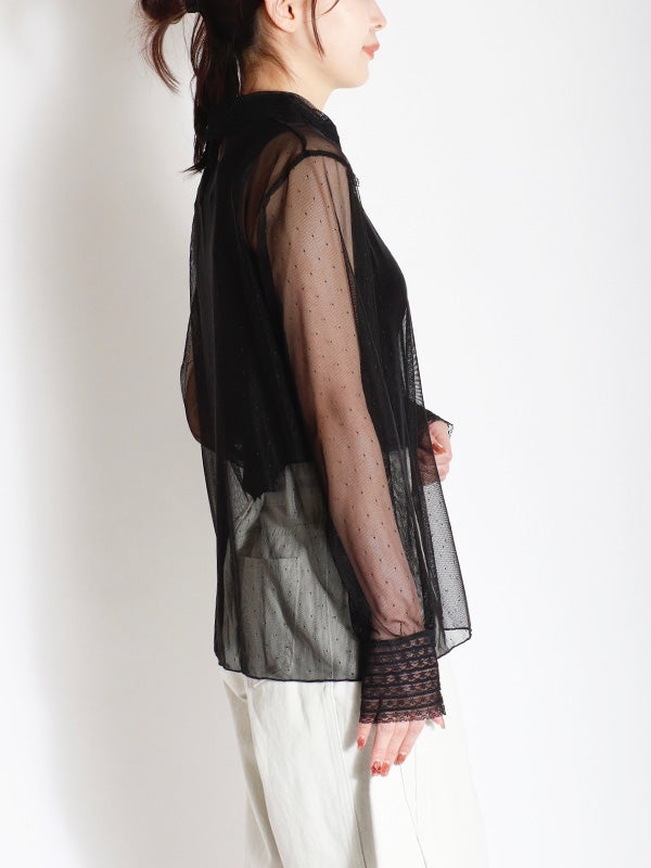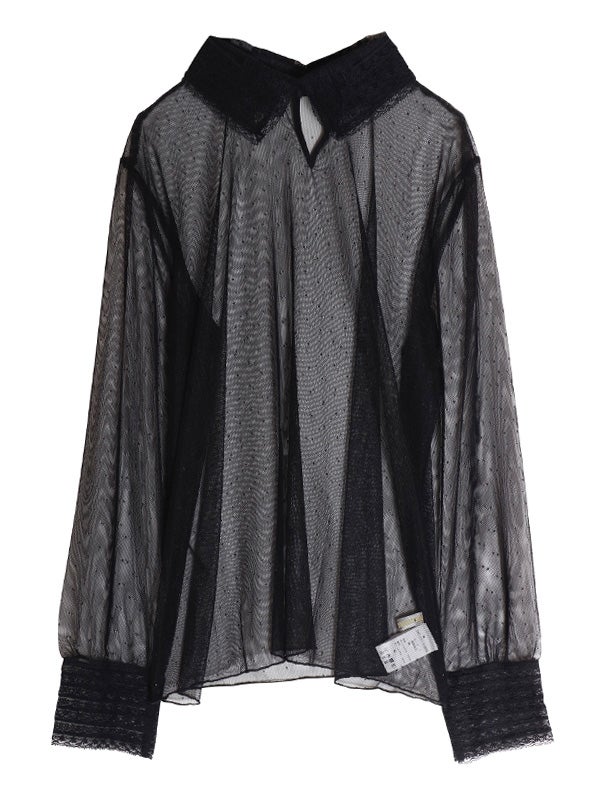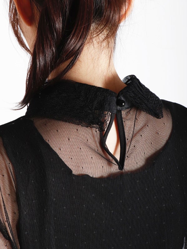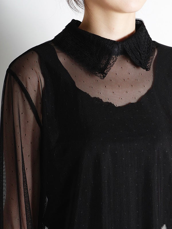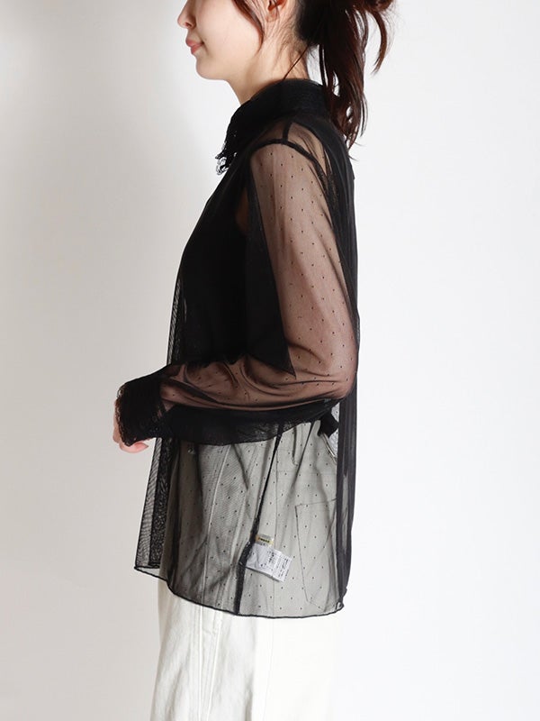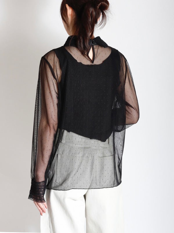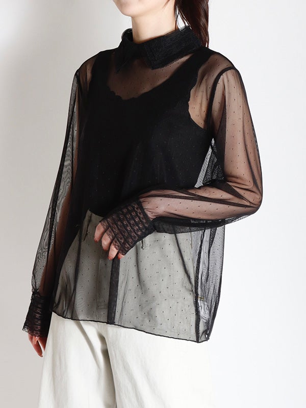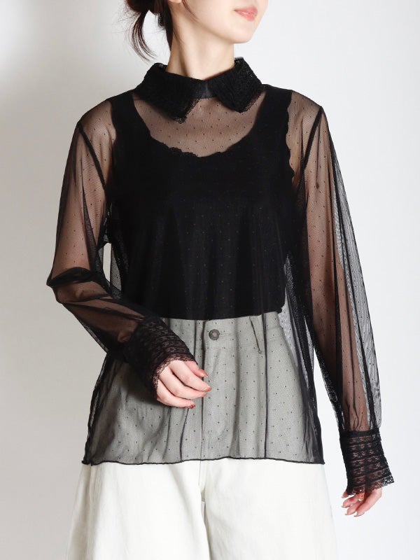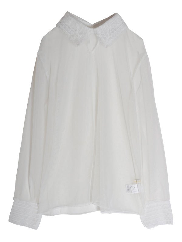 透け感のある軽やかなチュール素材のボディにレースでシャツカラーとカフスデザインを施したロマンティックなプルオーバー。トレンドのシアー感を楽しめながら、立体感のあるカラーとカフスが上品な印象へ導いてくれます。Tシャツやスウェットと合わせてカジュアルダウンしても、ワンピースと合わせてフェミニンに着こなしても◎。お好みのレイヤードスタイルで着回しが効く万能アイテムです。オケージョンにもおすすめの1枚です。