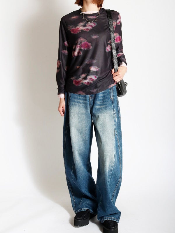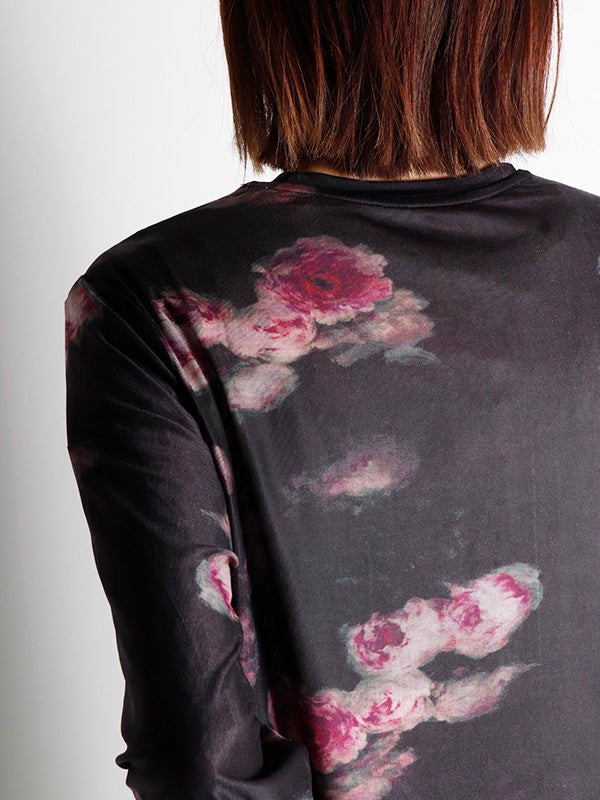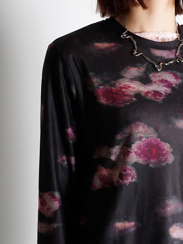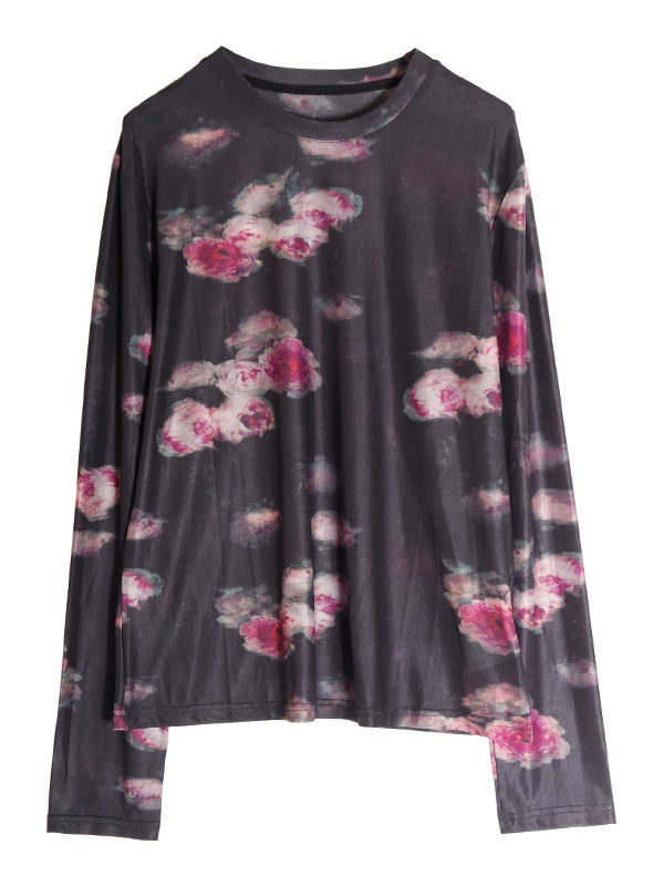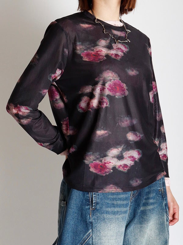 ブラックベースに映えるピンクの花柄が大人かわいいシアートップス。様々なアイテムと好相性でレイヤードのインナーとしても使える、おしゃれなアイテムです。インナー使いはもちろん、見せインナーを合わせたシアー素材特有の透け感を楽しむ着こなしもおすすめです。ボリュームのあるスカートを合わせたり、デニムでカジュアルダウンしたりと、幅広いスタイリングにマッチします。