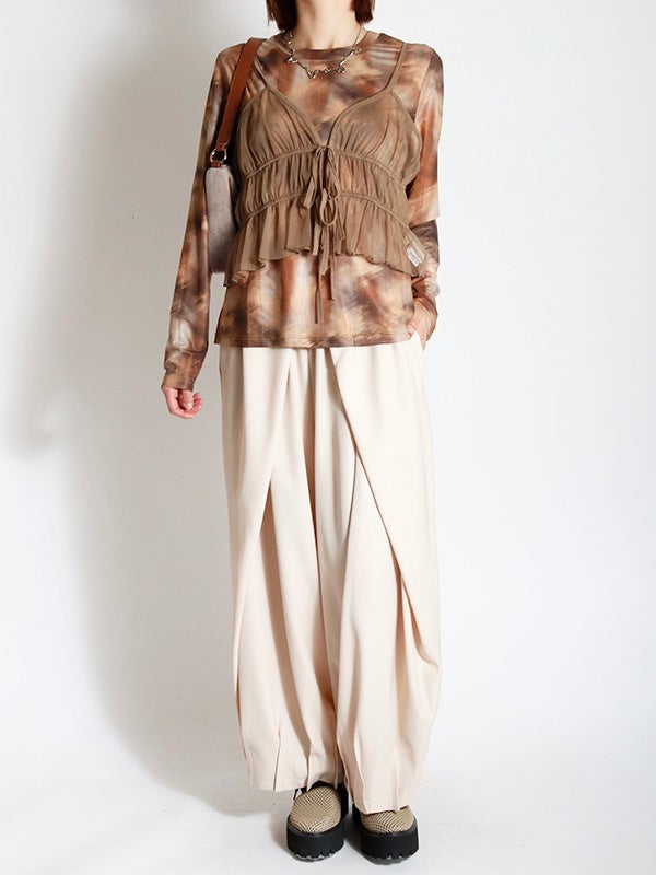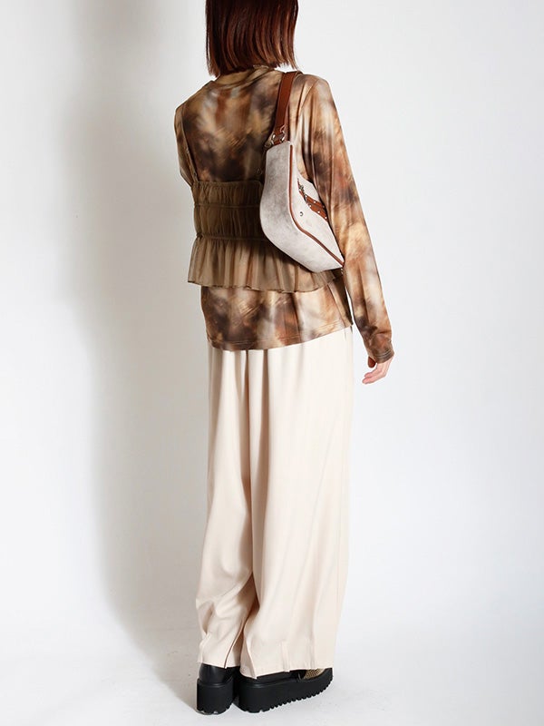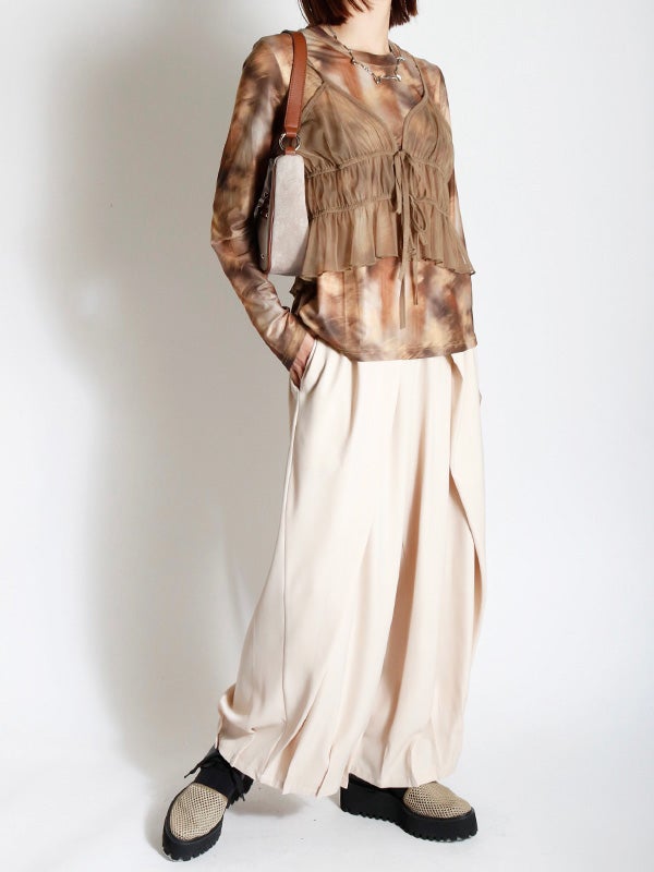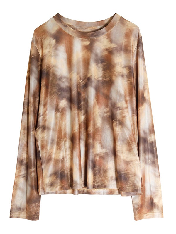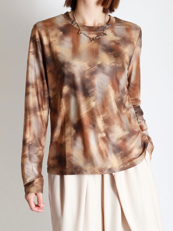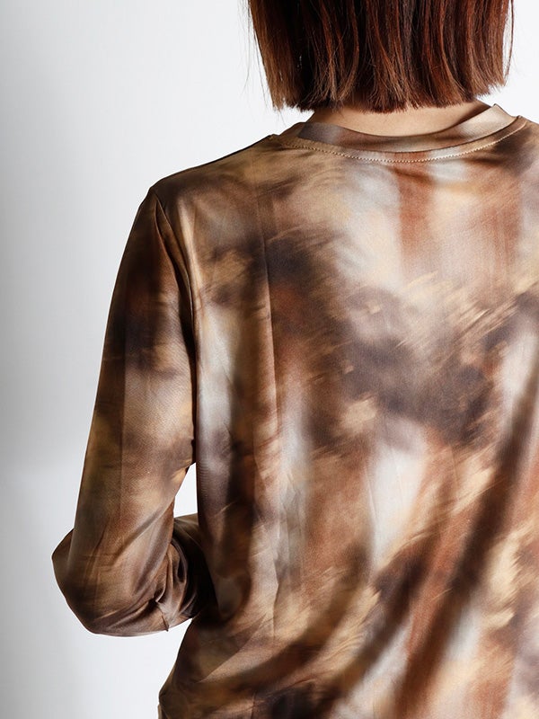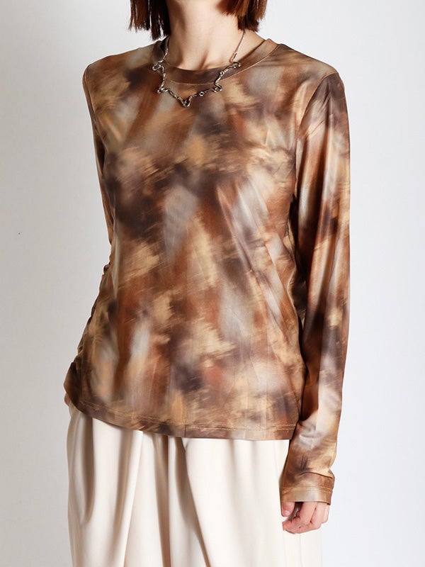 アーシーなニュアンスカラーのプリントが印象的なシアートップス。ヴィンテージ感のある独特な雰囲気を放ちます。トレンドのシアー素材なので柔らかな印象のレイヤードスタイルが叶います。Tシャツxデニムと合わせてカジュアルダウンしたり、キャミワンピースやボリュームスカートと合わせてフェミニンに着こなしても◎。お好みのレイヤードスタイルで着回しが効く万能アイテムです。