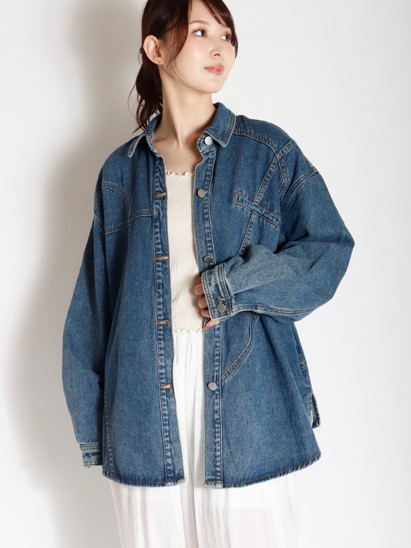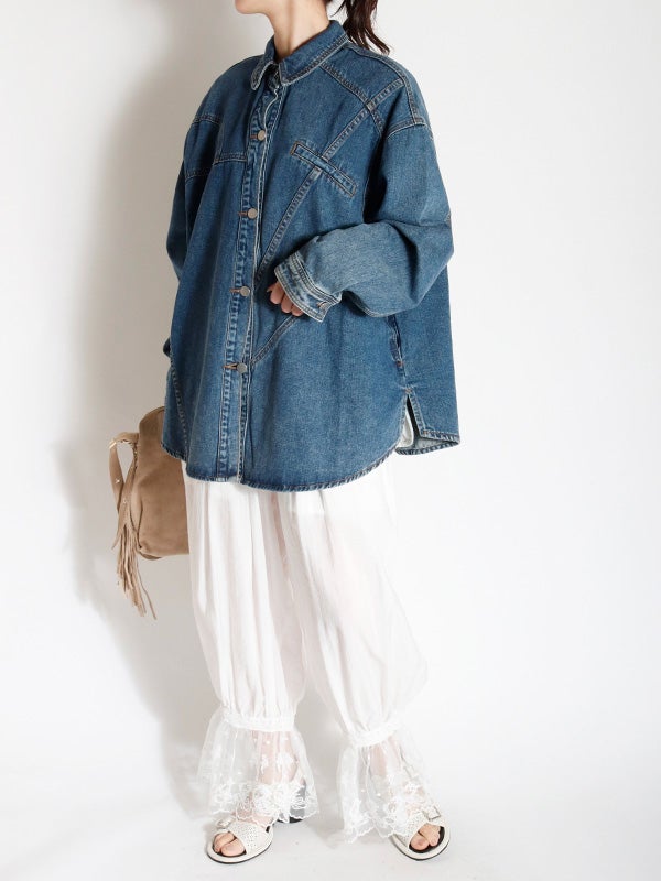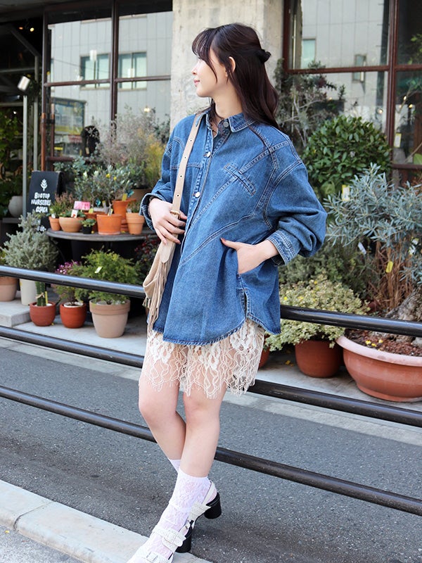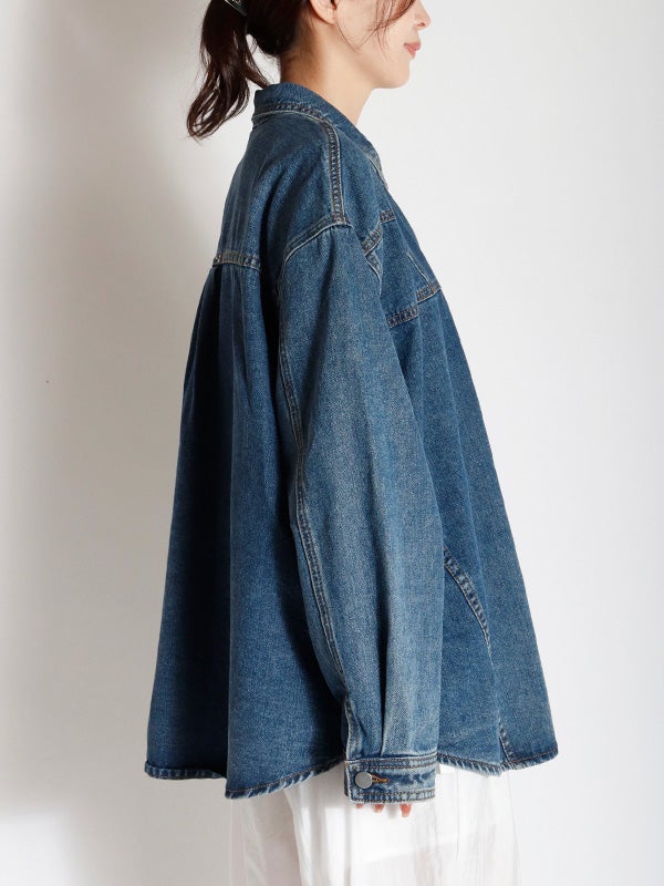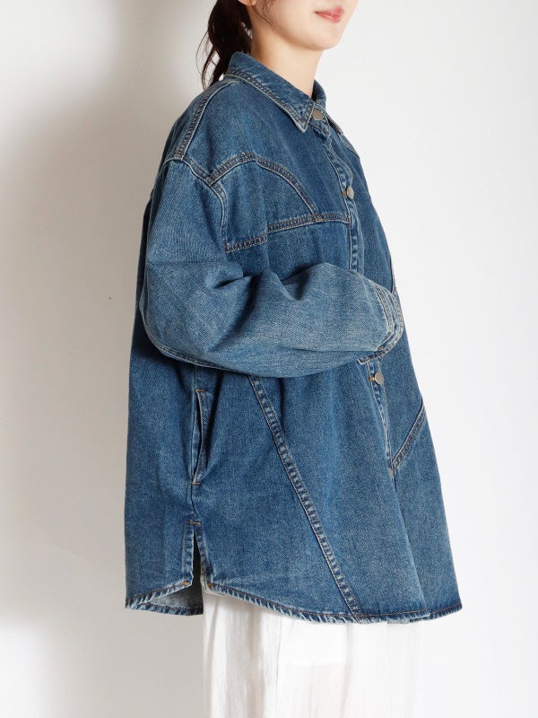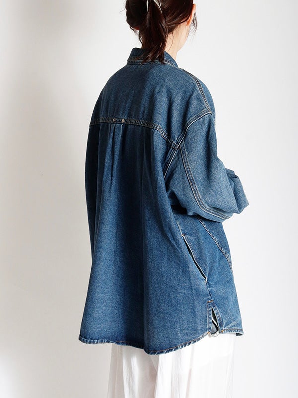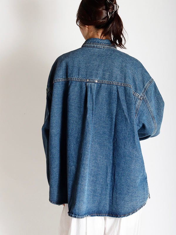 定番のデニムシャツを再構築したような細部にまでこだわったディテールのデニムシャツ。さらに女性らしくモダンなシルエットにアップデートし、スタイルに深みと個性を加えます。両脇にポケットを施し、軽アウターのようにも着ていただけるのもポイント。1枚で主役になる存在感があるので1枚着はもちろん、スカートやきれいめなパンツと合わせてカジュアルダウンするのもおすすめ。Tシャツの上に羽織るライトアウターとしても活躍し、幅広いシーズンで着回しを楽しめます。