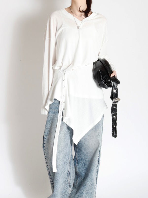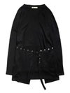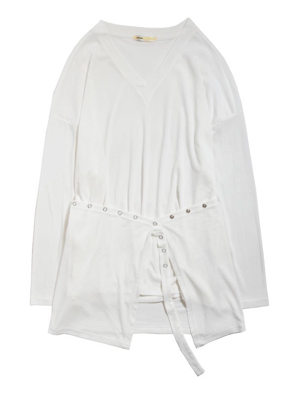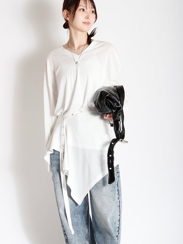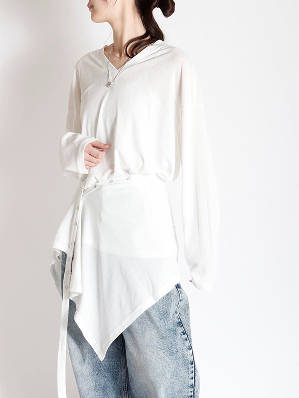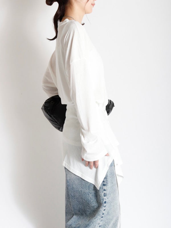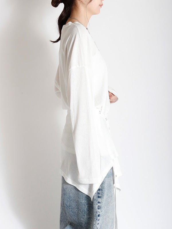 長袖トップスにミニスカートを重ねたような、トレンド感あふれるレイヤード風デザインのプルオーバー。首元はすっきりとしたVネックを採用し、女性らしいデコルテラインを演出します。それぞれ単体でも着用可能なため、お手持ちのアイテムとの組み合わせも楽しめる自由度の高いデザインです。セットで着用し、ワイドデニムを合わせたストリートミックスなスタイリングがおすすめです。シンプルながらも、洗練されたセットです。