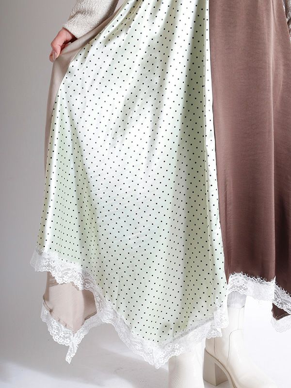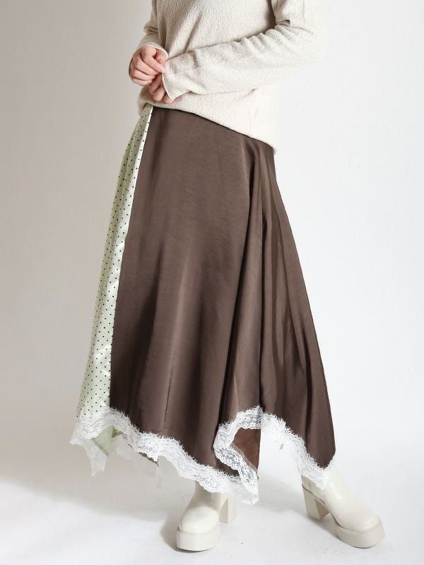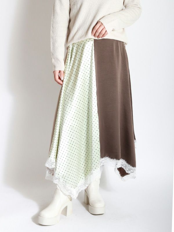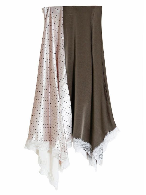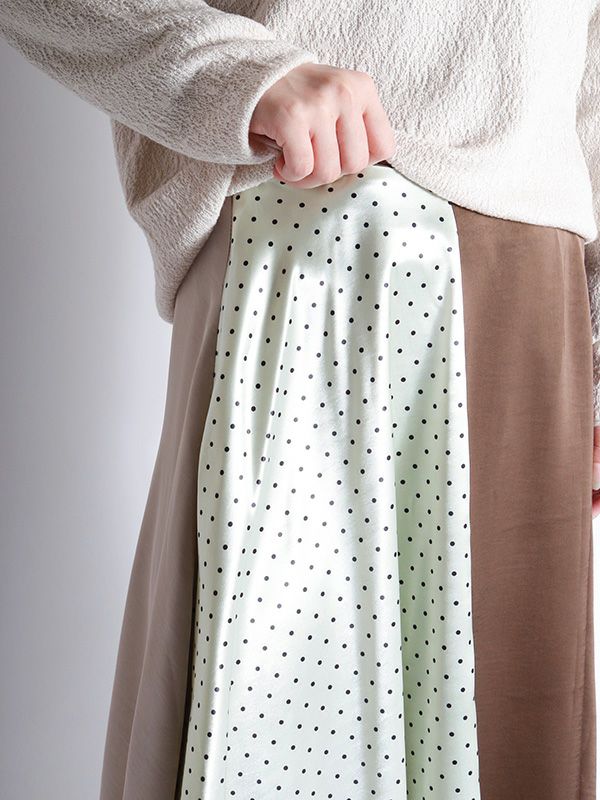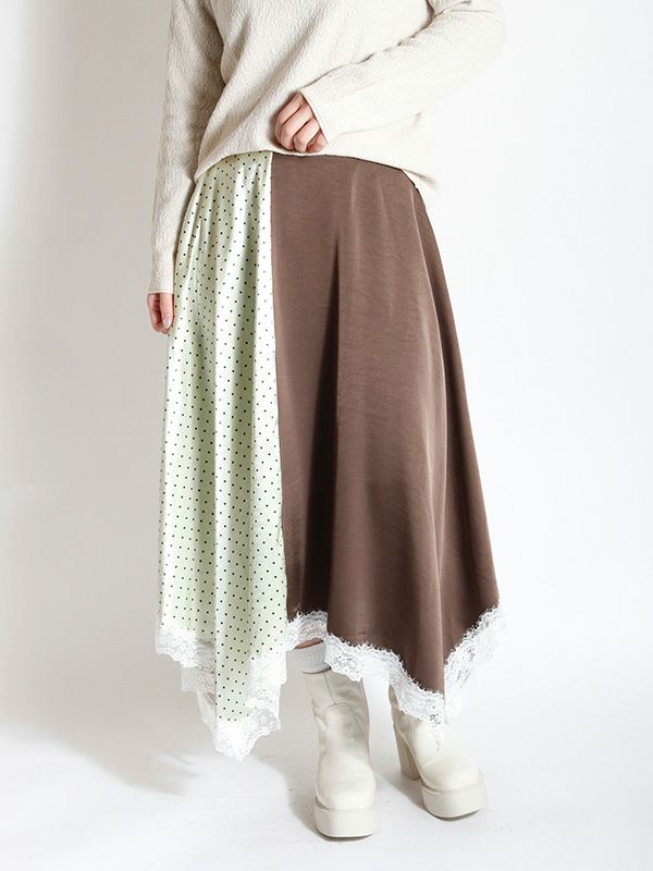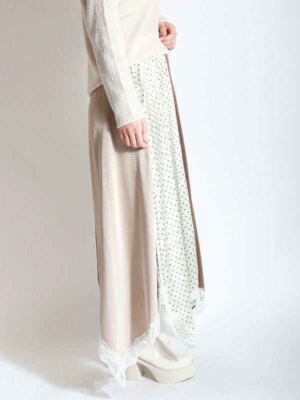 2色の無地とドット柄のサテン生地を組み合わせた、コントラストが映えるロングスカート。アシンメトリーなヘムラインに施した細かなレースデザインなど、遊び心のあるディテールを詰め込みました。贅沢な分量なので、体のラインを拾いにくいのも魅力。裏地付きで透け感を気にせず、安心して着用いただけます。シンプルなトップスと合わせるだけで着映えしてくれ、歩くたびにドラマチックな表情を演出する主役級のスカートです。