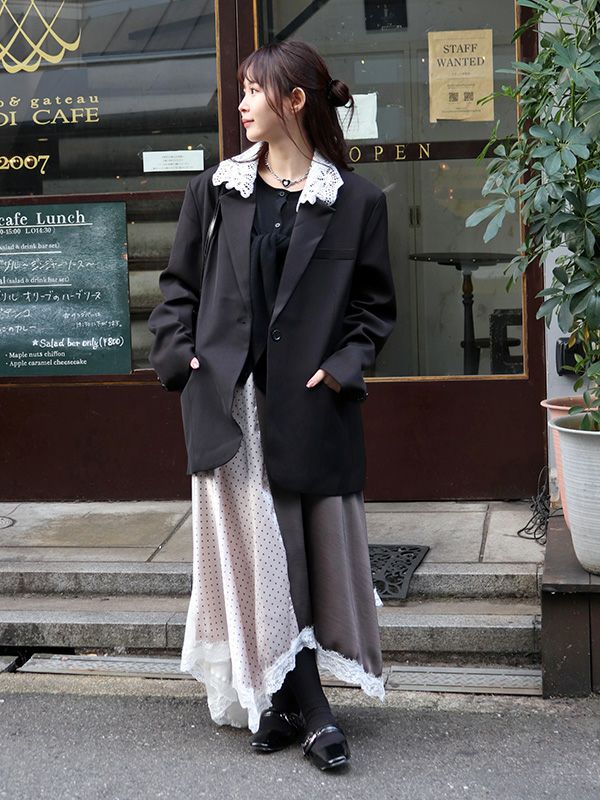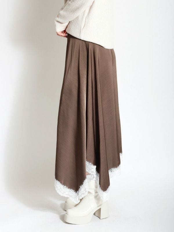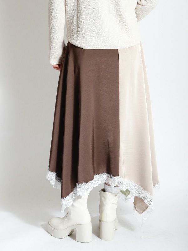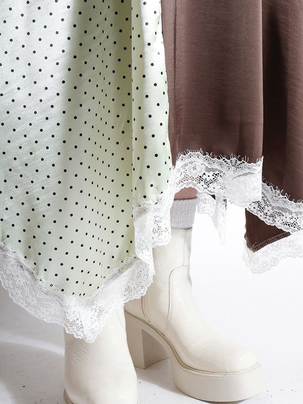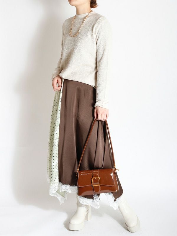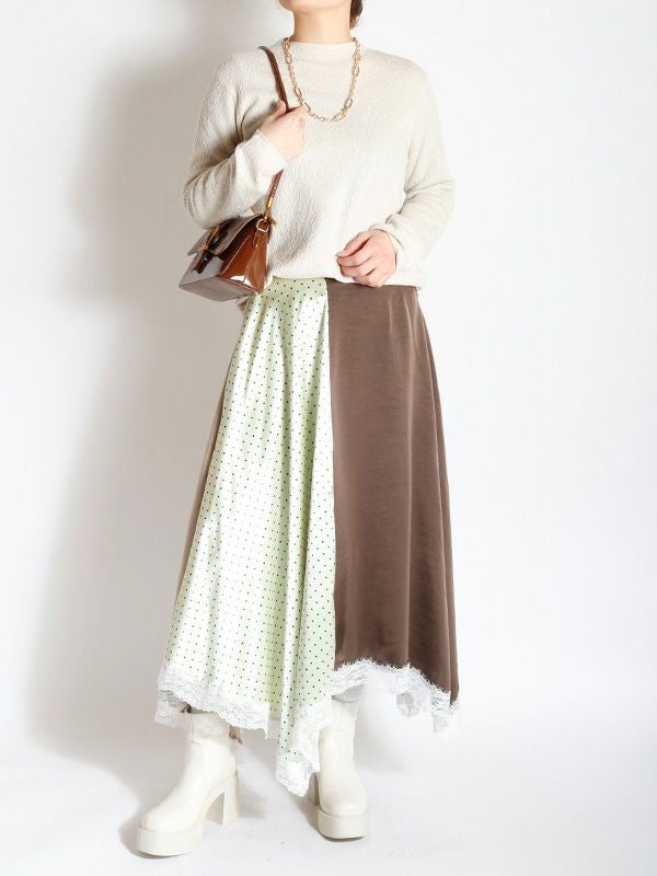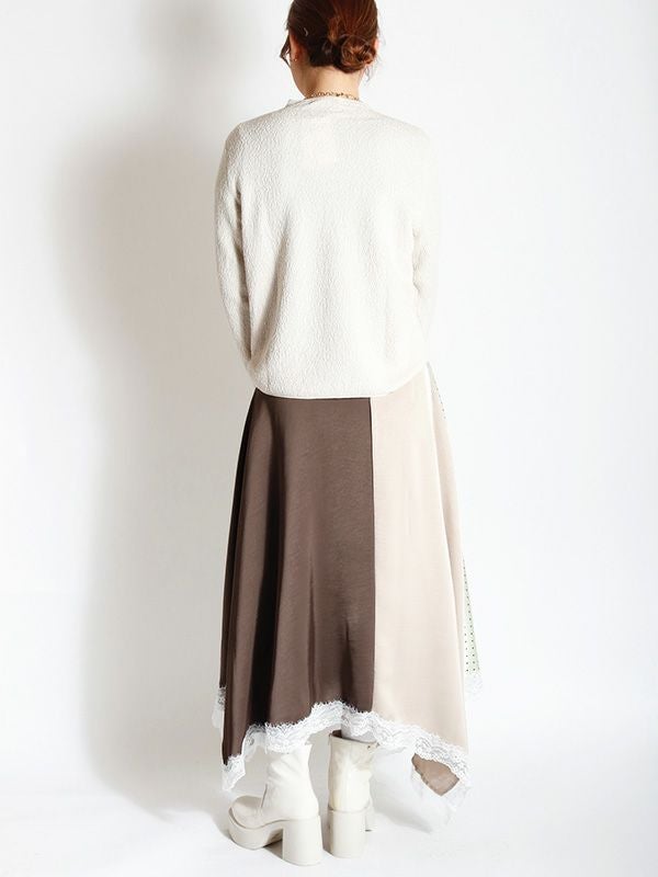 2色の無地とドット柄のサテン生地を組み合わせた、コントラストが映えるロングスカート。アシンメトリーなヘムラインに施した細かなレースデザインなど、遊び心のあるディテールを詰め込みました。贅沢な分量なので、体のラインを拾いにくいのも魅力。裏地付きで透け感を気にせず、安心して着用いただけます。シンプルなトップスと合わせるだけで着映えしてくれ、歩くたびにドラマチックな表情を演出する主役級のスカートです。
