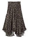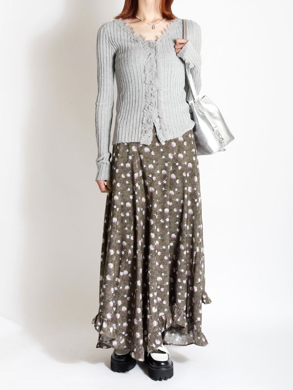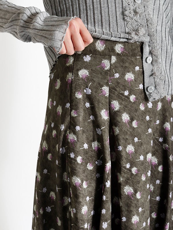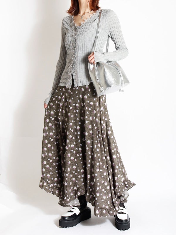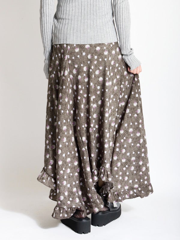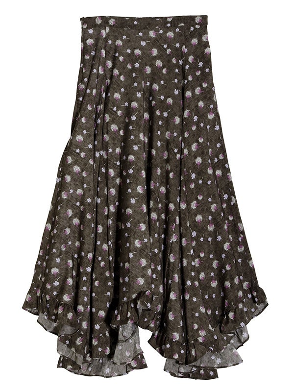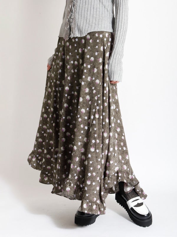 トレンド感のあるアシンメトリーデザインとフェミニンなフリルと花柄を組み合わせたロングスカート。シルエットはトレンド感を意識しつつも、落ち着いた色合いの花柄で表現することで大人な雰囲気で着こなせるデザインに仕上げています。フレア分量にこだわった10枚はぎのフレアシルエット。動くたびに華やかに広がります。シンプルなトップスと合わせるだけでサマに◎。オーバーサイズのカットソーにスニーカーといったリラクシーなスタイルから、ブラウス、ヒールと合わせてきれいめにまとめたスタイルまで、幅広いコーディネートをお楽しみいただけます。
