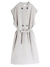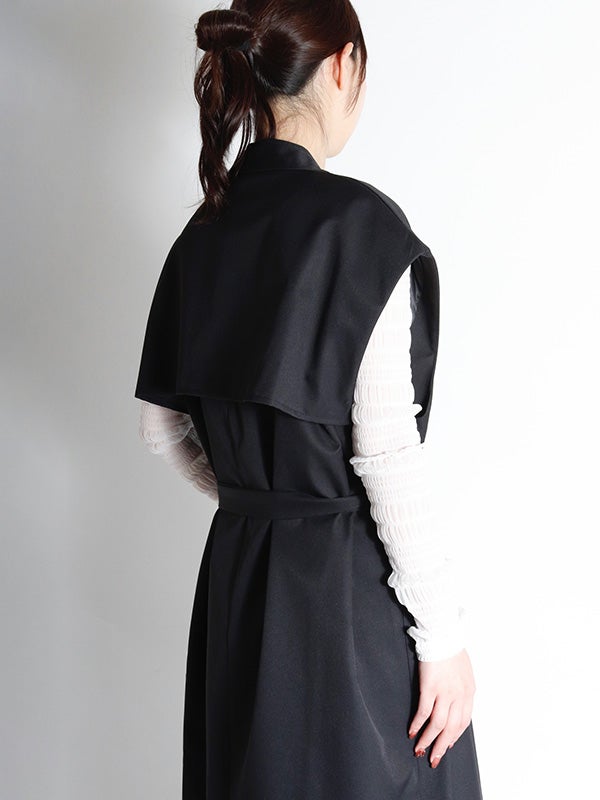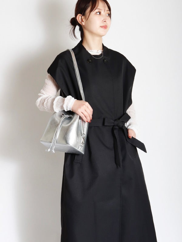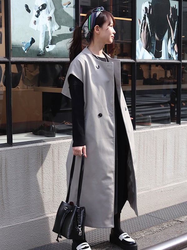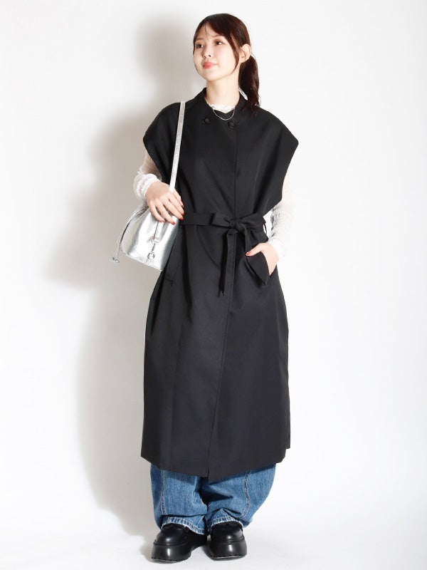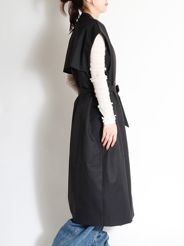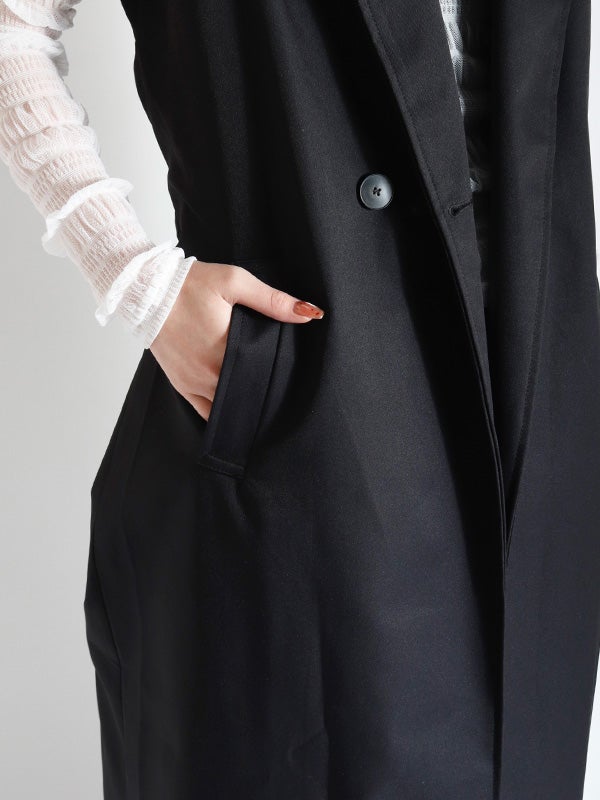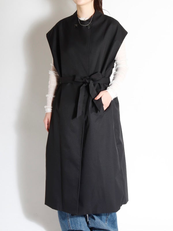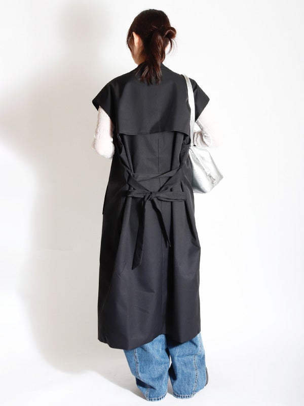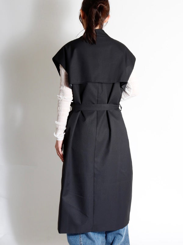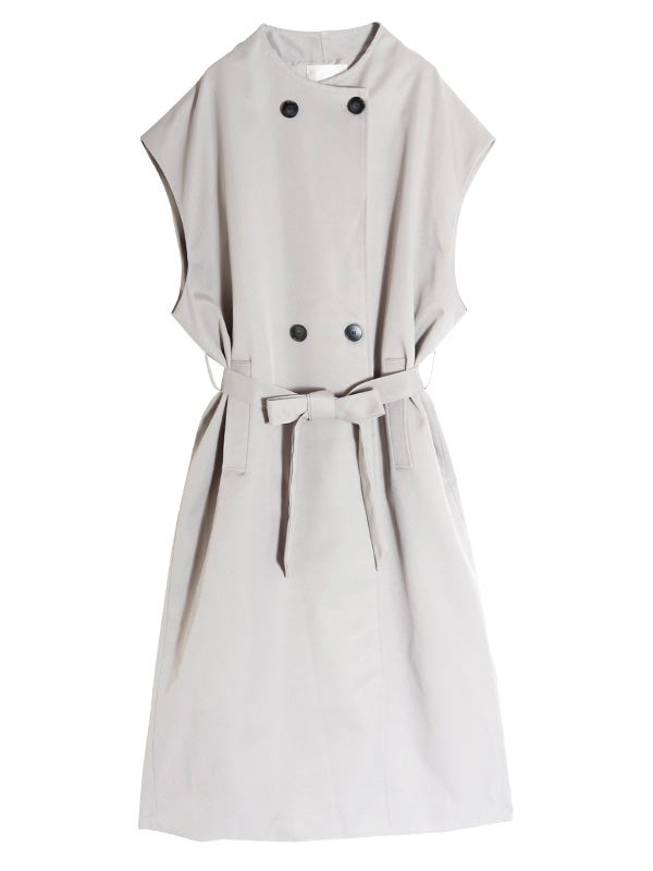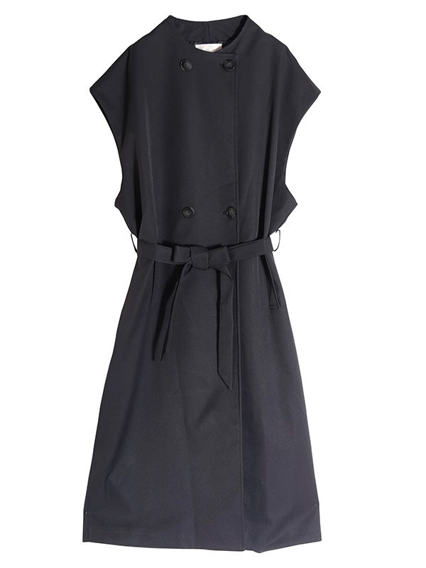 クラシカルなトレンチコートのデザインを取り入れた、ノースリーブのロングコート。前を開ければジレとしても着用でき、着こなし次第で印象を自在に変えられるアイテムです。ダブルブレストのボタン使いや、バックスタイルのアンブレラヨークもアクセントに。共布のベルトで、ウエストを絞ることでメリハリのある着こなしを叶えます。長めの着丈がエレガントなムードを演出。ネックラインをすっきりと見せるノーカラーデザインは、シャツやブラウスはもちろん、Tシャツなど幅広いアイテムとスタイリングして頂けます。