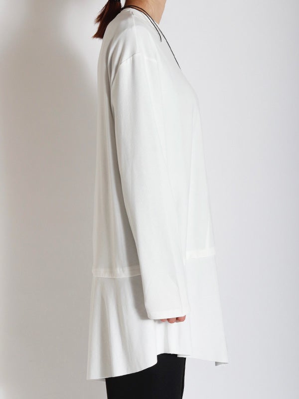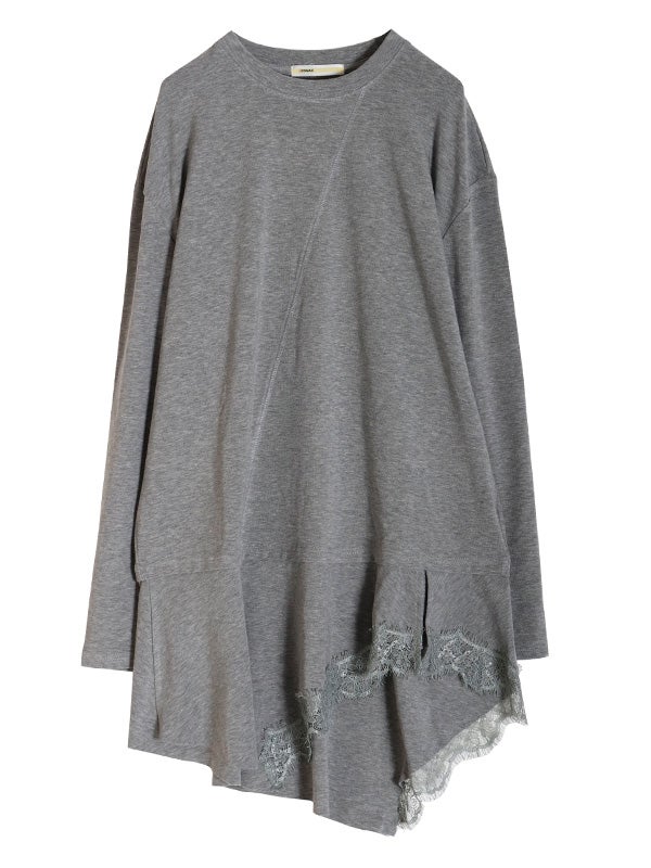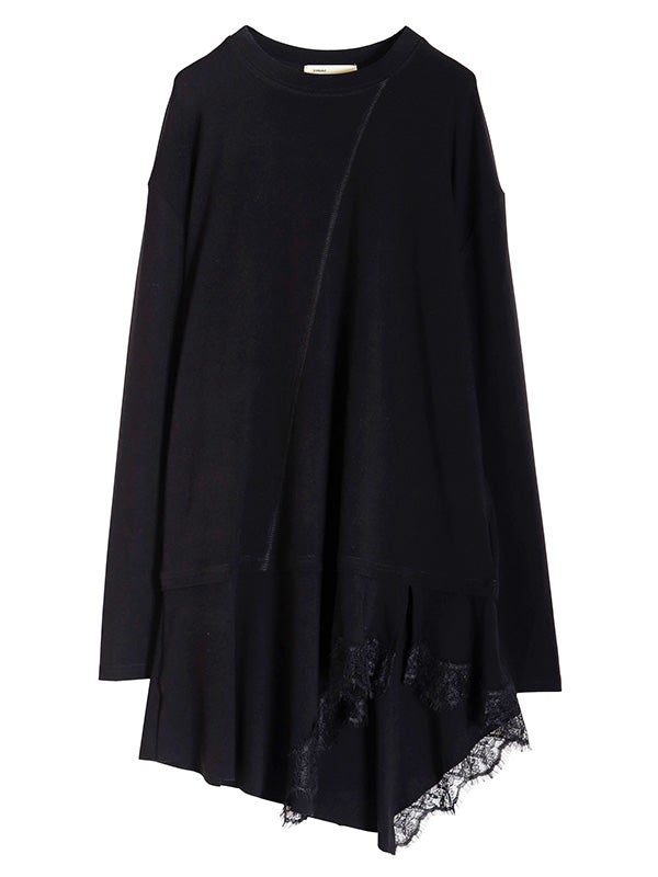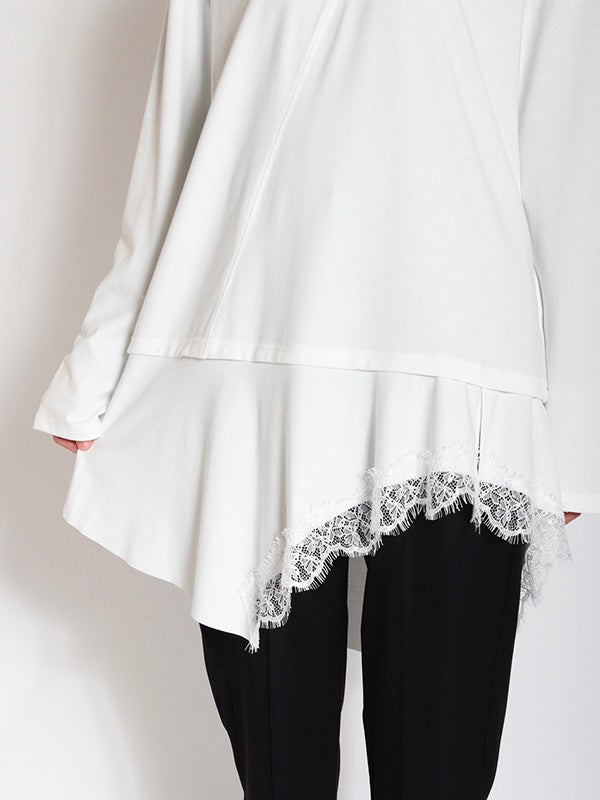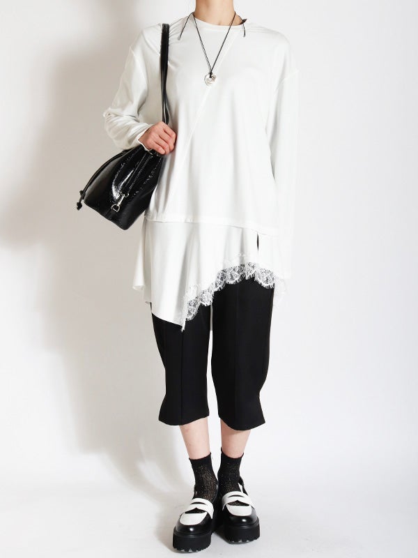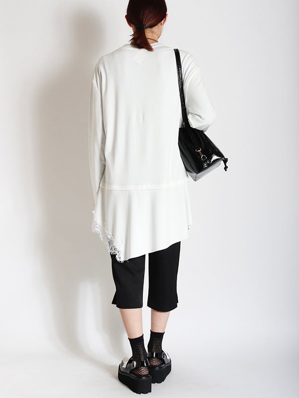 トレンドのアシンメトリーxレースデザインが印象的なトップス。上半身にはシルエットを美しく魅せるための切り替えラインを施しています。最大の特徴はフリルのアシメヘムで、左右非対称な裾のラインが、〈COQULE〉らしいエッジの効いたモードな表情を演出します。1枚での着用はもちろん、シャツやジャケットとのレイヤードスタイルがおすすめ。裾から覗くヘムラインが、重ね着に奥行きと華やかさをプラスします。デニムでカジュアルダウンしたり、スラックスと合わせてモードに仕上げたりと、幅広いテイストで着回し可能です。