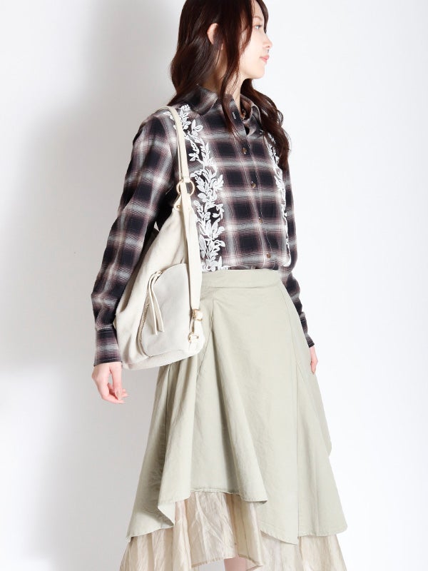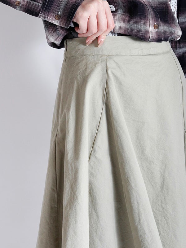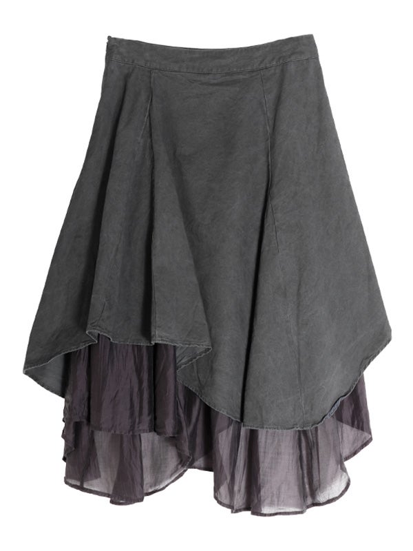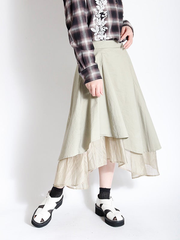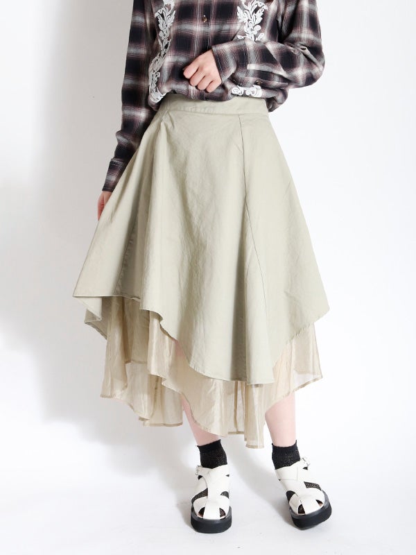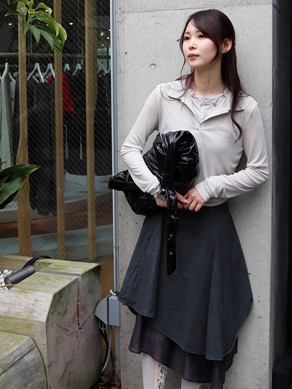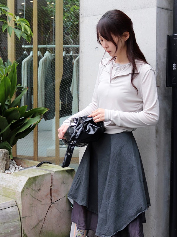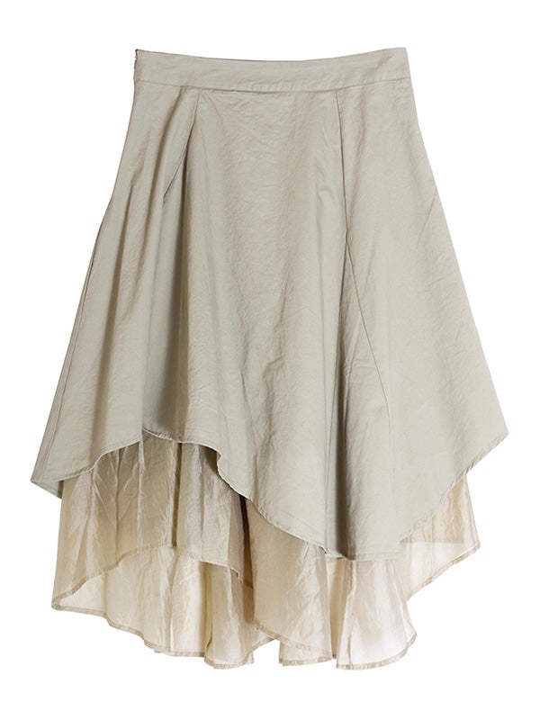 アシンメトリーなカッティングと、歩くたびに美しく揺れるディテールが特徴のフレアスカート。流れるようなドレープと構築的なシルエットが目を引きます。ミニマルな無地の異素材レイヤードが洗練された印象を与え、どんなトップスと合わせてもコーディネート全体を格上げしてくれます。裾に向かって広がるフレアシルエットが、体型をカバーしながらスタイルアップ効果も叶えてくれます。