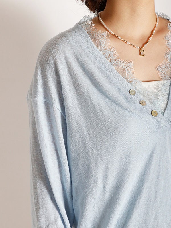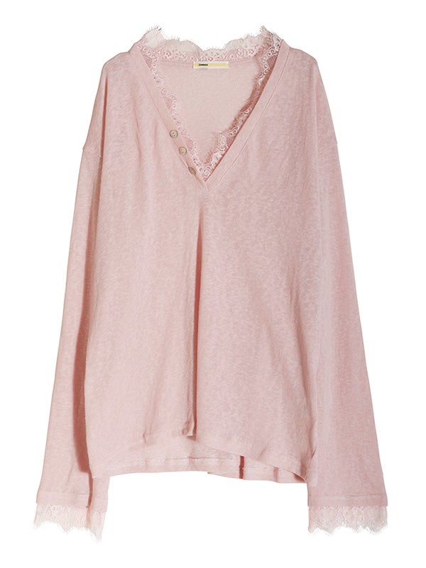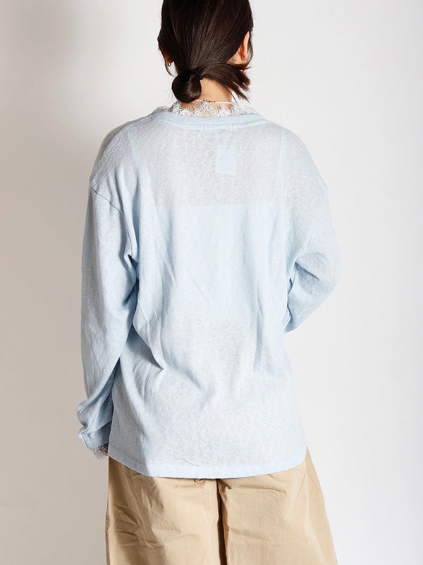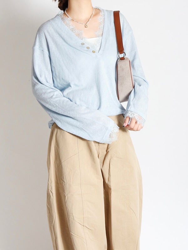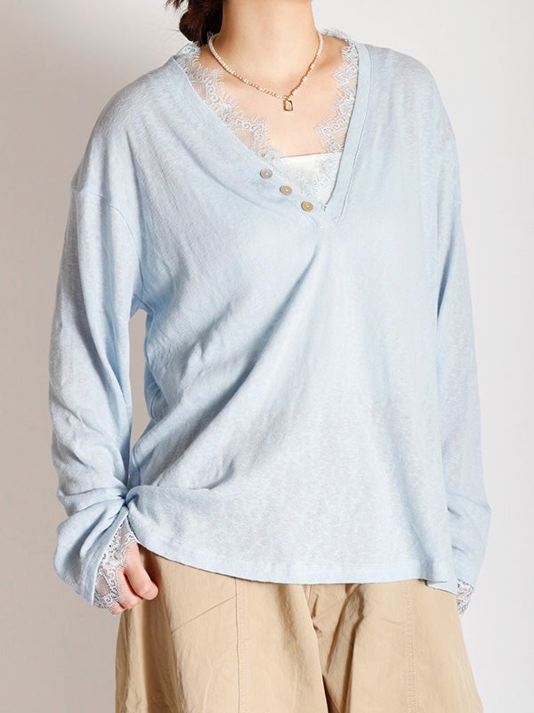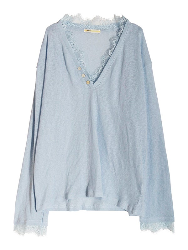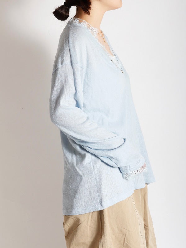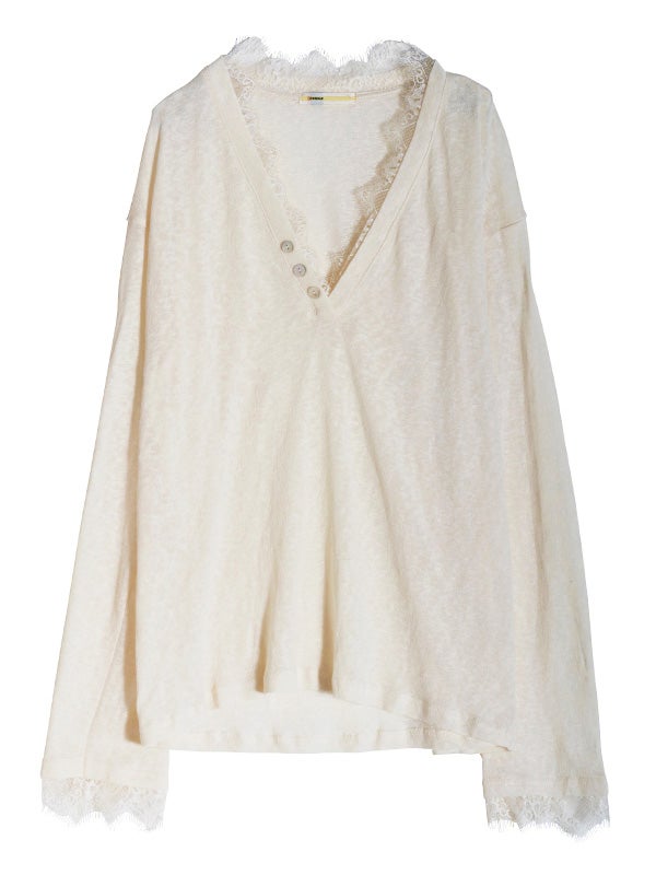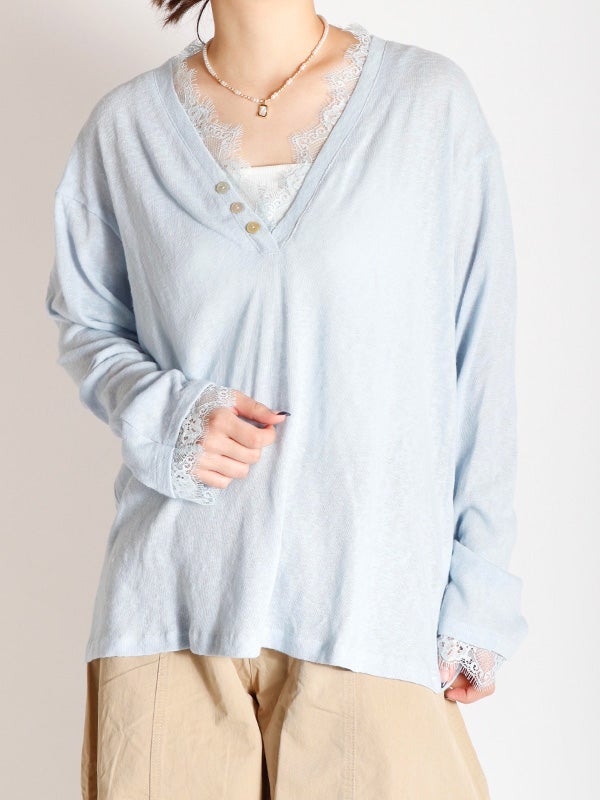 スッキリとしたVネックxリラクシーなサイズ感のプルオーバーをベースに、ネックライン、袖口にフェミニンなレースを施したシンプルながらも女性らしい印象のプルオーバーです。ネックラインのレースが顔周りを華やかに見せてくれます。ルーズフィットなサイズ感で、女性らしいシルエットを演出。デニムやワイドパンツと合わせれば、さりげない抜け感のある大人カジュアルなコーディネートが完成します。