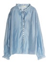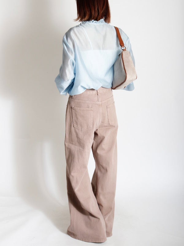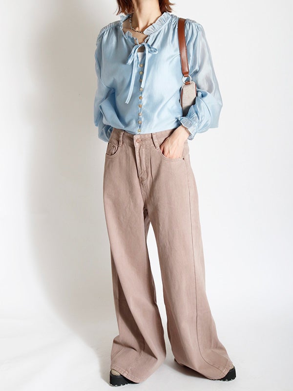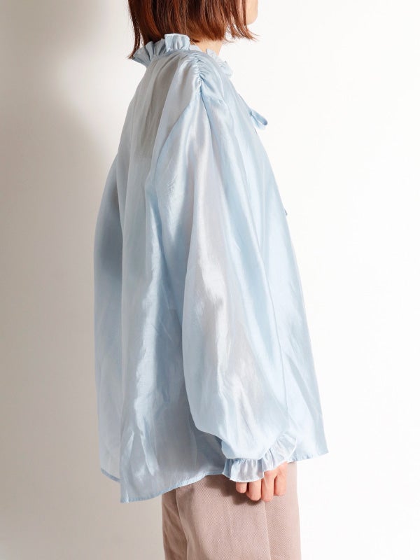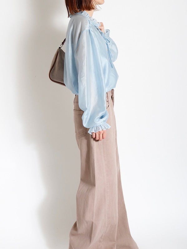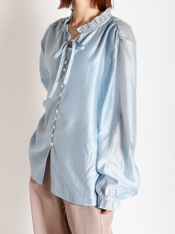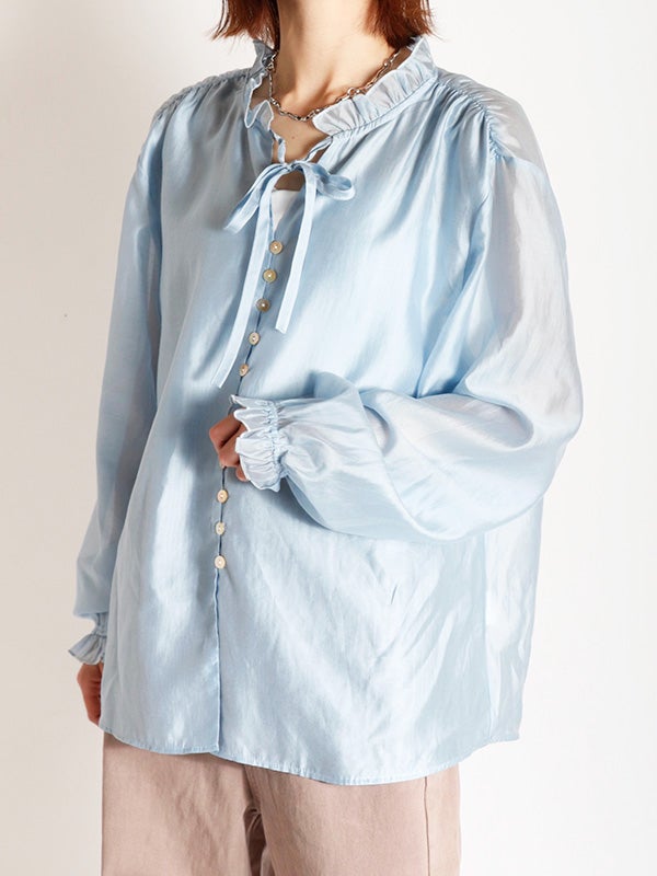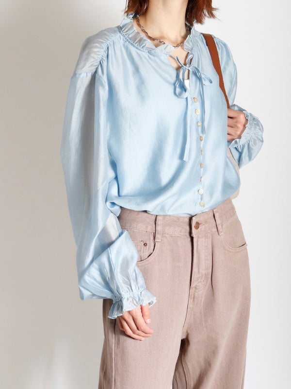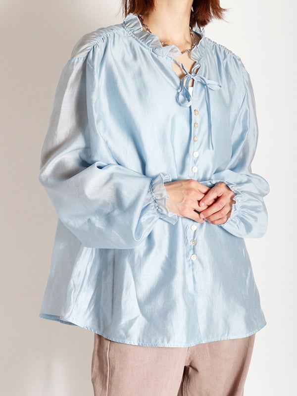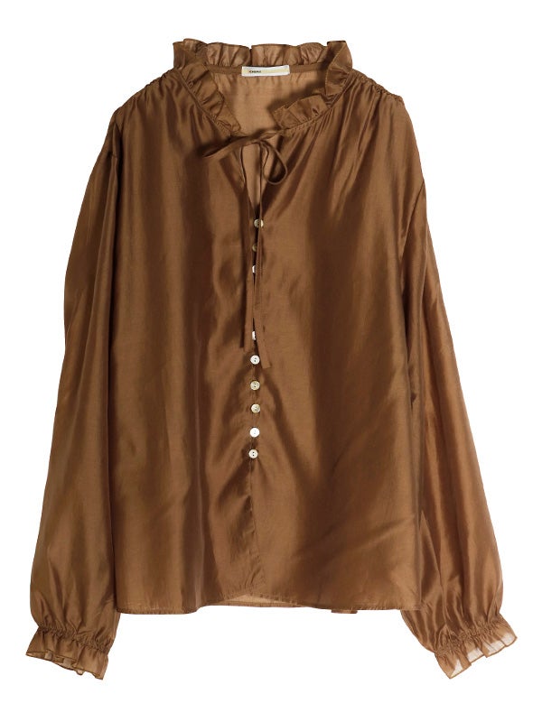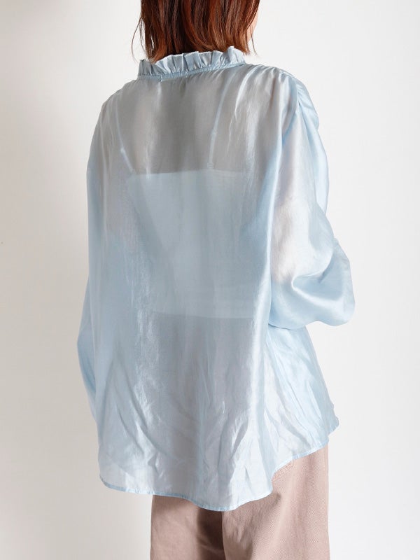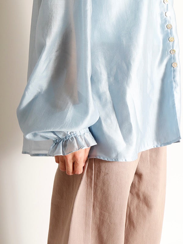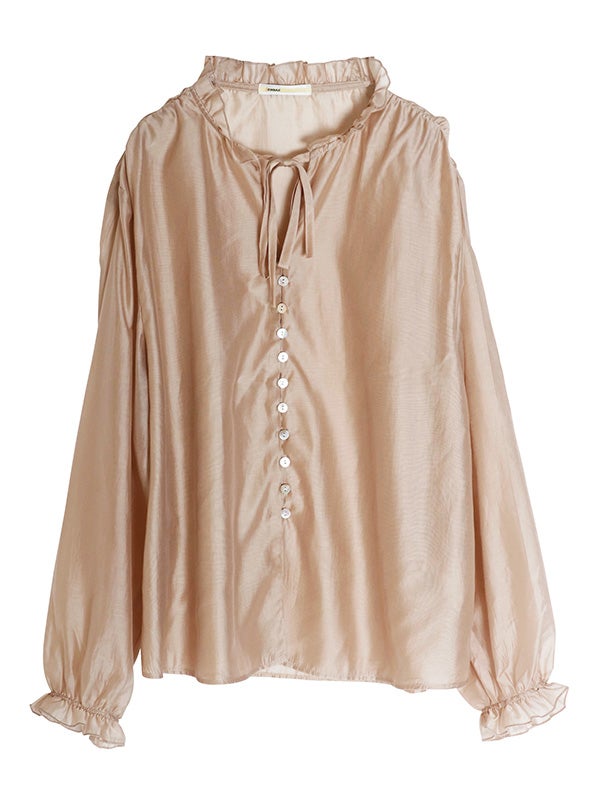 フリルのスタンドカラーが顔周りにさりげない華やぎを添えてくれるブラウス。フロントにはボタンでアクセントをプラスし1枚で着映えするデザインです。ナチュラルな風合いの清涼感溢れる、透け感のある素材で軽やかさを演出します。ヒップにかかるやや長めの丈感とボディラインを拾いにくい適度なゆとりがあり、リラックス感ときちんと感を両立します。シンプルなボトムスと合わせるだけでスタイリングが完成します。