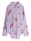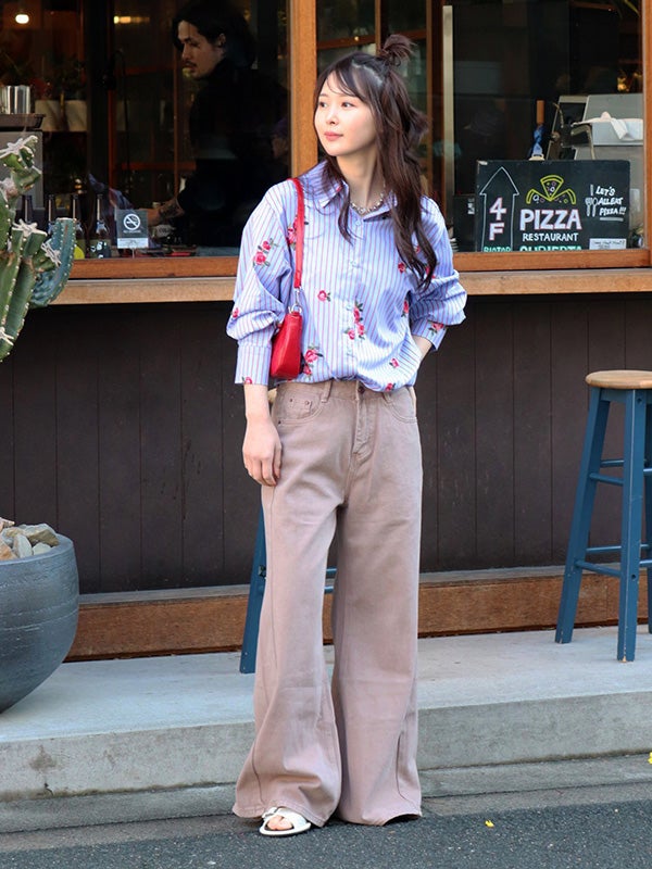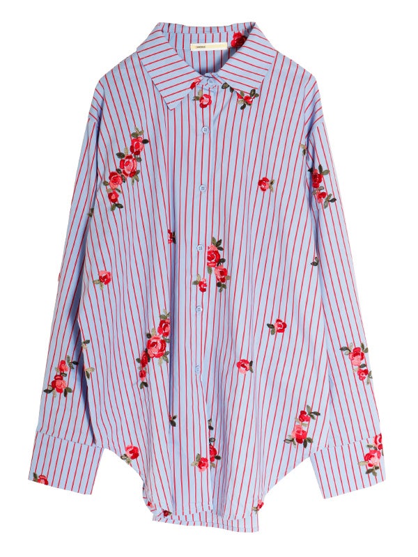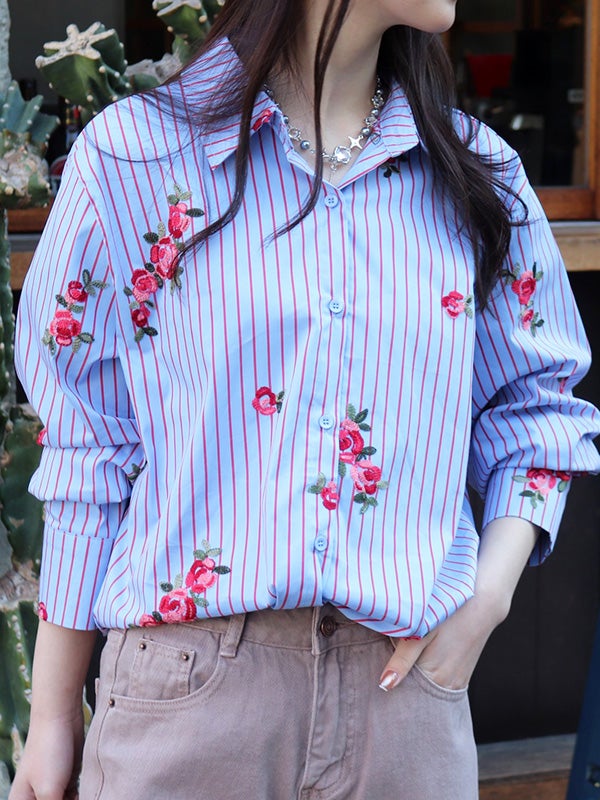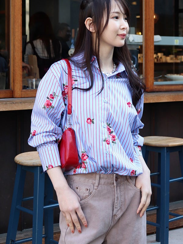 さわやかなストライプ生地に刺繍のブーケのような花柄が目を引くオーバーシャツ。可愛い刺繍のデザインと反対に、サイズ感は身幅や肩回りが大きめになっており、メンズライクなシルエットで甘すぎずに着ていただけます。1枚でコーディネートの主役になる、デザイン性の高い1着です。ラフにデニムパンツと合わせるのはもちろん、スラックスやフレアパンツと合わせれば、きれいめ大人カジュアルに仕上がります。羽織りとしてレイヤードを楽しむのもおすすめです。