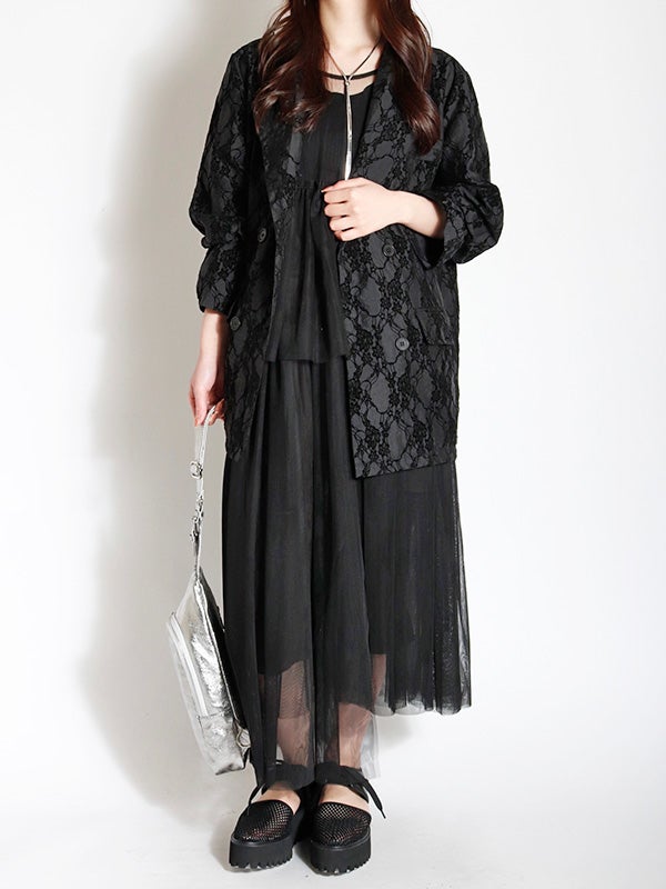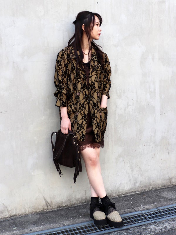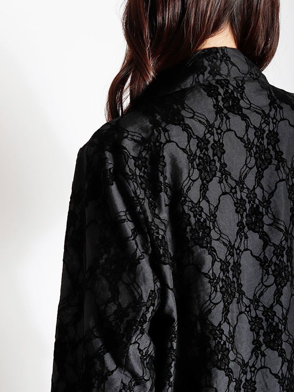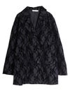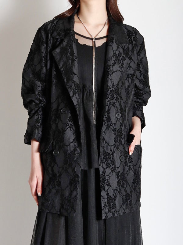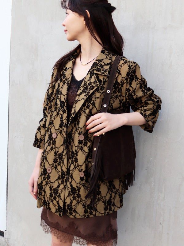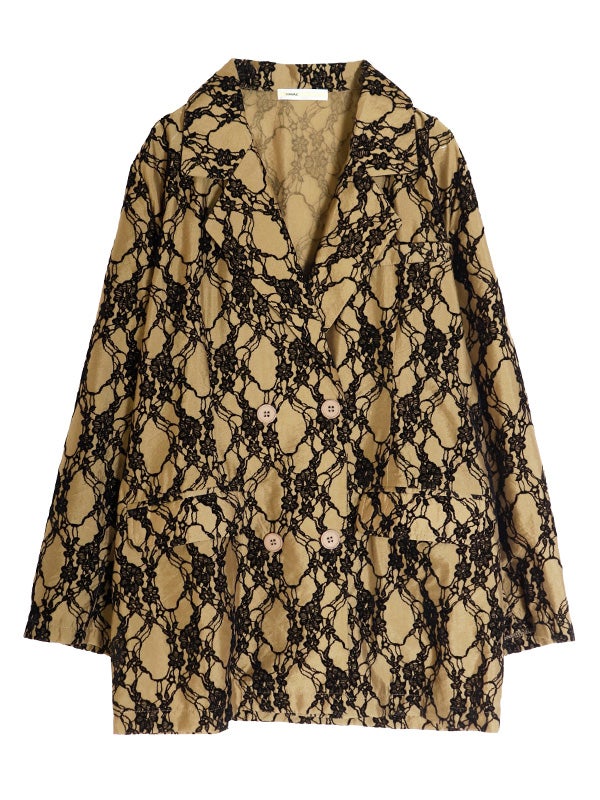 レース模様のフロッキープリントを大胆にあしらった印象的なパターンに、シャツ感覚でサラリと羽織れる軽やかなデザインのダブルジャケット。見た目の印象とは異なる薄手の生地は夏でも日差しや冷房予防に着ていただける素材です。程よくゆったりとしたリラックスシルエットが今どきなこなれ感を演出します。デニムなどと合わせた大人カジュアルスタイルはもちろん、お出かけからセレモニーまでの幅広いシーンで活躍してくれるジャケットです。