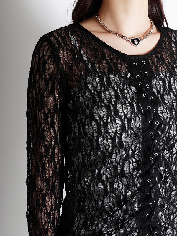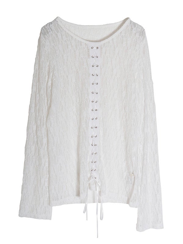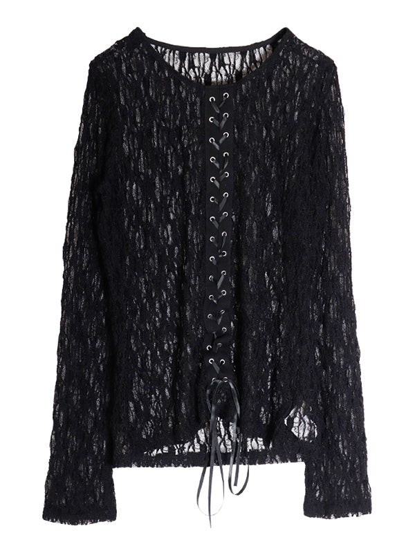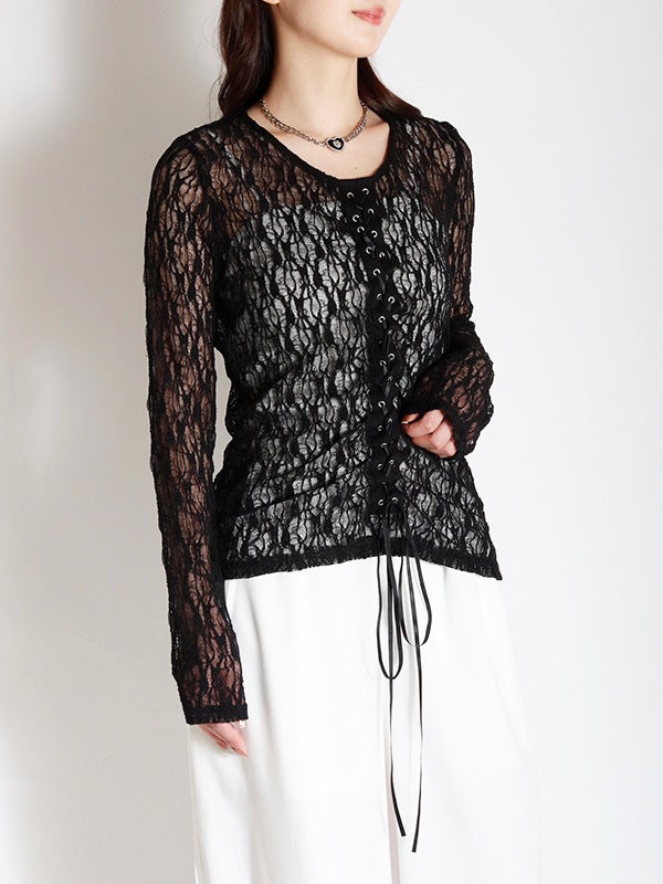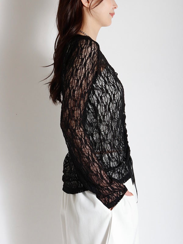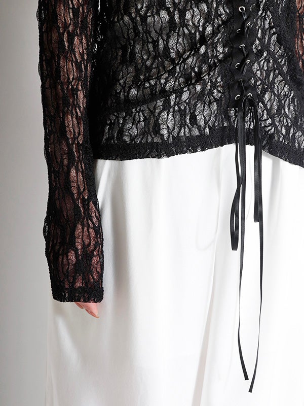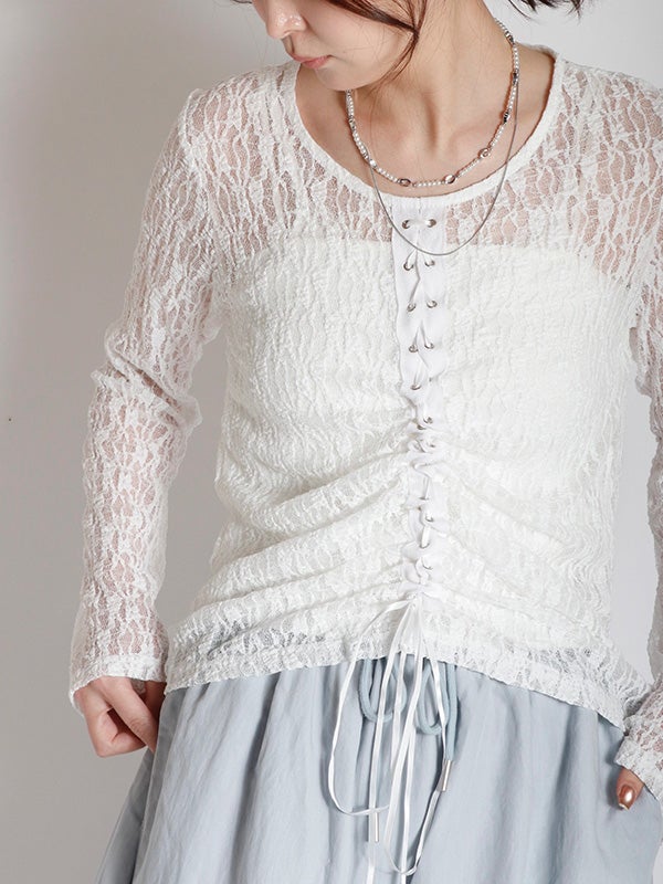 フロント中央の大胆なレースアップデザインを施したレース生地のロングスリーブトップス。リボンはあえて長めに垂らすことで、動くたびに豊かな表情が生まれ、1枚で存在感を放つ主役級のデザインをプラス。インナーにカラーアイテムを重ねて、レースの隙間から色を覗かせる奥行きのあるレイヤードを楽しむのもおすすめ。体のラインを美しく引き立てるタイトなフィッティング。着丈は程よい長さがあり、ボトムインしても腰回りがもたつかず、すっきりとスマートに着用いただけます。レースの甘さを活かしつつ、あえてハードなワイドデニムなどと合わせることで、いつもと違った女性像を演出できます。