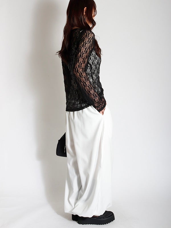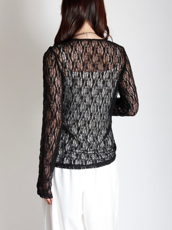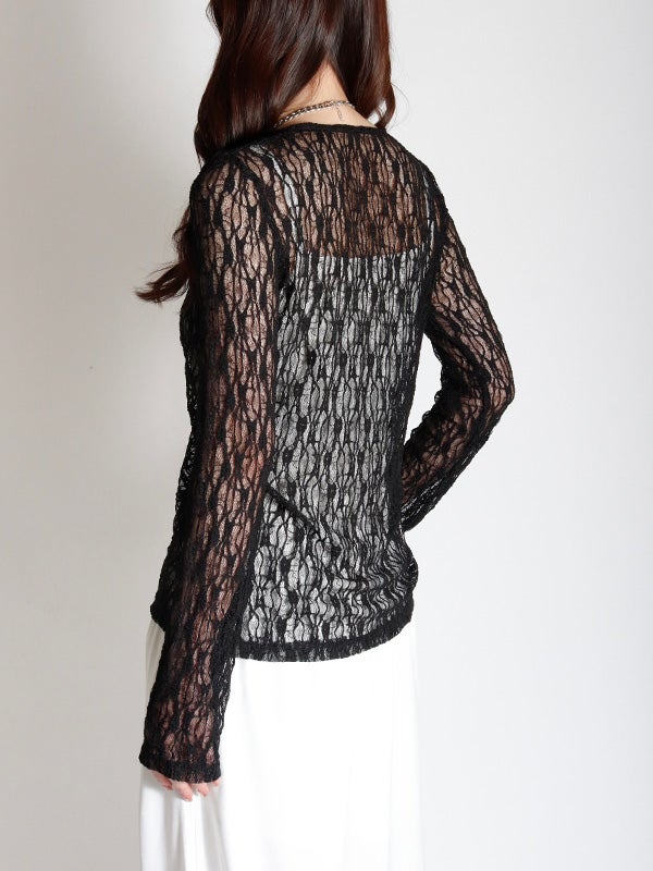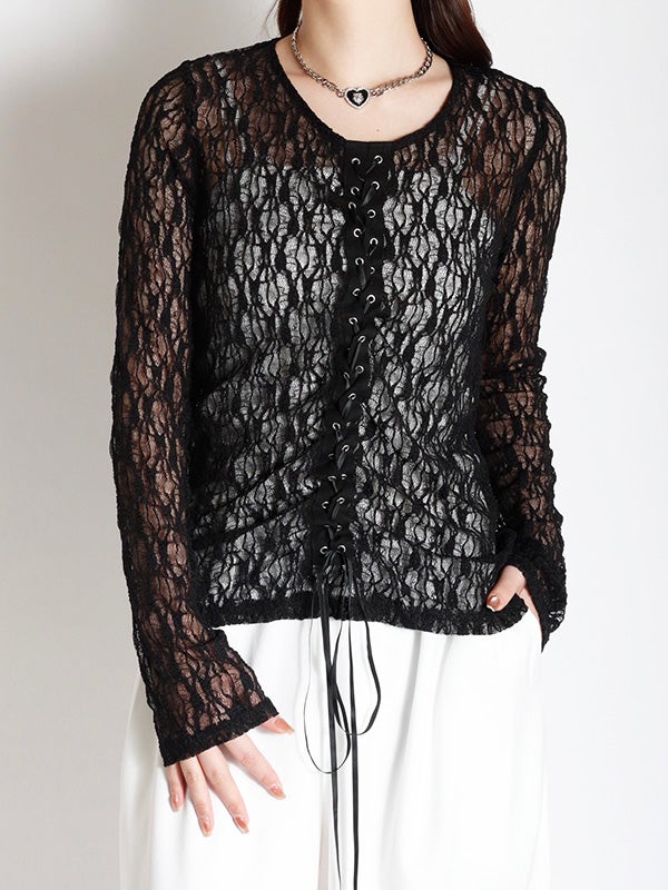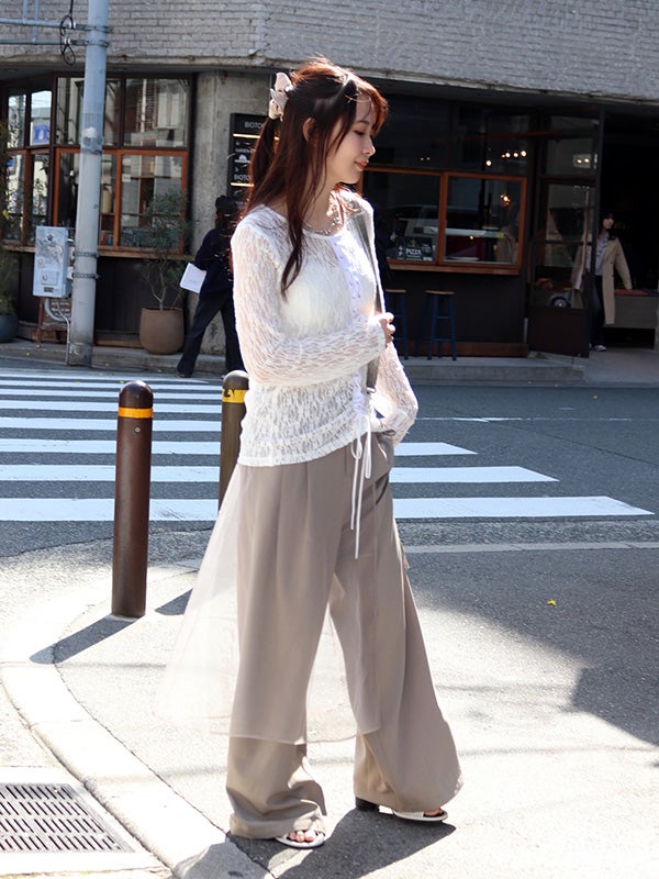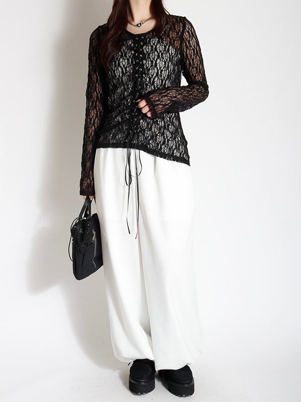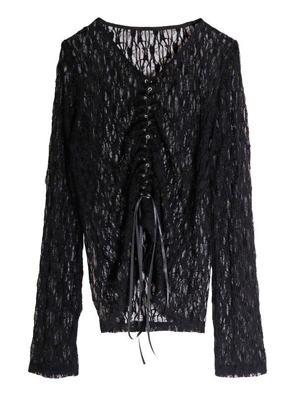 フロント中央の大胆なレースアップデザインを施したレース生地のロングスリーブトップス。リボンはあえて長めに垂らすことで、動くたびに豊かな表情が生まれ、1枚で存在感を放つ主役級のデザインをプラス。インナーにカラーアイテムを重ねて、レースの隙間から色を覗かせる奥行きのあるレイヤードを楽しむのもおすすめ。体のラインを美しく引き立てるタイトなフィッティング。着丈は程よい長さがあり、ボトムインしても腰回りがもたつかず、すっきりとスマートに着用いただけます。レースの甘さを活かしつつ、あえてハードなワイドデニムなどと合わせることで、いつもと違った女性像を演出できます。