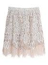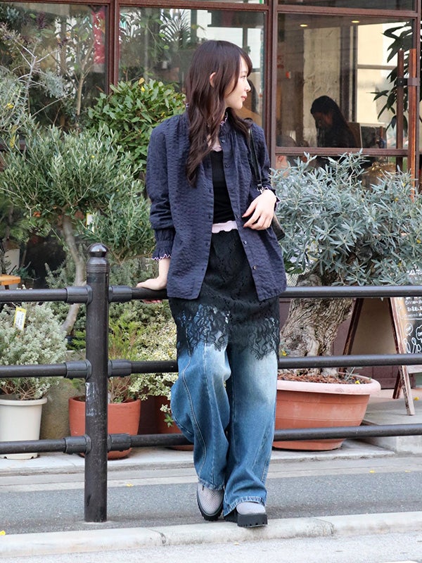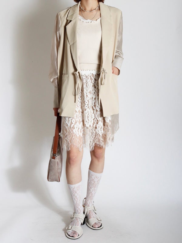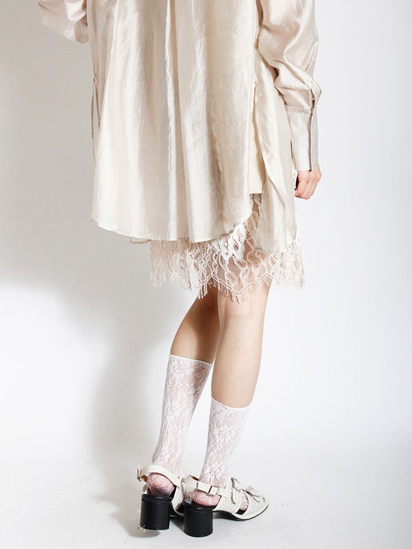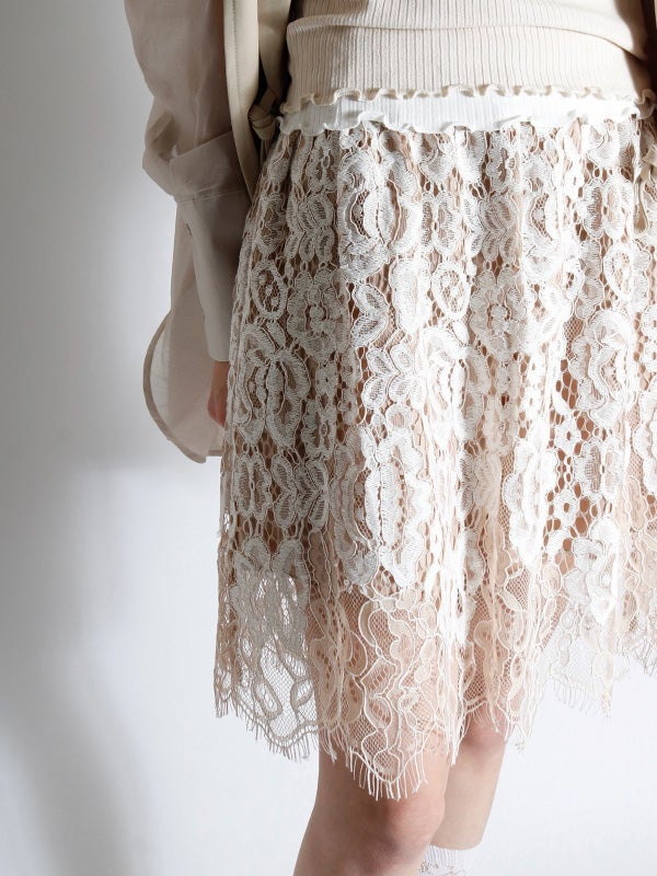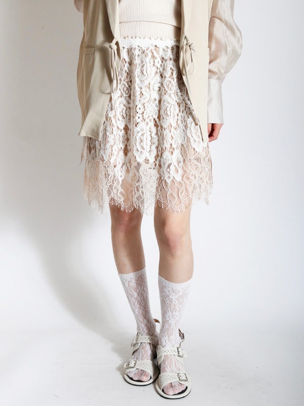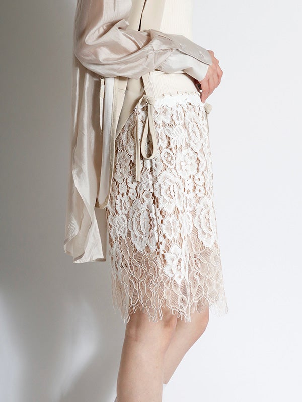 華やかで目を惹く総レース生地のミニスカート。繊細なレースが、ランジェリーライクな大人の甘さを醸し出し、動くたびに華やかな余韻を演出します。カジュアルなTシャツやシンプルなトップスに合わせるだけで、周りと差がつく新鮮なバランスに。広がりすぎないスッキリとしたシルエット。ウエストはゴム仕様、裏地はインナーパンツ仕様を採用しているため、リラックスした穿き心地とデザイン性を両立。幅広いアイテムと好相性でシーズンレスで着ていただけるスカートです。