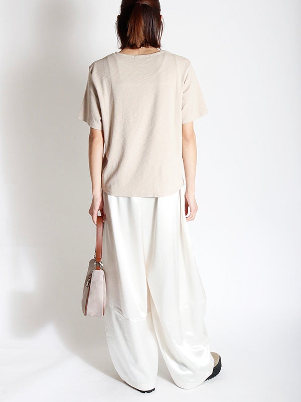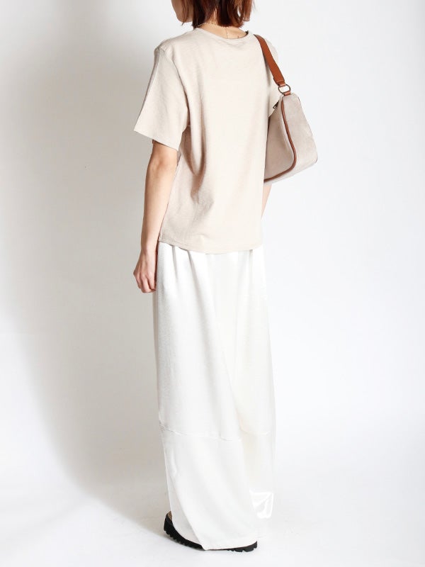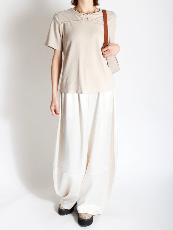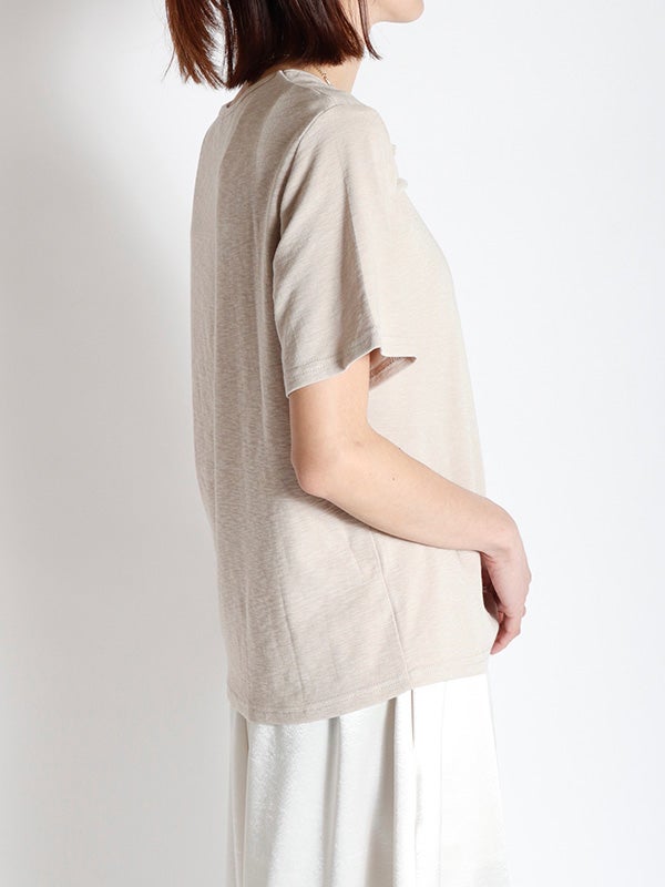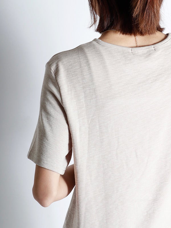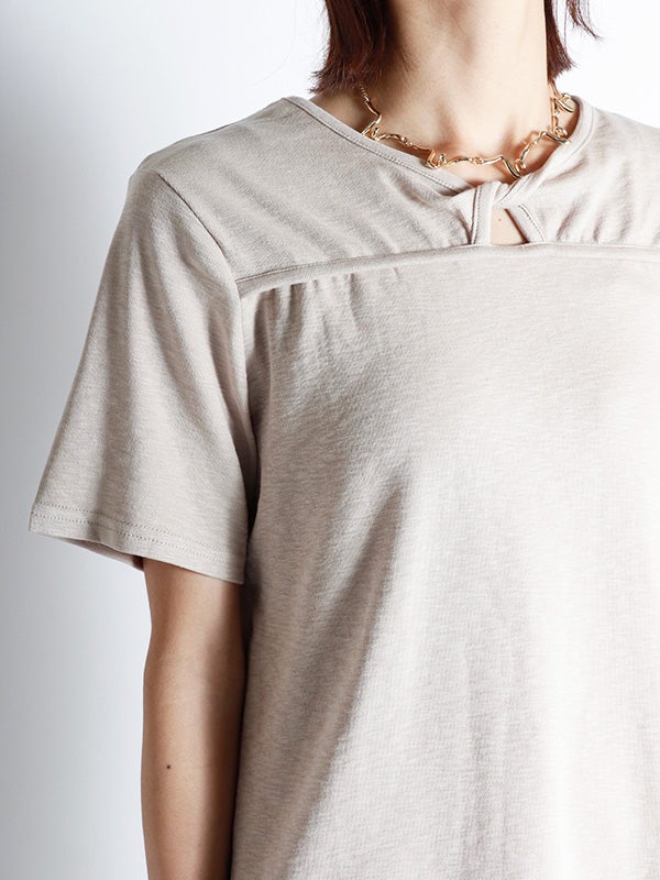 首元のディテールが目を惹くデザインTシャツ。デコルテを綺麗に見せる開きのあるネックラインが、ヘルシーな女性らしさを演出。体のラインを拾いすぎない、程よくゆとりのあるボックスシルエットです。イン・アウトどちらの着こなしもバランス良くまとまる絶妙な丈感で、ジャケットやカーディガン、キャミワンピースのインナーとしても対応可能なデザイン。ストレッチ性にも優れており、柔らかな肌馴染みでデイリーユースに最適のTシャツです。