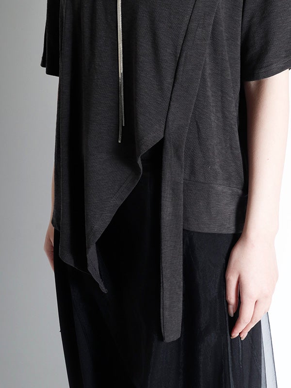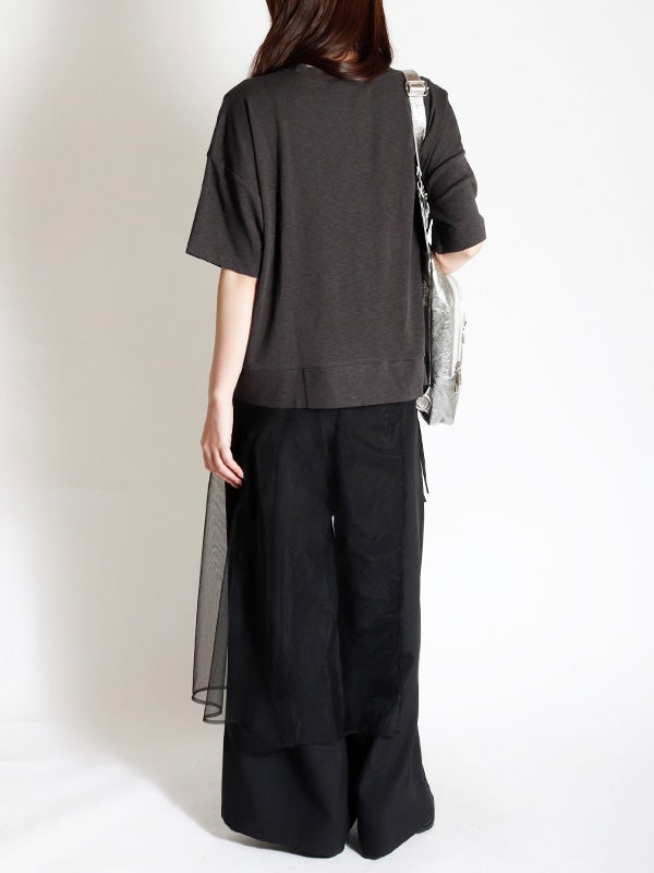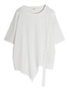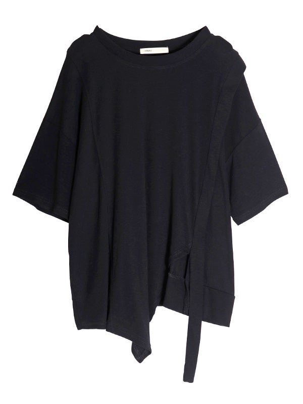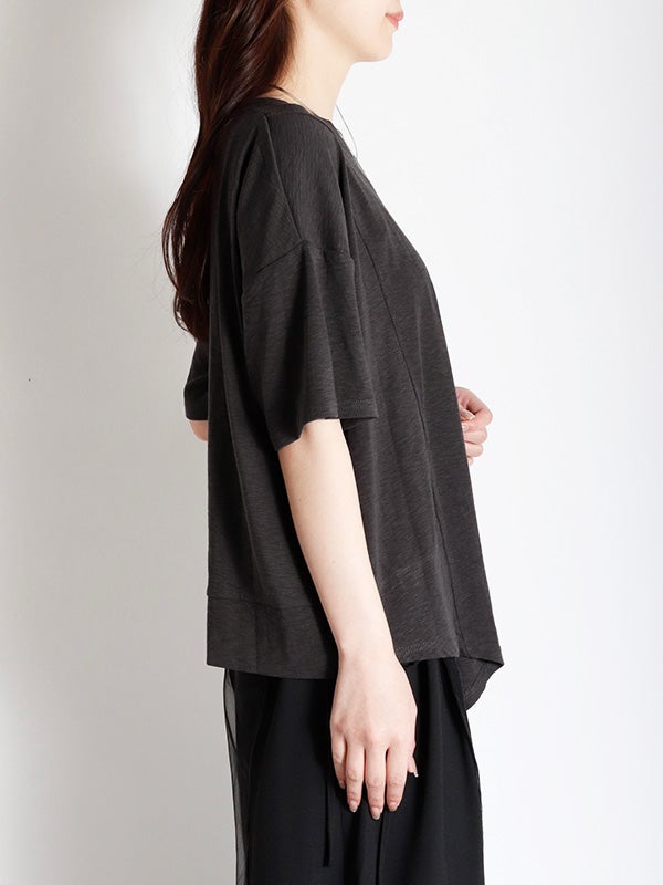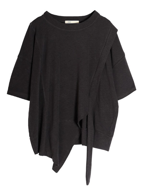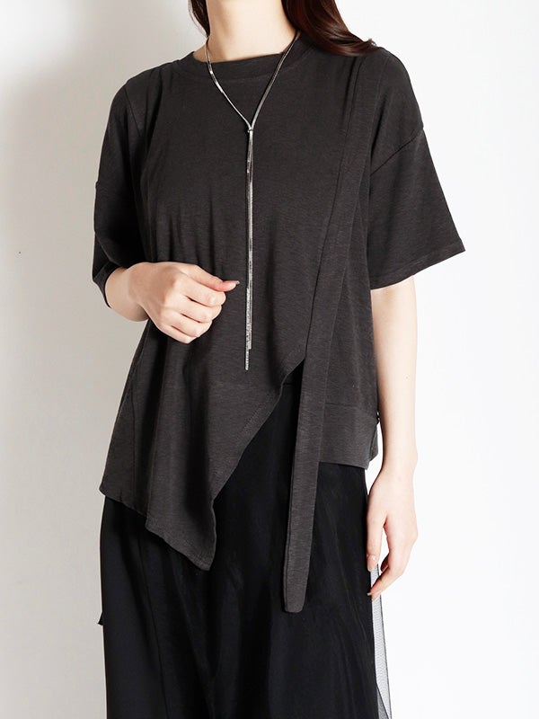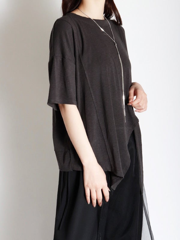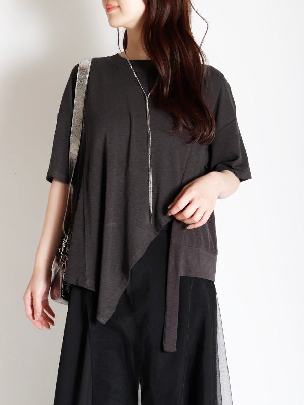 切り替えが目を引く、トレンド感溢れるアシンメトリーデザインのTシャツ。落ち着いた色合いで、遊び心がありながらも上品にまとまります。身体のラインを拾わないゆとりのあるシルエットで、肩のラインを落としたドロップショルダーが、女性らしいリラクシーな雰囲気に◎。1枚でさらりと纏うだけで、こなれた抜け感のあるスタイルが完成。軽やかで柔らかな肌当たりのポリエステル・コットン混紡素材を使用。デイリーに使いやすく、快適に過ごせる素材感です。