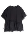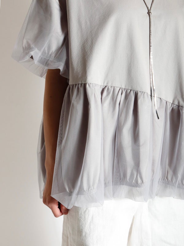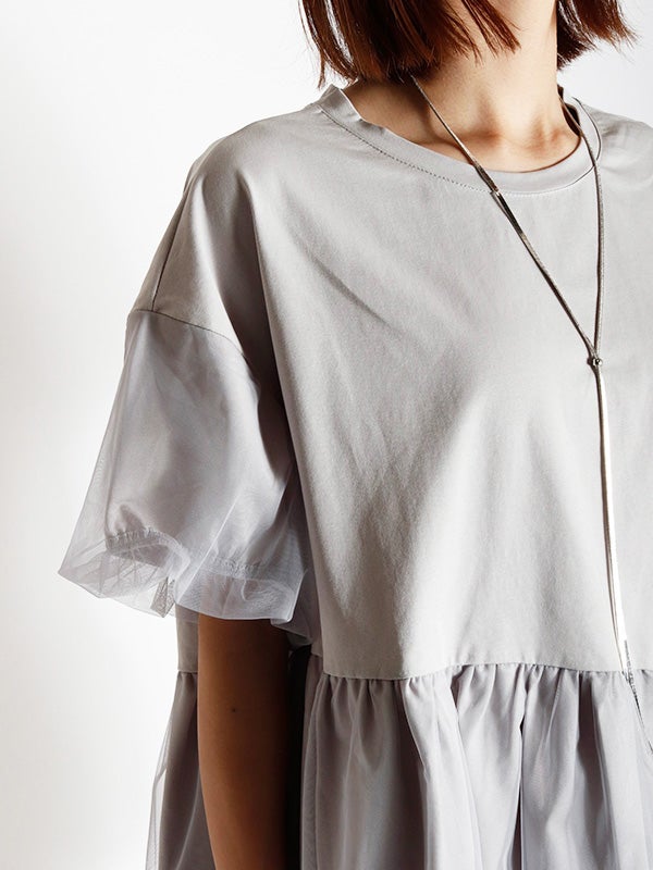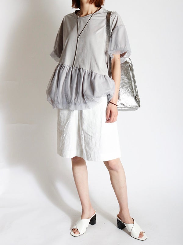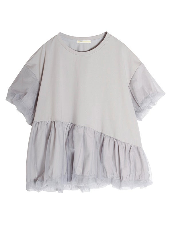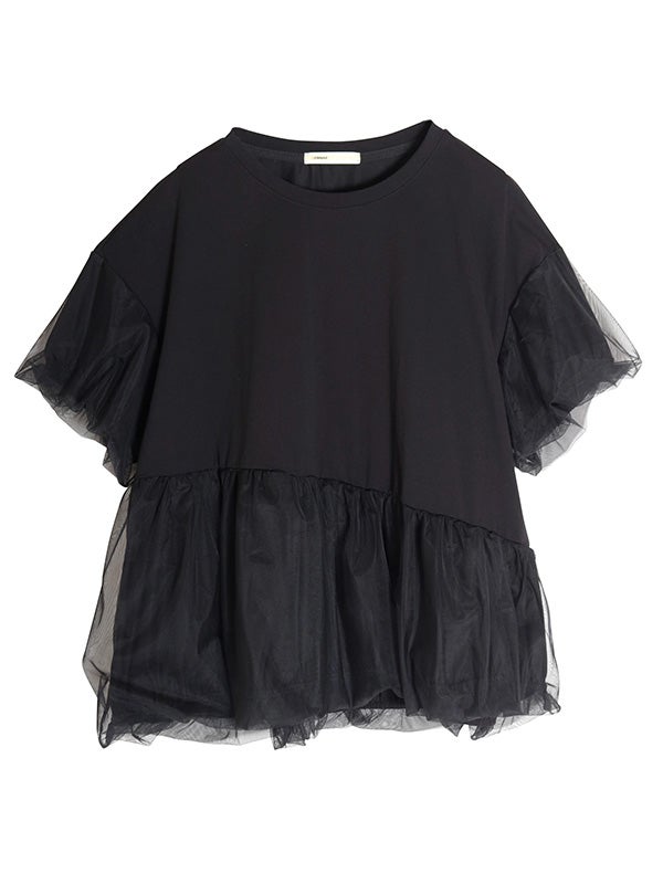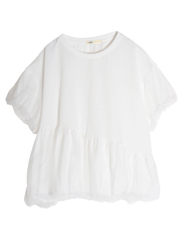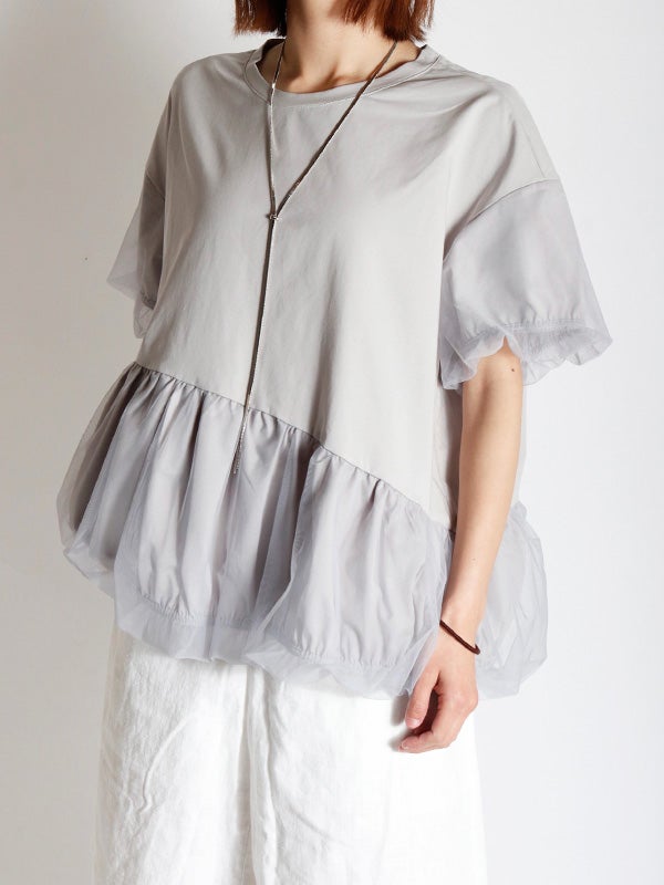 カジュアルな半袖Tシャツの上に、透け感のあるチュールをアシンメトリーに1周重ねたレイヤードTシャツ。繊細なチュールが魅力的でカジュアルすぎない異素材を組み合わせることで洗練された印象になります。チュールをバルーンシルエットにすることでフンワリ感をプラスしフェミニンな雰囲気に。幅広いボトムすに合わせやすく、トレンド感のあるカジュアルなスタイルが完成する1枚です。