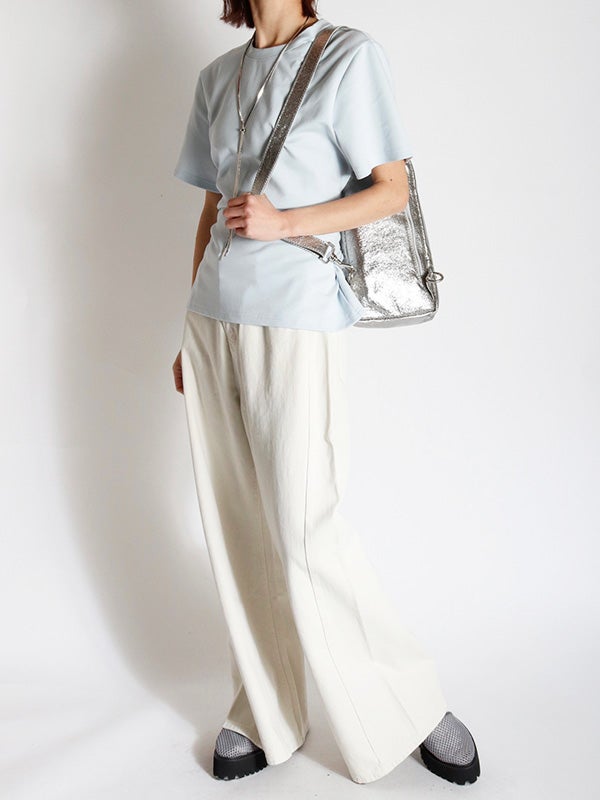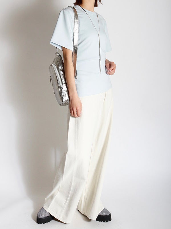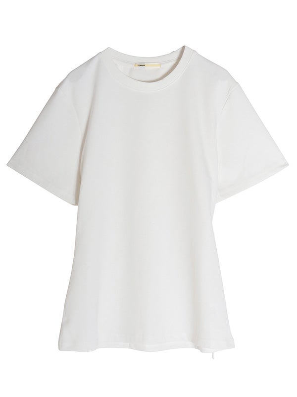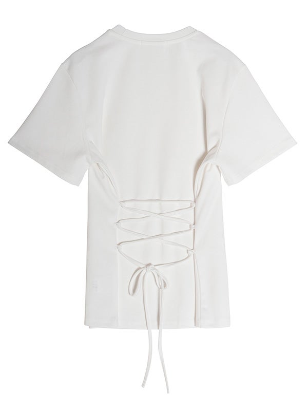 フロントのシンプルさとバックスタイルの大胆なギャップが魅力のデザインTシャツ。後ろ姿に大きくレースアップデザインを配することで、モードな表情に仕上げ、カジュアルなTシャツスタイルにセンシュアルな女性らしさをプラスしました。ウエスト周りをカバーする丈感で、リラクシーな着心地と美ラインを両立しています。フロントはプレーンなクルーネックなので、ネックレスなどのアクセサリーも映え、デイリーからイベントシーンまで幅広く活躍します。