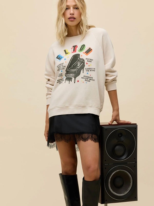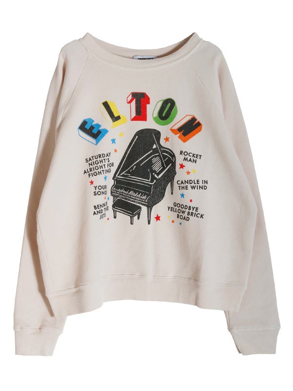 天才ピアノ奏者エルトン・ジョンを体現するにふさわしい、マルチカラーのエルトン・ジョン・ヴィンテージ・ラグラン・スウェットシャツ。スタイリッシュなショーマンシップと人を惹きつける個性の代名詞である、揺るぎない名声を体現しています。伝説のエルトン・ジョンの最も象徴的で永遠の名曲の数々が、ピアノのグラフィックを彩ります。ヴィンテージ・ラグラン・スウェットシャツは、クラシックなフィット感と程よいルーズ感を兼ね備えた、一年を通して着用できるミッドウェイト・フリース素材を使用。全体的にゆったりとしたサイズ感でパンツからスカートまでボトムスは選ばず着て頂けます◎