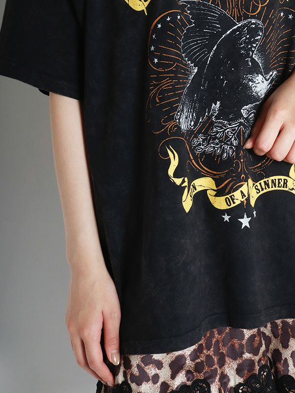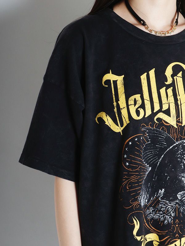 心温まるストーリーテリングで音楽シーンを席巻するカントリーラップ会のセンセーション、Jelly Roll/ジェリー・ロール。彼の代表曲「Song of a Sinner」がイーグルのグラフィックで描かれ、バックプリントには大きくアルバム名をプリント。DAYDREAMERならではの染色加工、ユーズド感のあるブラックカラー、程よく軽い素材でドレープが出る質感と、ルーズな抜け感が出るように柔らかな肌触りで独特の風合いに仕上げたTシャツです。