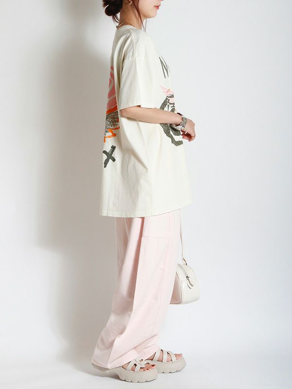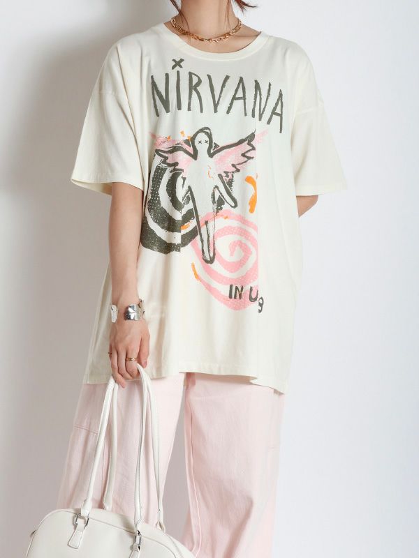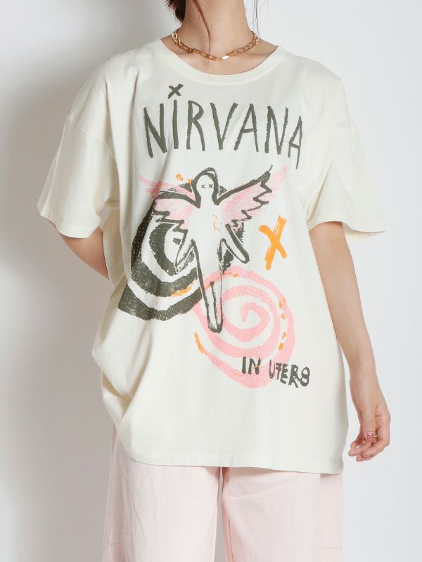 1993年に発売されたNIRVANA/ニルヴァーナのスタジオ・アルバム『IN UTERO/イン・ユーテロ』のジャケットに使われているアート画が、落書きのようにラフに描かれたグラフィックをプリント。ロゴには発砲プリントを施しさり気ないアクセントを添えた仕上がりです。大胆なプリントを施したバックスタイルもオシャレにキマります。スカートでもパンツでも着まわせるアイテム。ルーズな抜け感が出るように、柔らかなコットン100%の肌触りで独特の風合いに仕上げたTシャツです。