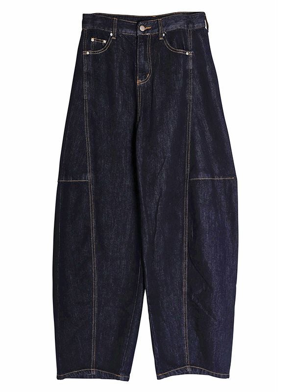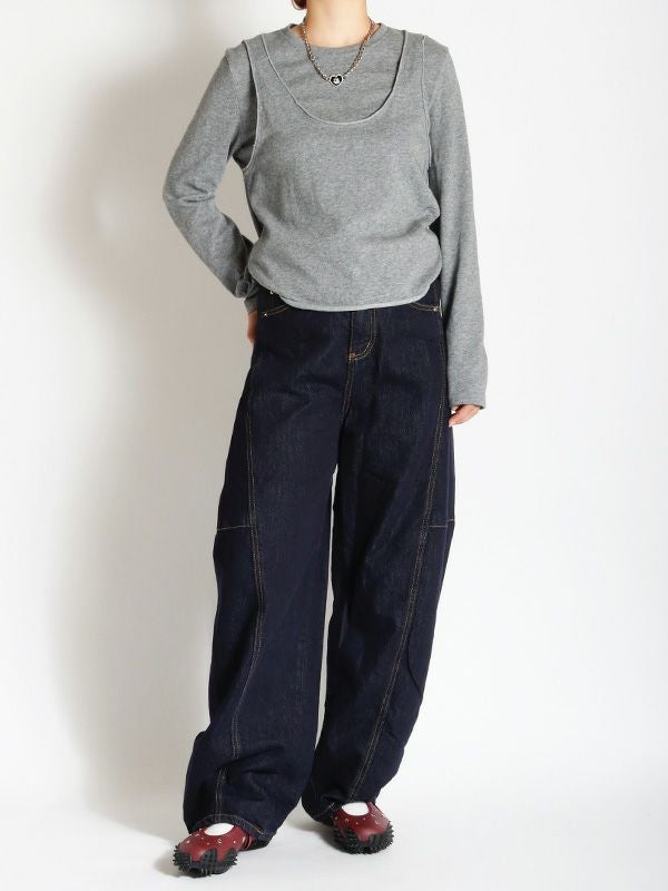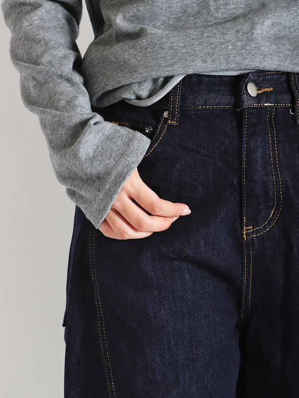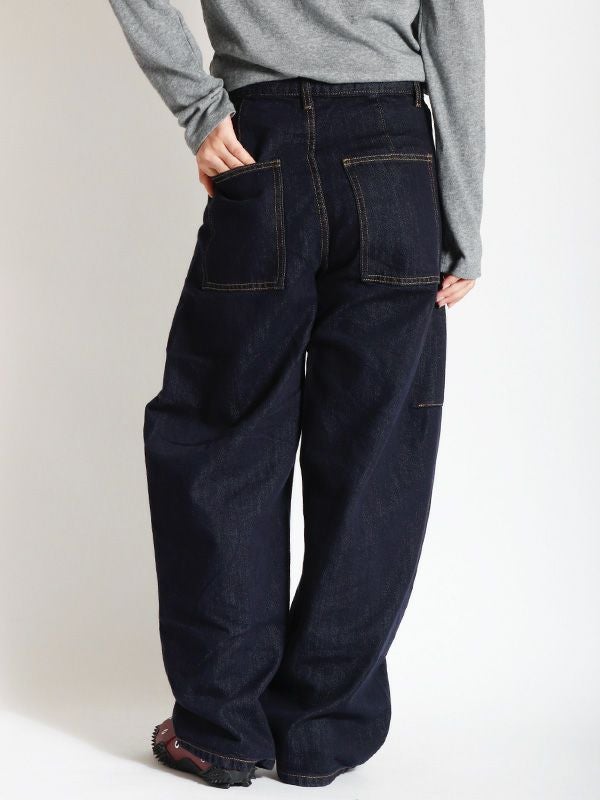 絶妙な太さできれいな落ち感が魅力のバルーンデニム。ボリュームのある立体的なカーブを描いたシルエットでダボっとした雰囲気は残しつつも、サイドに入れた切り替えによってこなれ感を演出してくれます。ひと味違った雰囲気で着用することができるデニムパンツ。