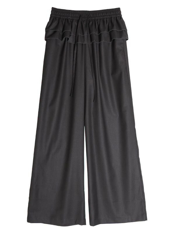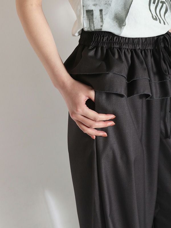 ウエスト周りにフリルを施したリラクシーな穿き心地のストレートシルエットのパンツ。スーチング素材でメンズライクな雰囲気がありながらも、パンツを穿きながらフェミニンテイストを装える「良いとこ取り」のデザイン。カットソーやTシャツと合わせても好相性です。ボディラインを拾わないシルエットと立体感。フリルのもたらすメリハリ効果で体型カバー力も期待できます。甘さを抑えたグレーとブラックの2色展開です。