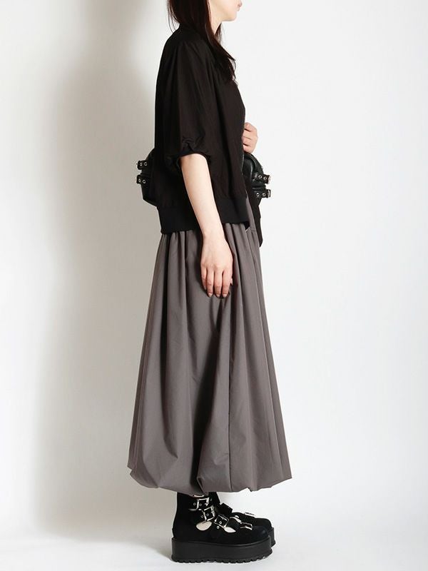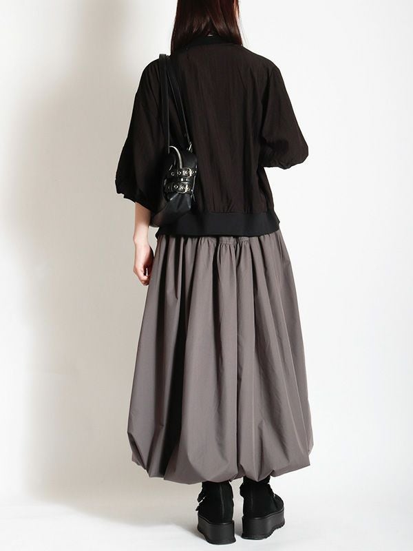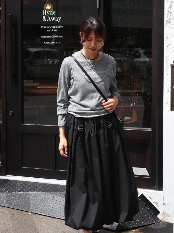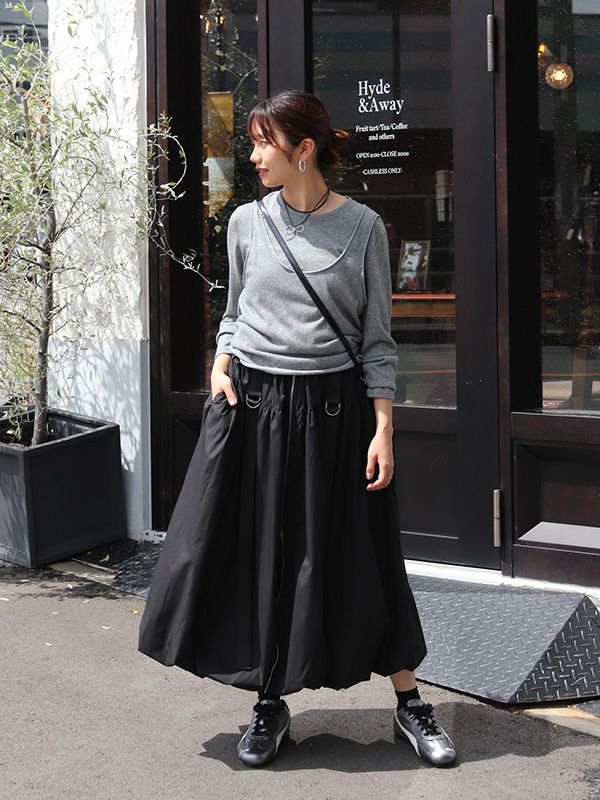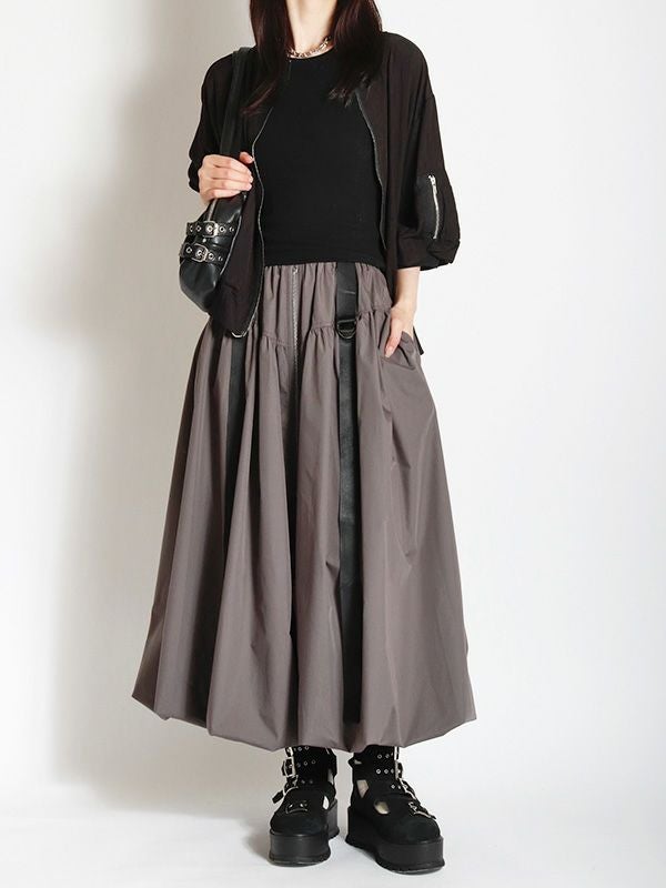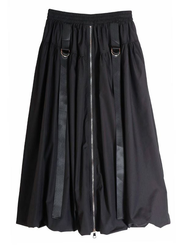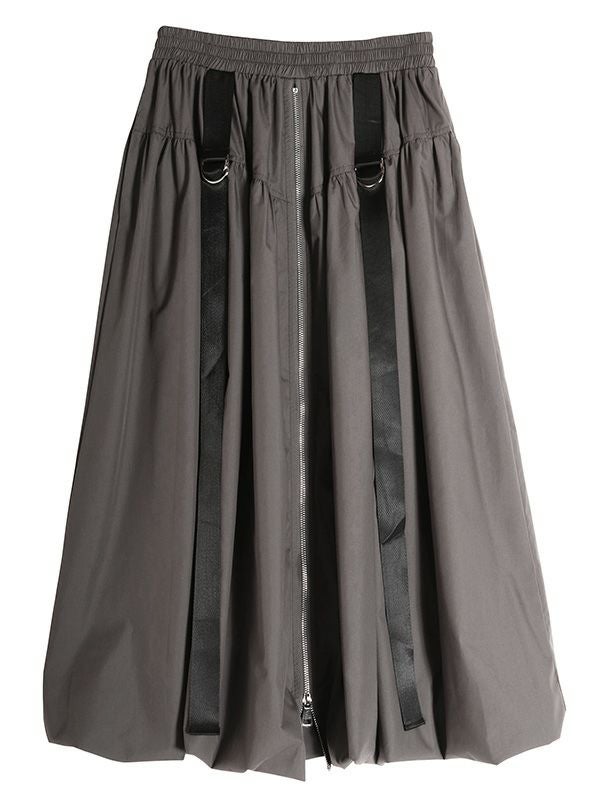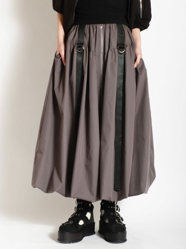 トレンドのバルーンシルエットのロングスカート。 目を引くフロントジップとサイドのベルトデザインがスタイリングのアクセントとなり、着こなしにエッジをプラス。 ふわっとした立体的なバルーンシルエットも個性的な着こなしを叶えてくれます。トップスINか短丈のトップスを合わせて、バルーンシルエットの個性を最大限に引き出したメリハリのあるスタイルがおすすめ。足元はスニーカーでカジュアルに、ブーツで秋らしい重厚感をプラスするなど、幅広いアイテムと好相性です。
