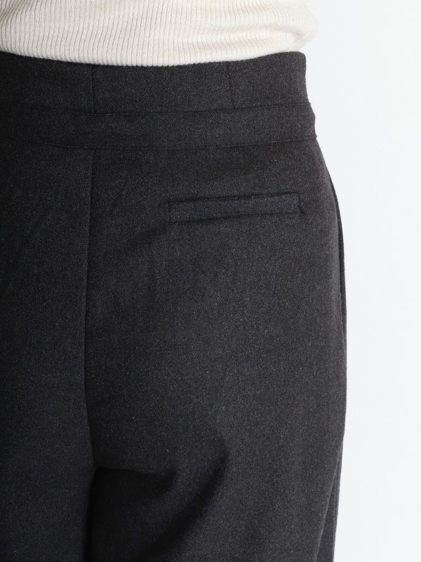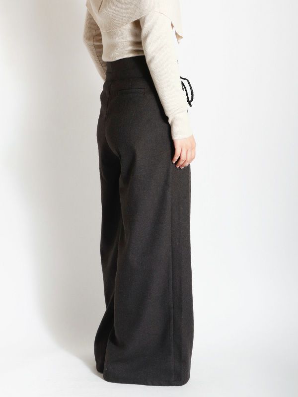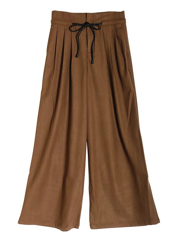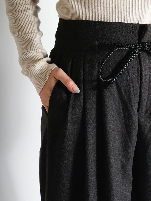 上品な雰囲気を漂わせるワイドパンツ。サイドにトリプルタックを入れ、立体的な腰回りを構成し、裾に向けて広がるワイドシルエットです。対してウエストはフィットさせ、特徴的なストリングデザインをアクセントにすることでウエスト調整が可能になりメリハリあるラインを演出できます。ブラウスやニットと合わせれば、デザインの上品さが加わり、ワンランク上のカジュアルスタイルが完成します。足元にはスニーカーはもちろん、ヒールやブーツと合わせることで、女性らしいバランスの取れた着こなしが楽しめるワイドパンツです。