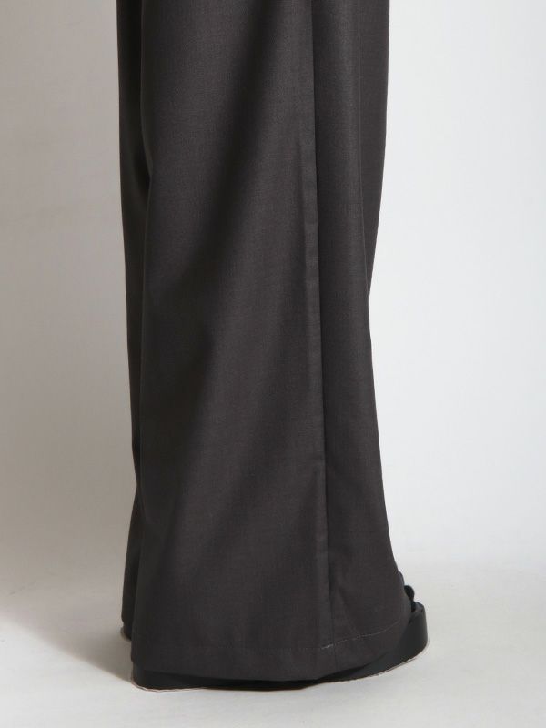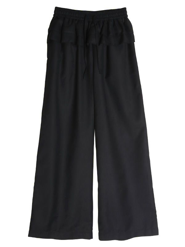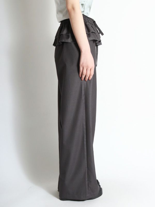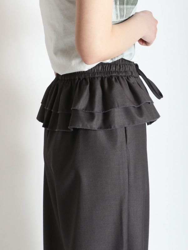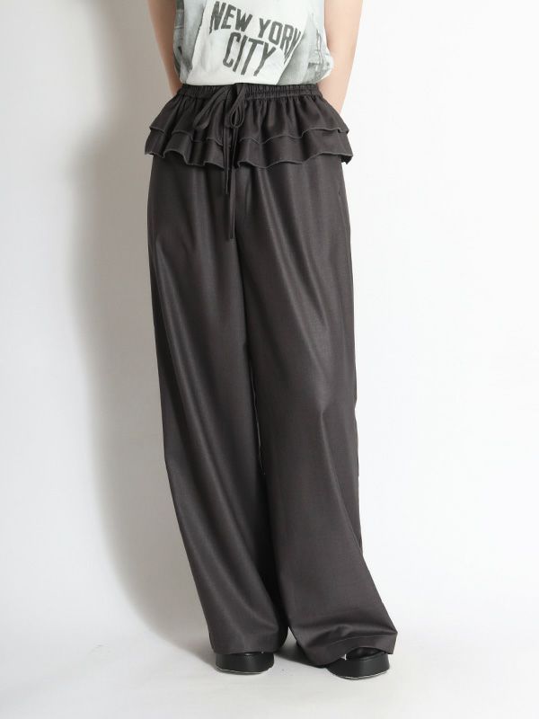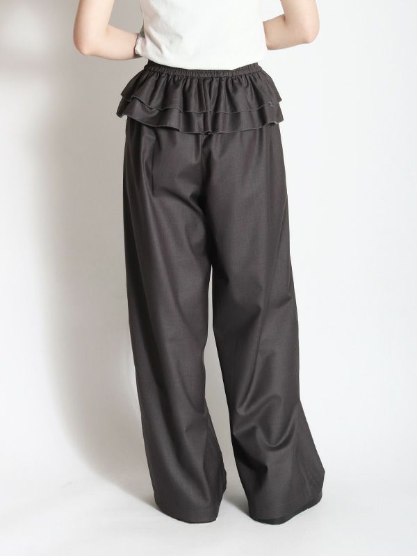 ウエスト周りにフリルを施したリラクシーな穿き心地のストレートシルエットのパンツ。スーチング素材でメンズライクな雰囲気がありながらも、パンツを穿きながらフェミニンテイストを装える「良いとこ取り」のデザイン。カットソーやTシャツと合わせても好相性です。ボディラインを拾わないシルエットと立体感。フリルのもたらすメリハリ効果で体型カバー力も期待できます。甘さを抑えたグレーとブラックの2色展開です。