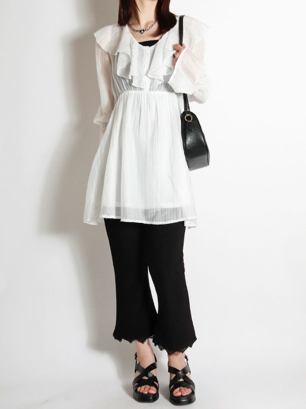 フレアシルエットのカプリパンツが登場。リラックスした穿き心地が魅力です。裾部分にレースを施すことで、フェミニンな要素をプラスしながら、美脚シルエットもキープ。ストレッチの効いた生地で程よく体にフィットするサイズ感。快適な穿き心地を実現し、ロングシャツやミニスカートとのレイヤードにも対応する、機能性とデザイン性を兼ね備えたアイテムです。